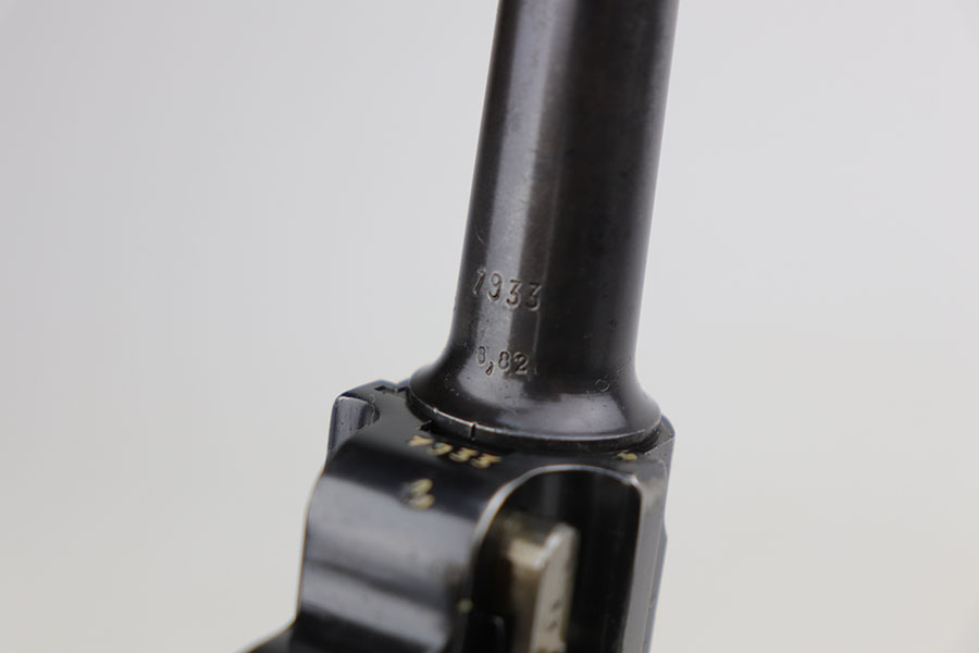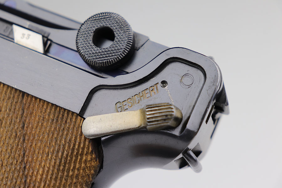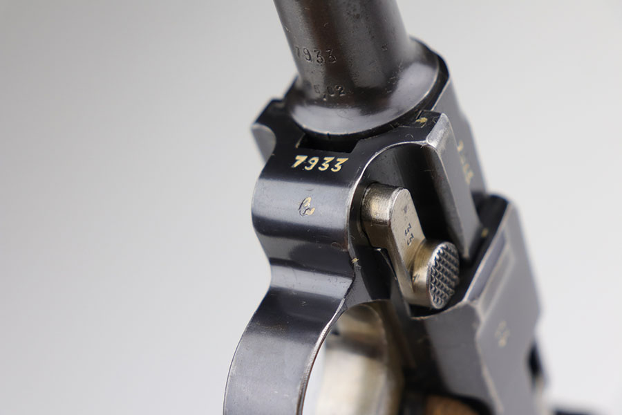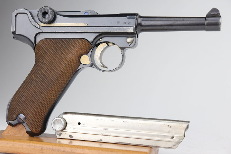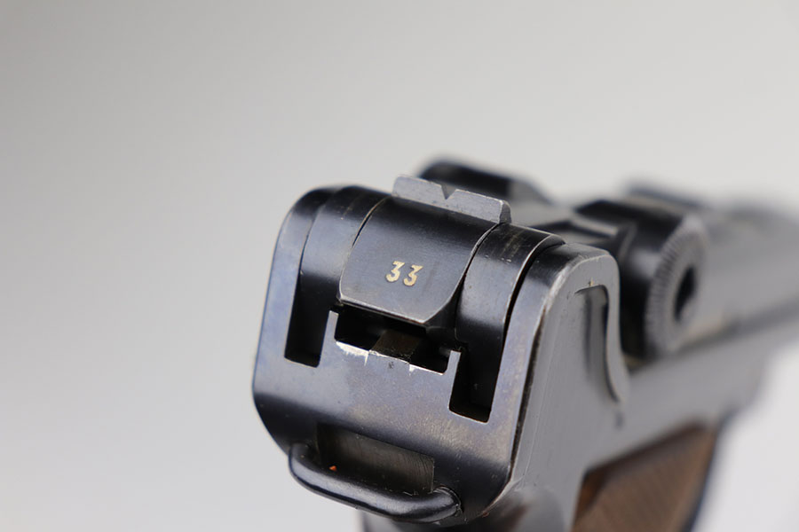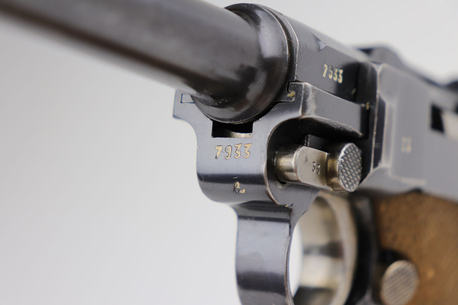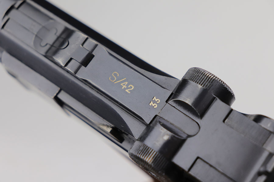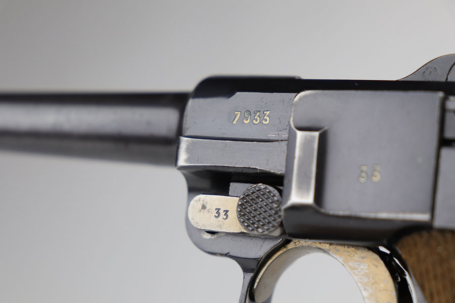 1/19/21 – This is an excellent Nazi Mauser Luger from 1935, when the Germans were still trying to hide military firearm production and using letter codes rather than dates. The gun has all matching numbered parts, with unmarked grips and period original but mismatched magazine. It has about 96% of the original blue, just standard high edge wear on sideplate, muzzle, trigger guard and bottom of front strap. Minty bore. The grips are in excellent condition aside from the common safety chip on the left panel.