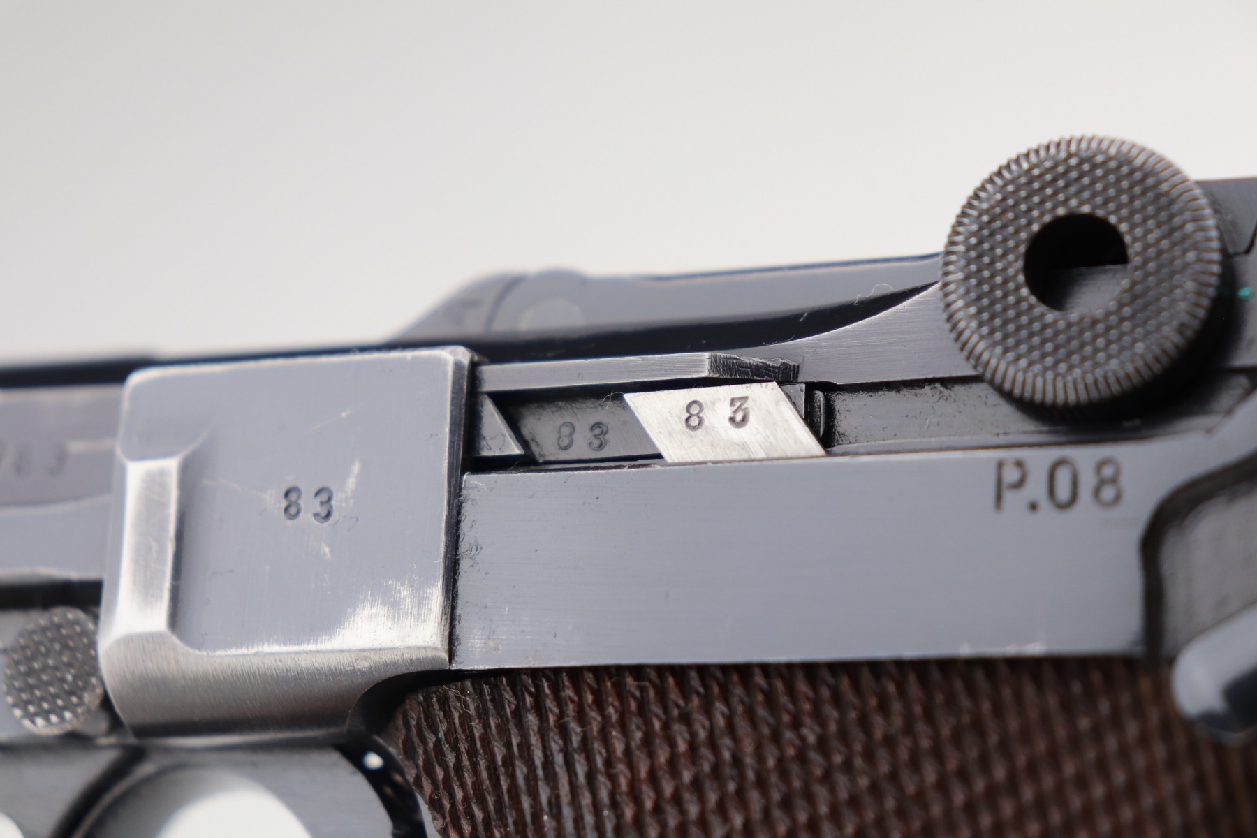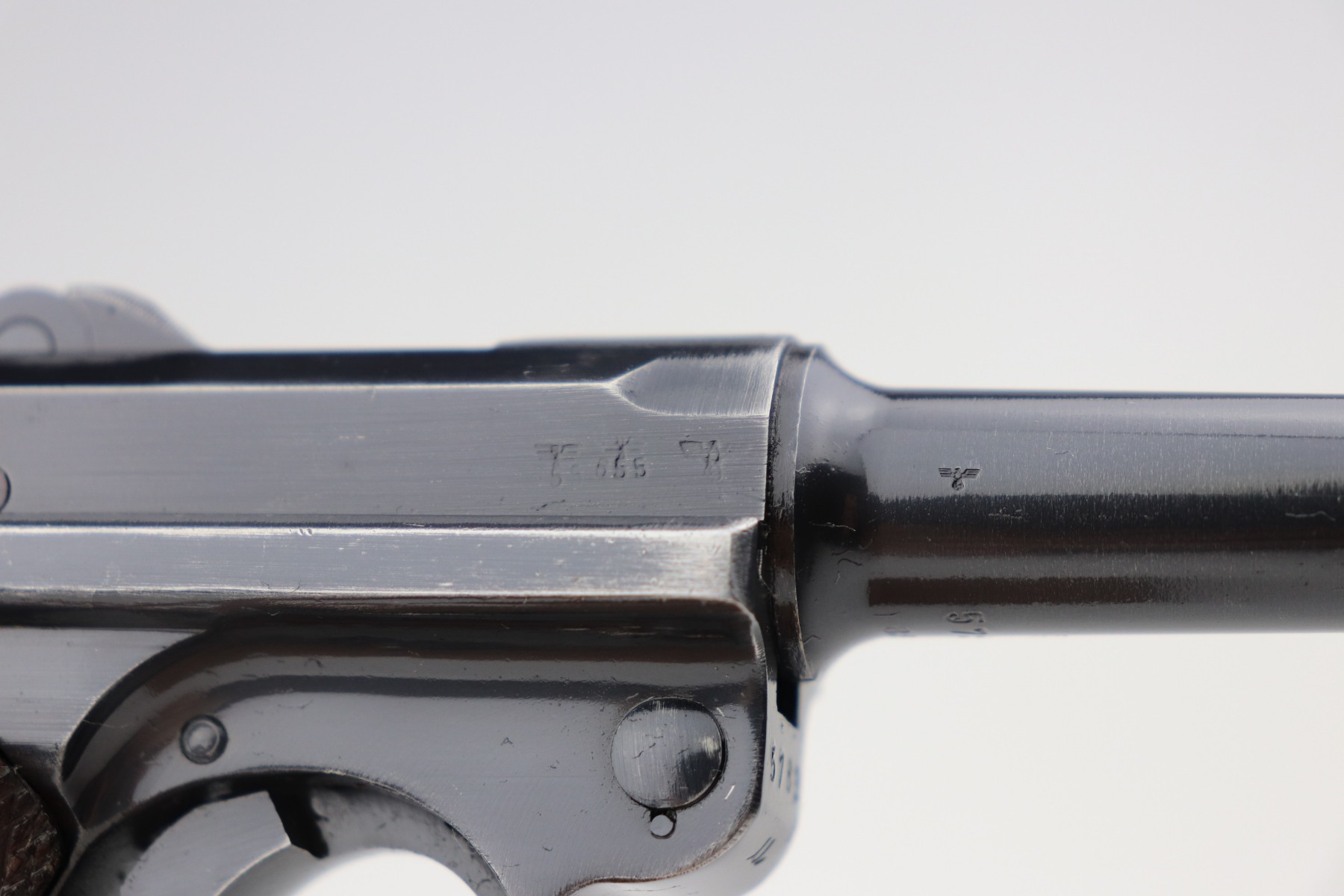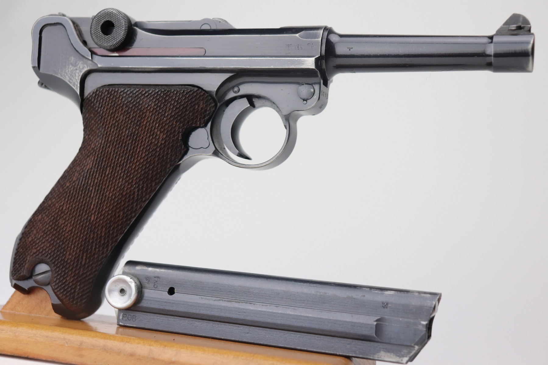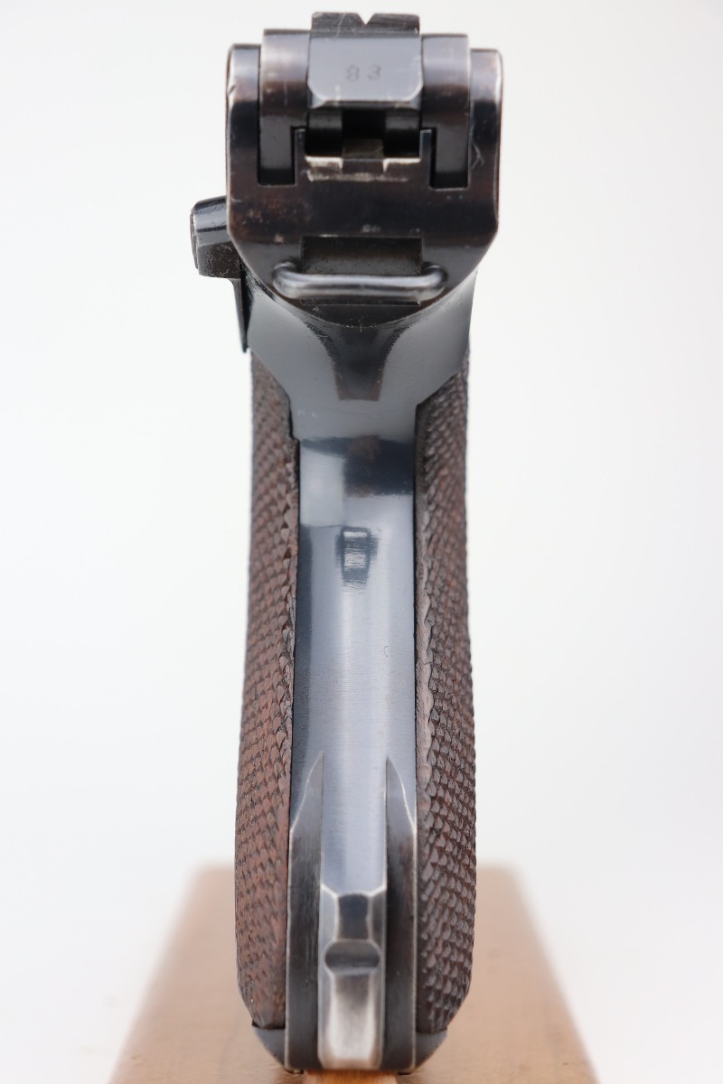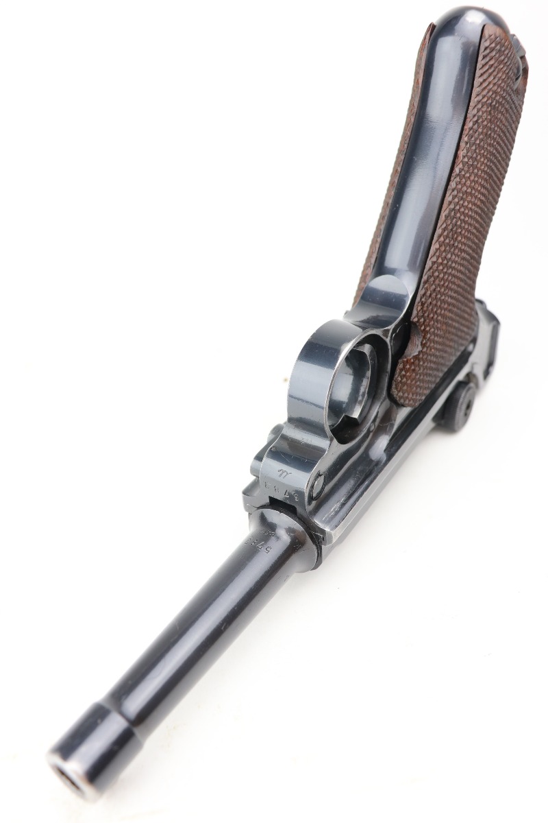 2/17/21 – This is an excellent example of a Mauser Luger P.08 issued to the Nazi military in 1941. This one is all matching and has the proper “Eagle 655” military proofs. It comes with a matching magazine. The “8” on the bottom of the magazine looks like it was double-stamped. The gun has retained about 94-95% of its original finish. There are areas of minor wear at the base of the front strap, on the side plate, around the muzzle, on the barrel, and high edges of the frame. Comes with original matching grips. The bore has great rifling but there is freckling throughout.