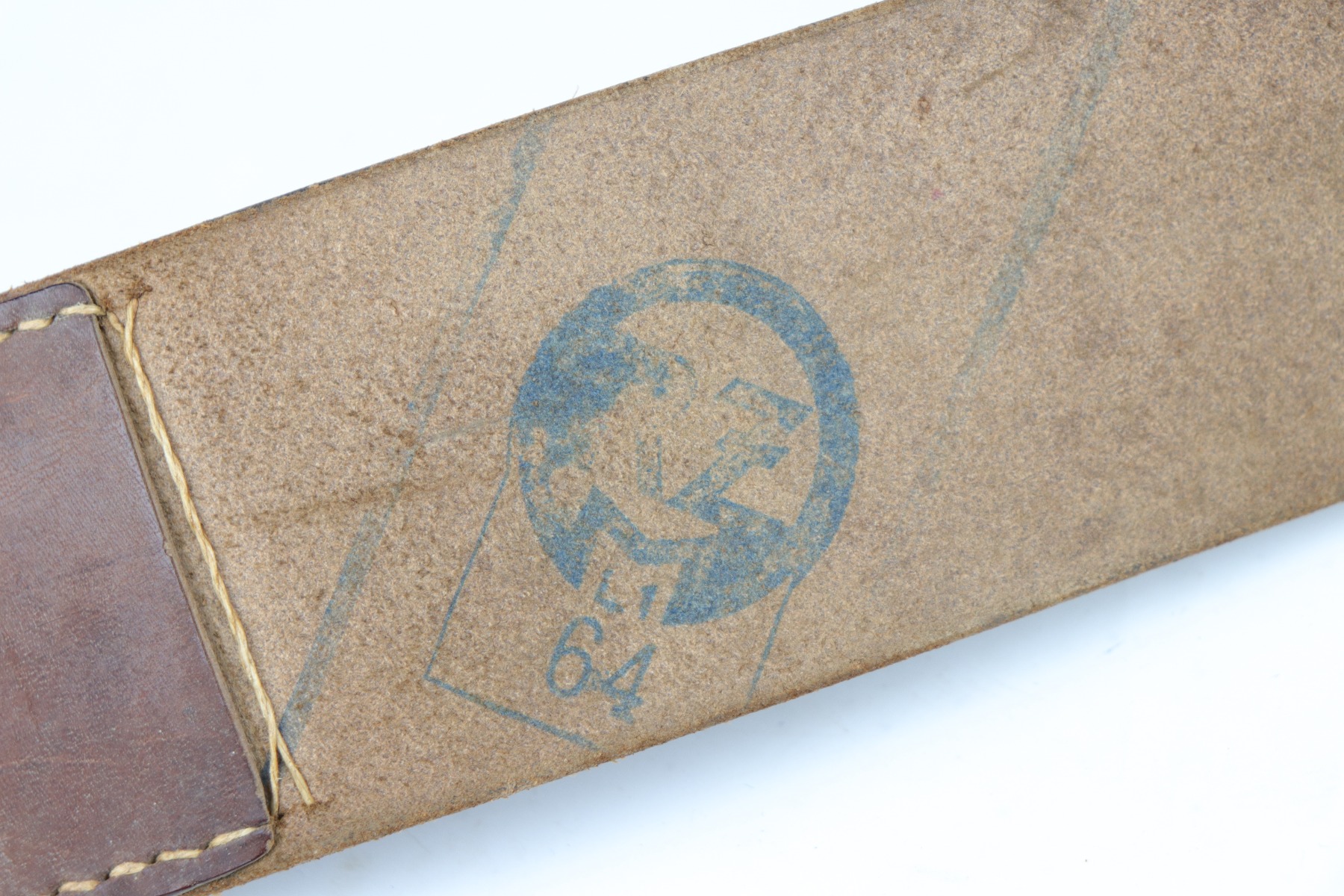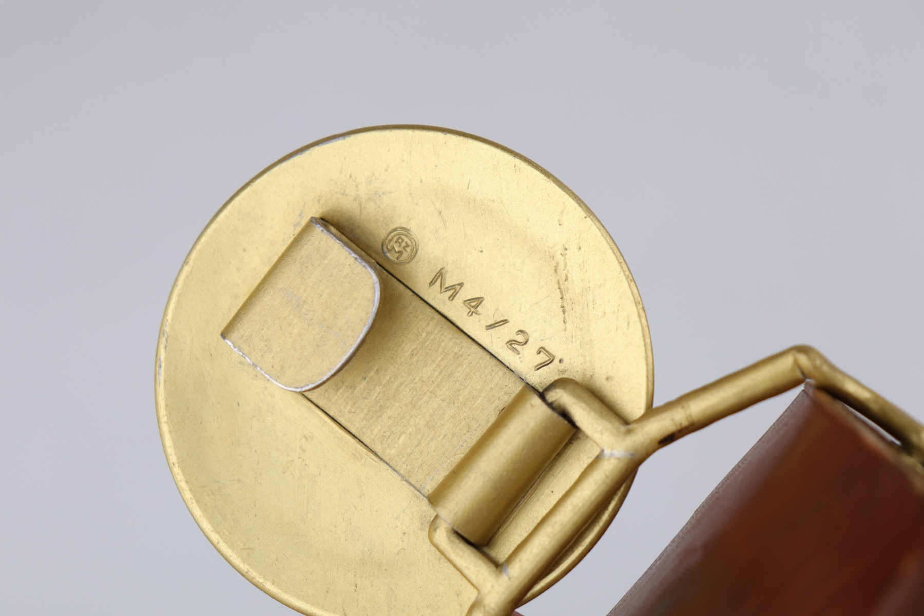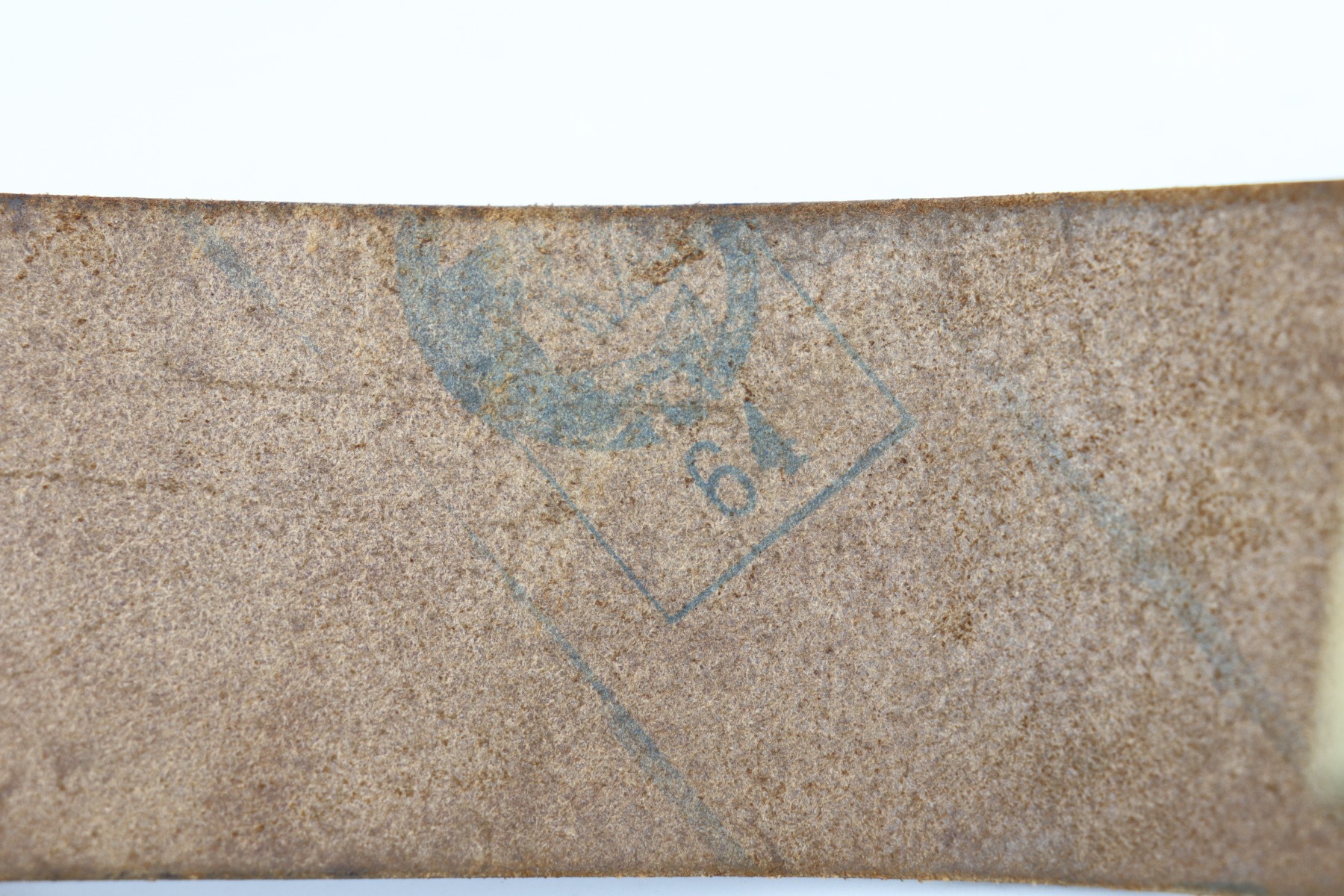 5/11/20 – This is an all original Party Leader leather belt with the gold finish Party Leader buckle. The reverse of the buckle has the RZM logo for Reichs Purchasing Department along with the numbers M4 / 27. The inside of the belt has two RZM ink stamps. It also has a “150” ink stamp. The belt and buckle are in excellent condition. There are just a few very light scuffs here and there. There is one area of scratching on the inside of the belt near the center.