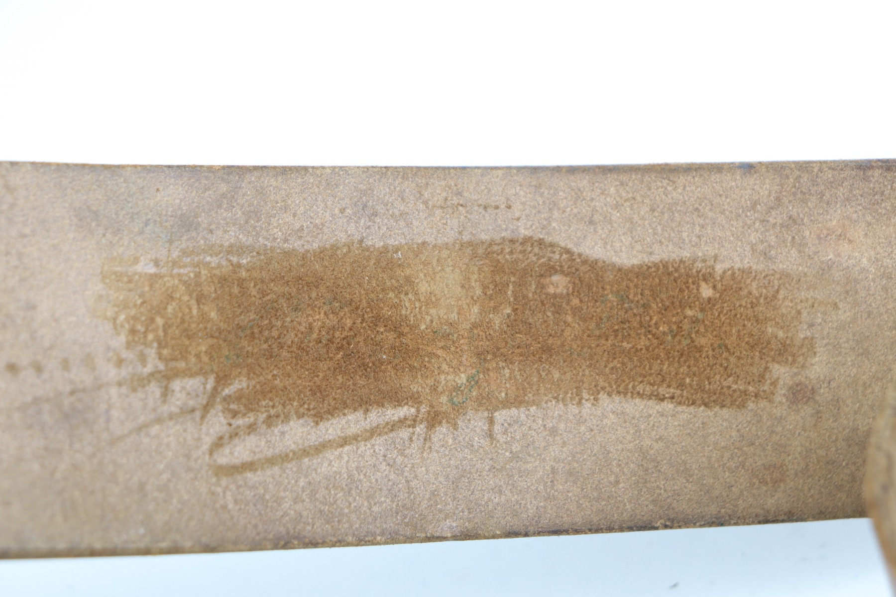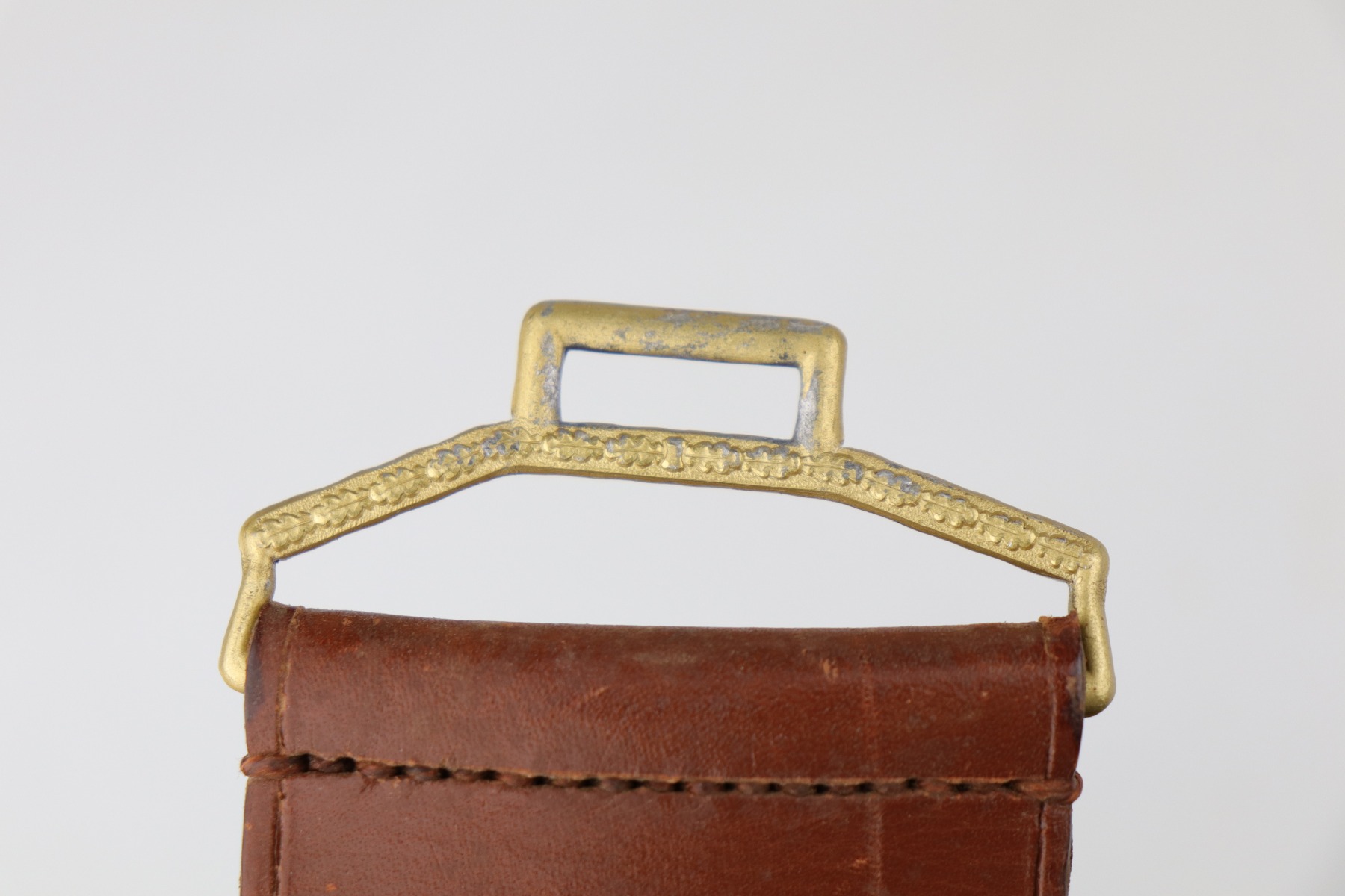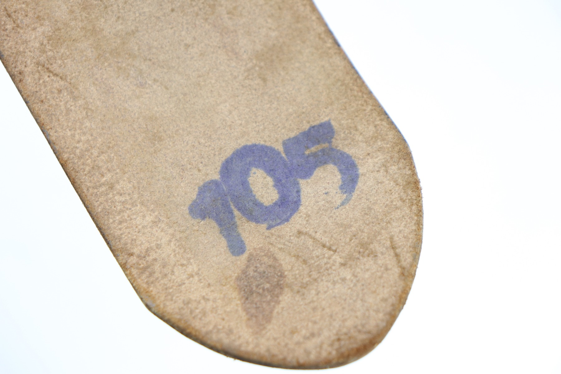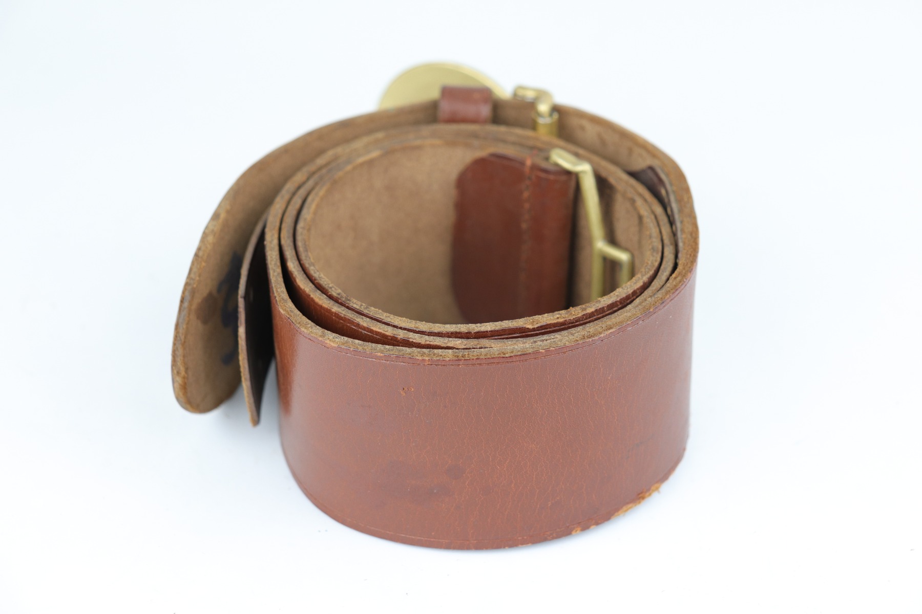 5/11/20 – This is an all original Party Leader leather belt with the gold finish Party Leader buckle. The reverse of the buckle has the RZM logo for Reichs Purchasing Department along with the numbers M4 / 27. The inside of the belt has two RZM ink stamps. It also has a “150” ink stamp. The belt and buckle are in excellent condition. There are just a few very light scuffs here and there. There is one area of scratching on the inside of the belt near the center.