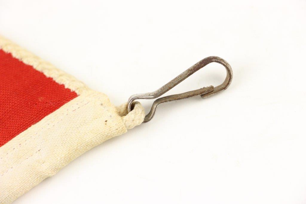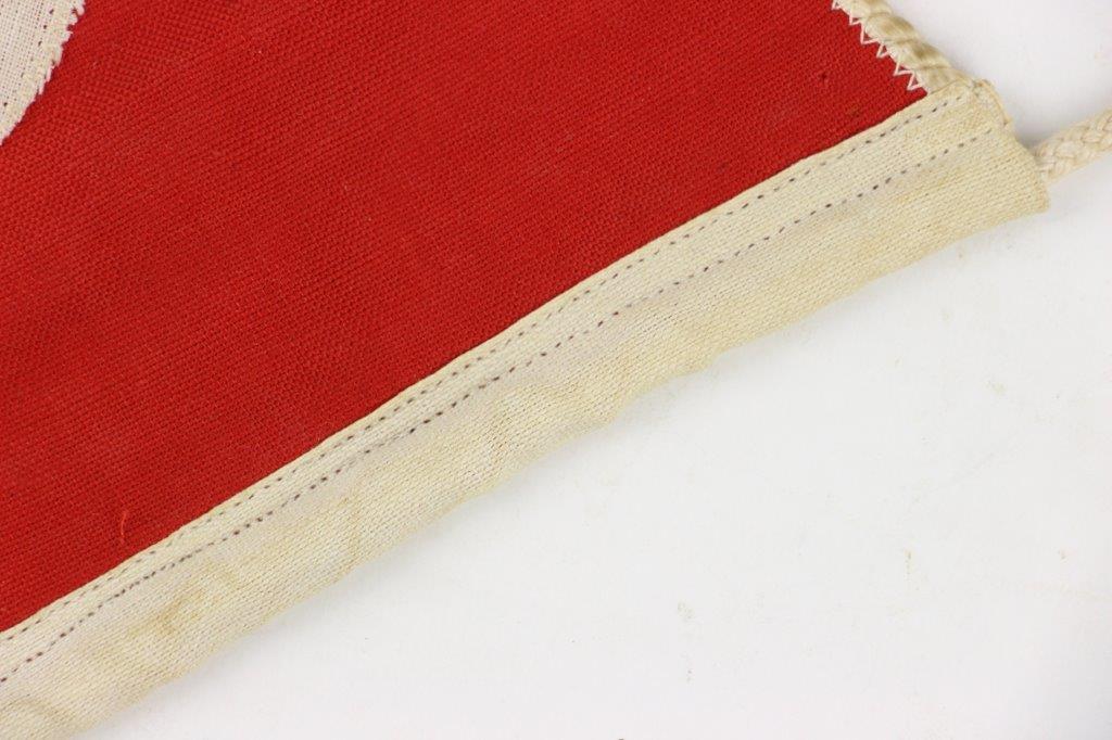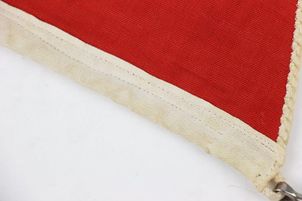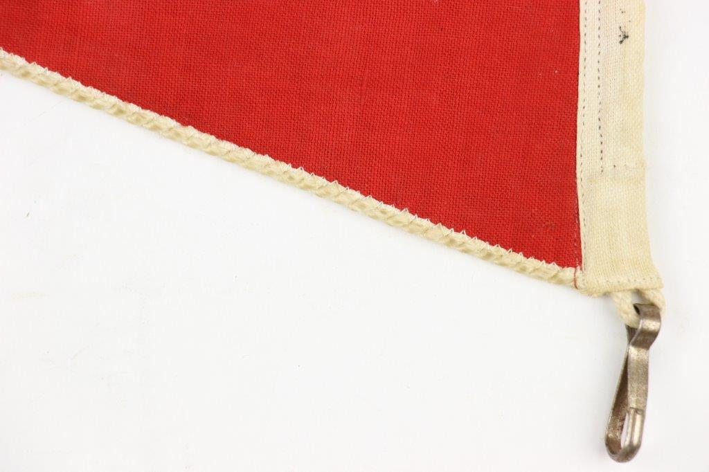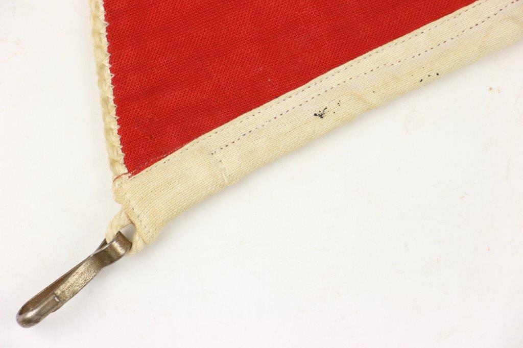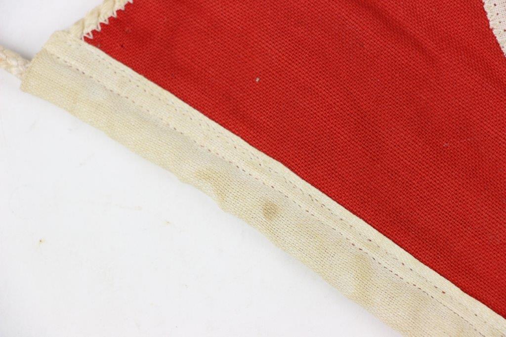 8/17/24 – This is an excellent condition WW2 German Double-Sided Pennant Flag. Each side of the flag features a black thread embroidered swastika centralized on a sewn-on white circular background. Excellent, tight, and original stitching throughout. The red linen cloth base is vibrant and stain free with minimal surface age and no notable issues. The flag is bordered with a white twisted chord border that’s sewn along the edge. The hoist shows mild surface age with an original hanging rope attached. Original clip on one end that’s intact and functional with light speckling patina. Measures about 30cm long and 20cm wide.