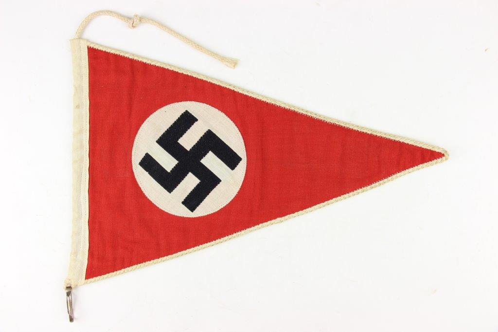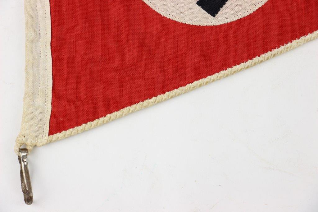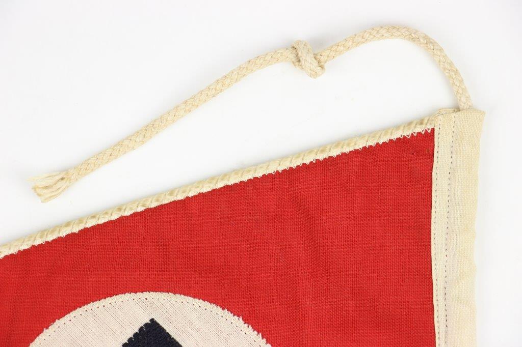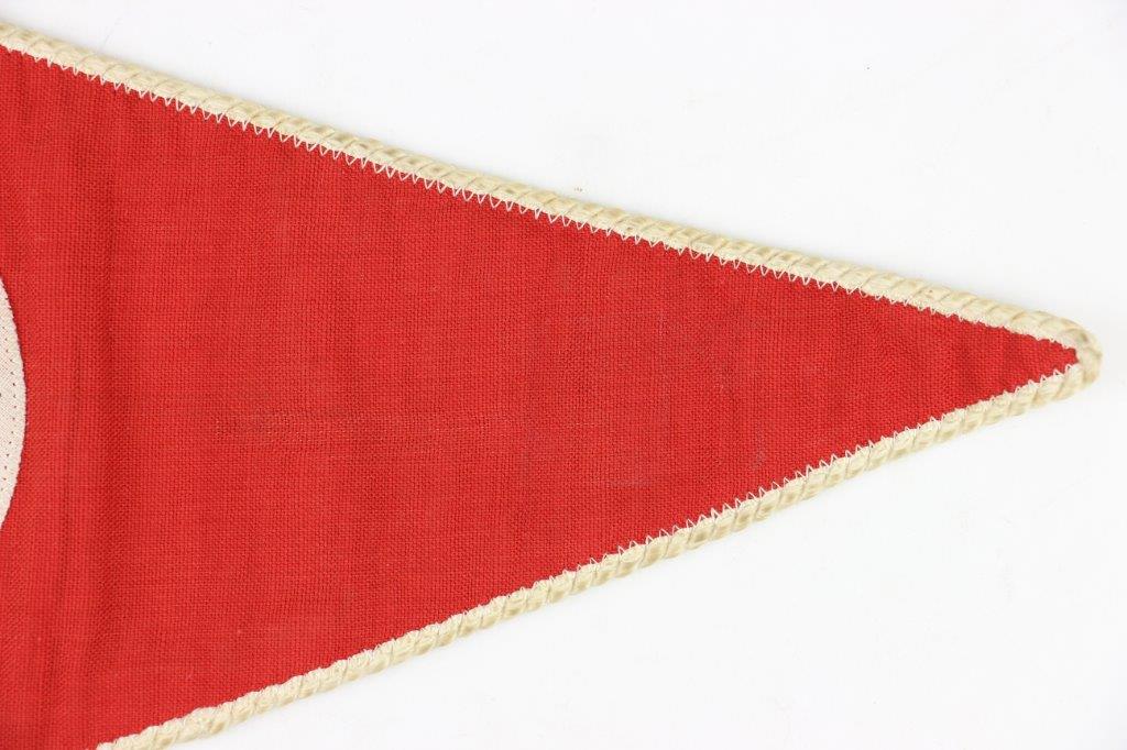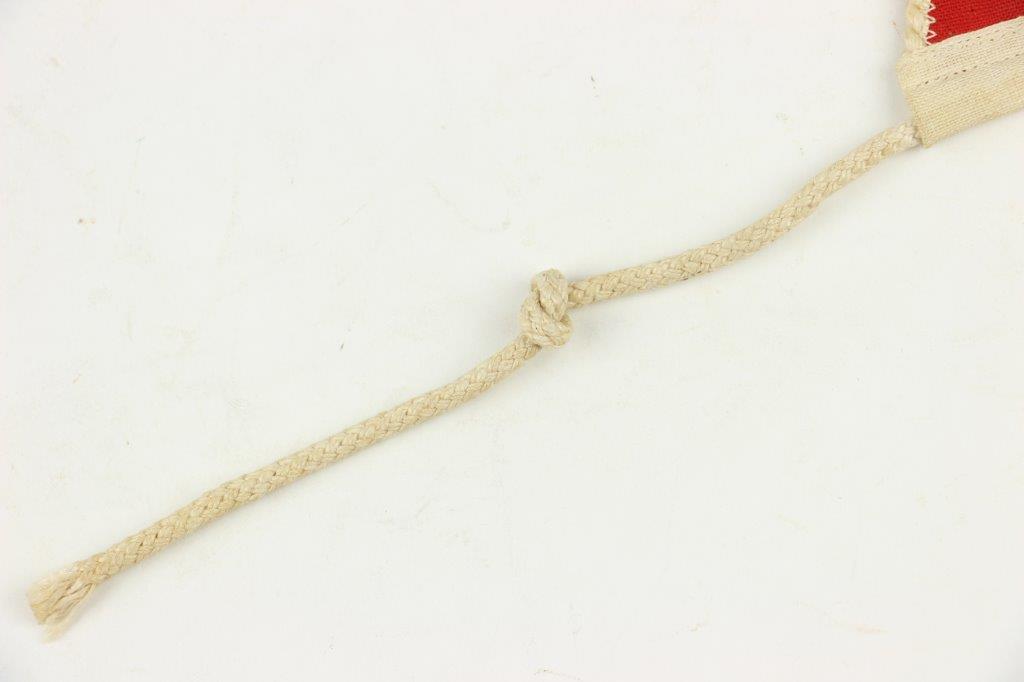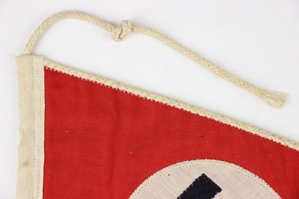 8/17/24 – This is an excellent condition WW2 German Double-Sided Pennant Flag. Each side of the flag features a black thread embroidered swastika centralized on a sewn-on white circular background. Excellent, tight, and original stitching throughout. The red linen cloth base is vibrant and stain free with minimal surface age and no notable issues. The flag is bordered with a white twisted chord border that’s sewn along the edge. The hoist shows mild surface age with an original hanging rope attached. Original clip on one end that’s intact and functional with light speckling patina. Measures about 30cm long and 20cm wide.
