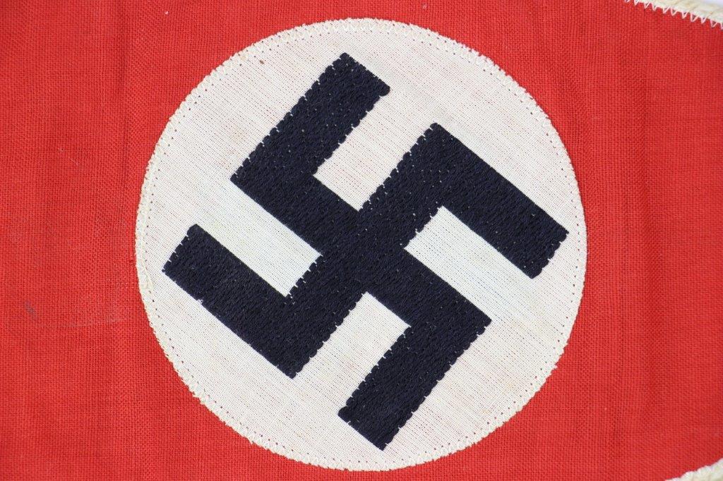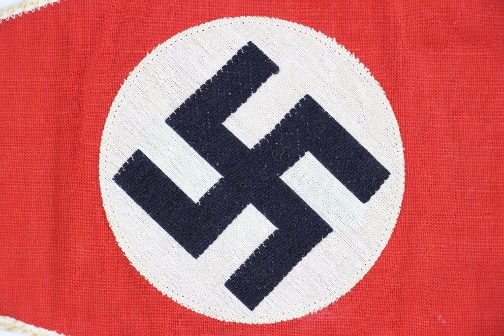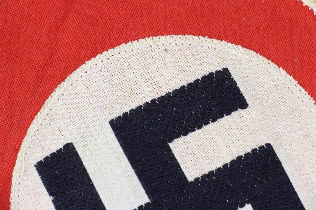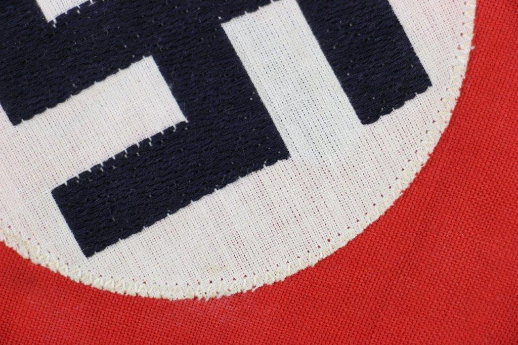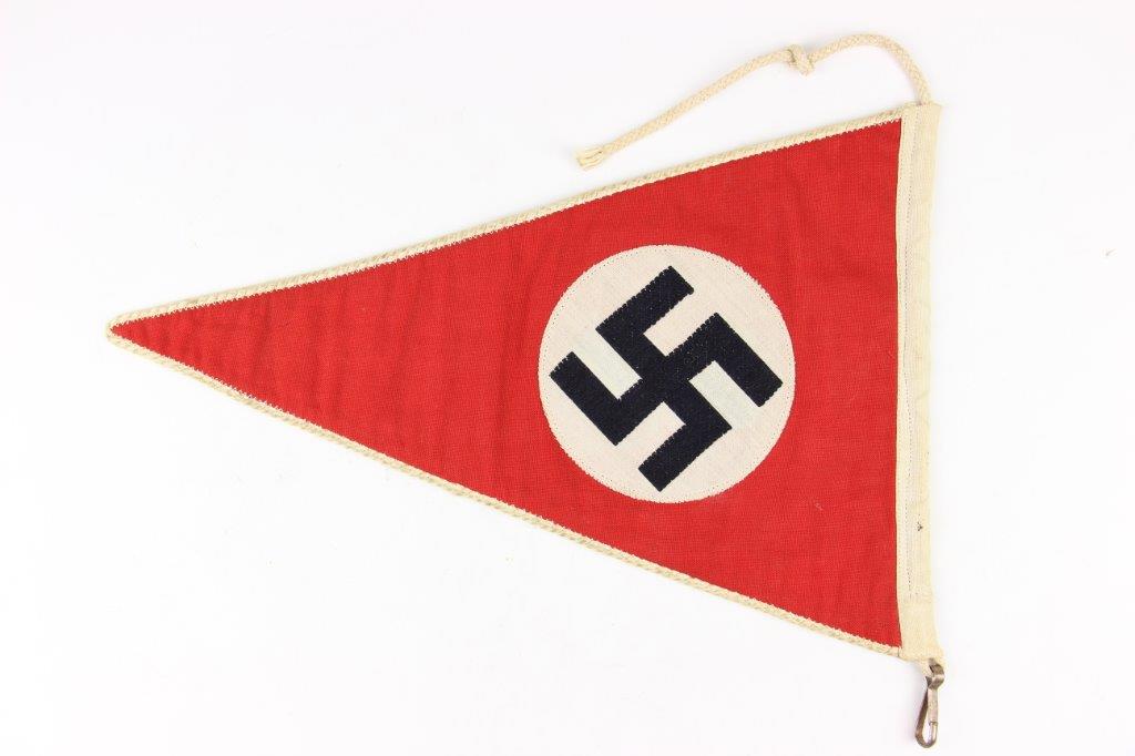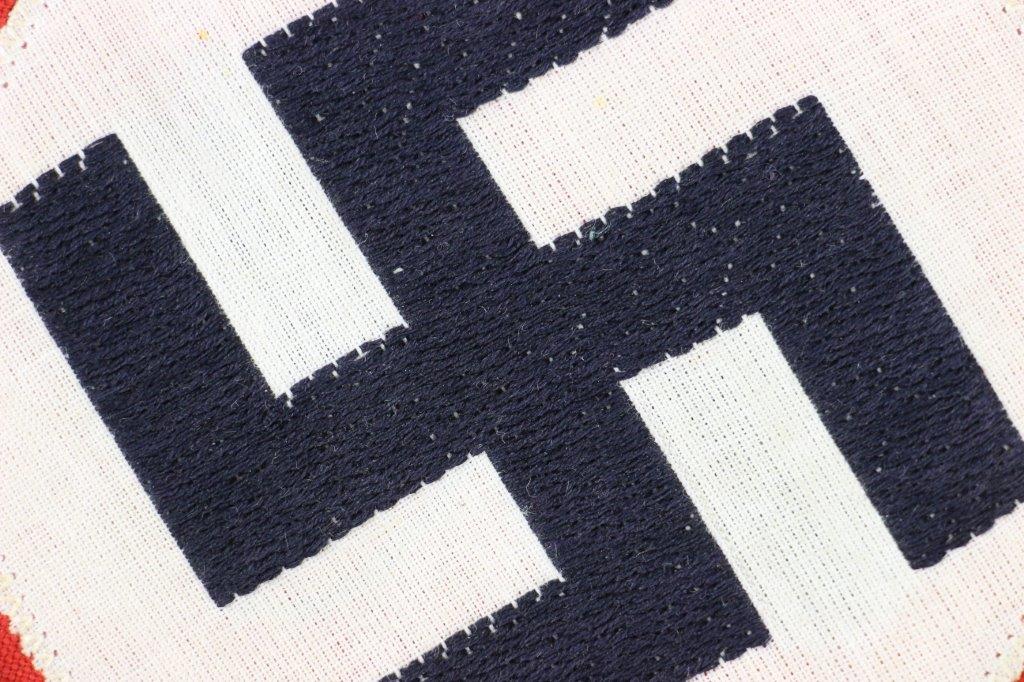 8/17/24 – This is an excellent condition WW2 German Double-Sided Pennant Flag. Each side of the flag features a black thread embroidered swastika centralized on a sewn-on white circular background. Excellent, tight, and original stitching throughout. The red linen cloth base is vibrant and stain free with minimal surface age and no notable issues. The flag is bordered with a white twisted chord border that’s sewn along the edge. The hoist shows mild surface age with an original hanging rope attached. Original clip on one end that’s intact and functional with light speckling patina. Measures about 30cm long and 20cm wide.