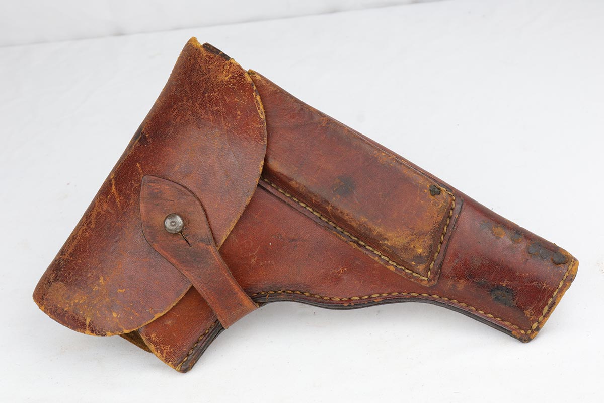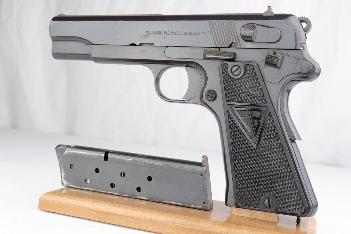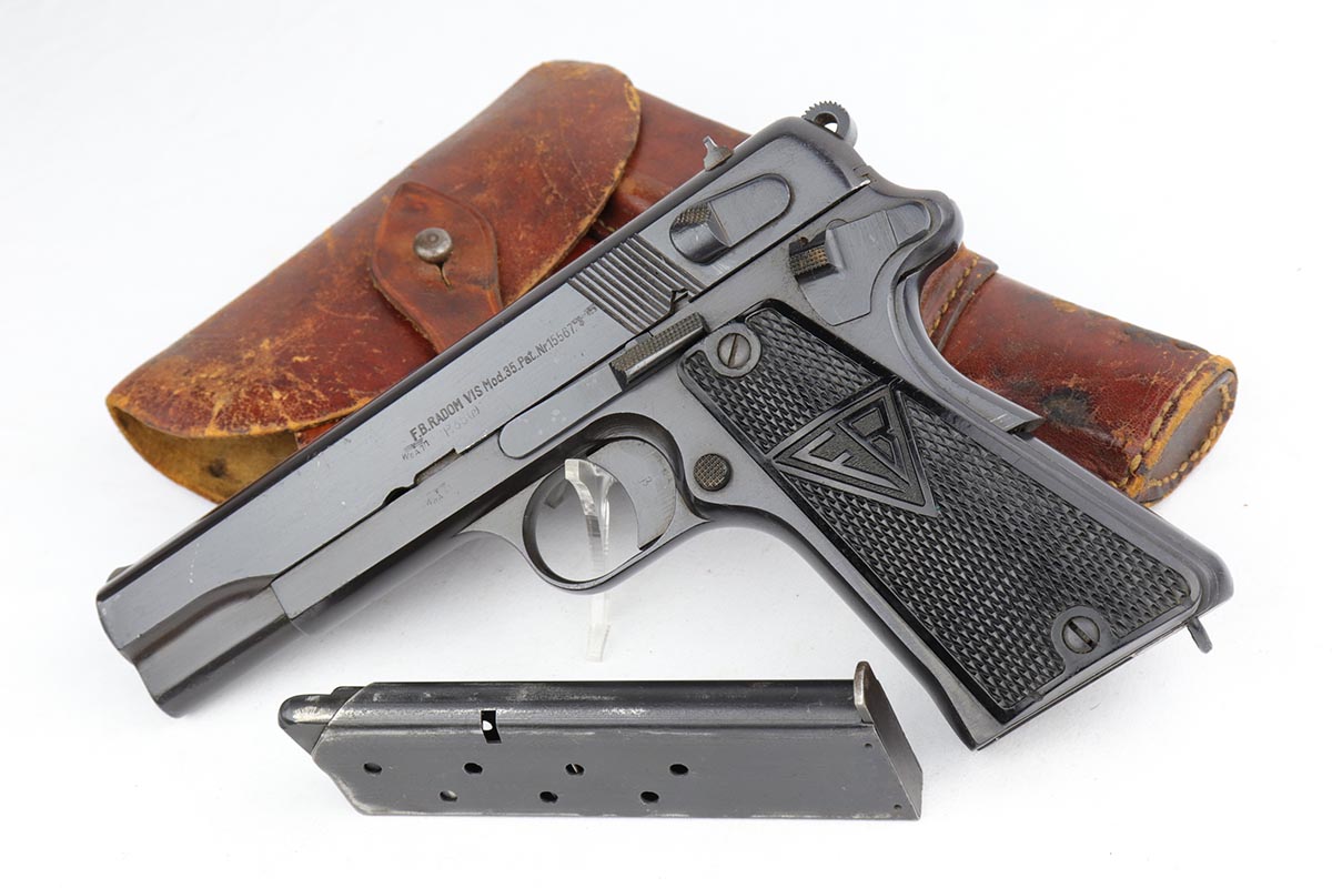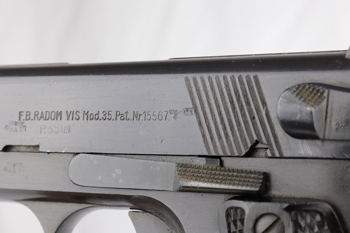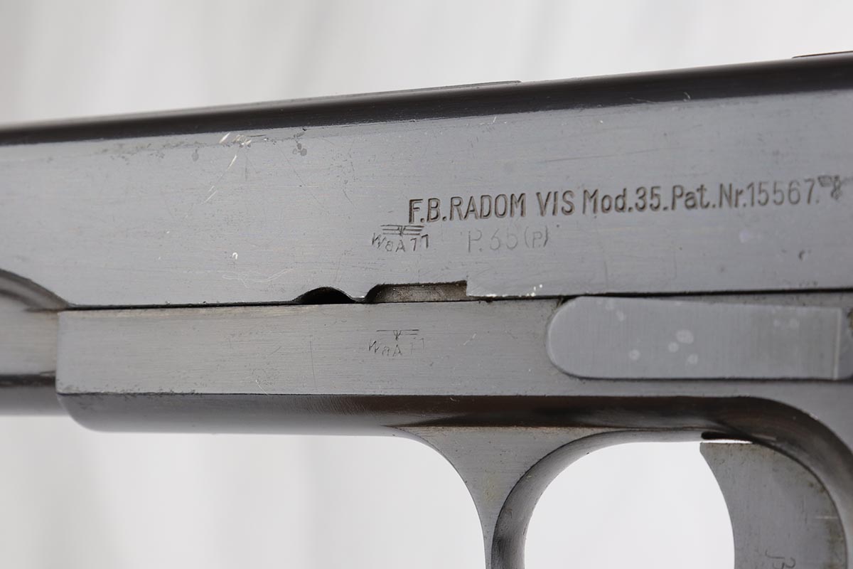 3/21/19 – This is a near-mint Radom VIS 35 with original holster. It is an earlier three-lever variant, all matching and original, retaining 98-99% blue. There is very little actual bluing loss, but there is minor freckling along the edges of the right side slide, and some age under the finish on the straps. Right grip panel does have a thin crack. Waffen marked magazine. Holster has fairly clear internal inkstamps but does show a good amount of age and wear.