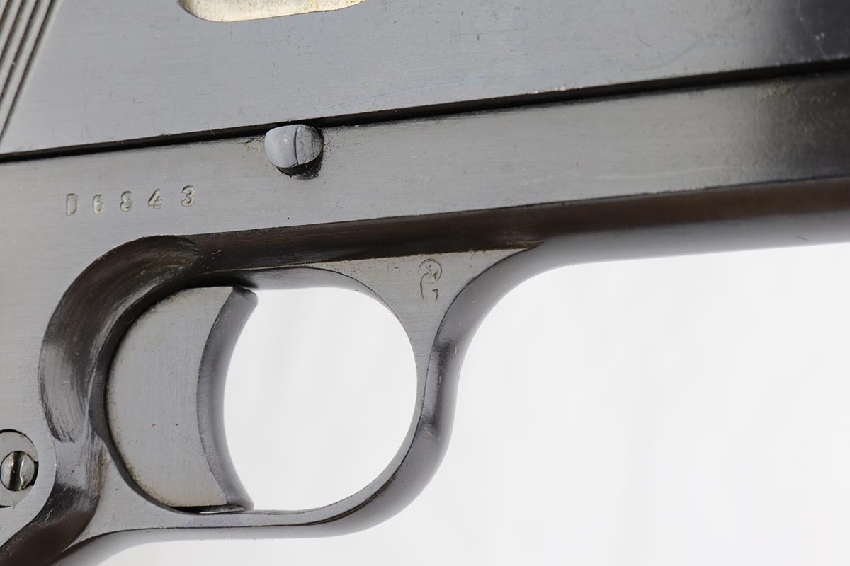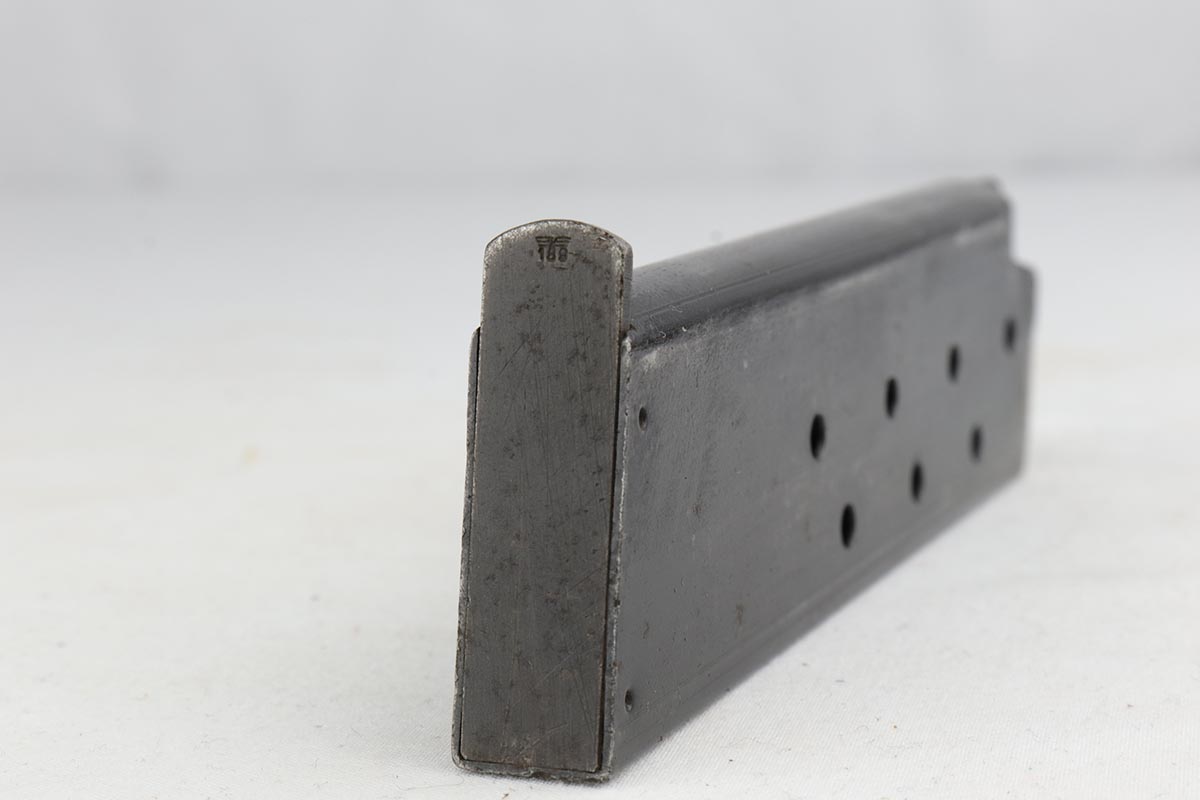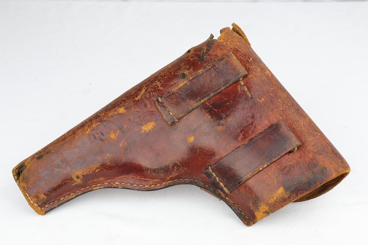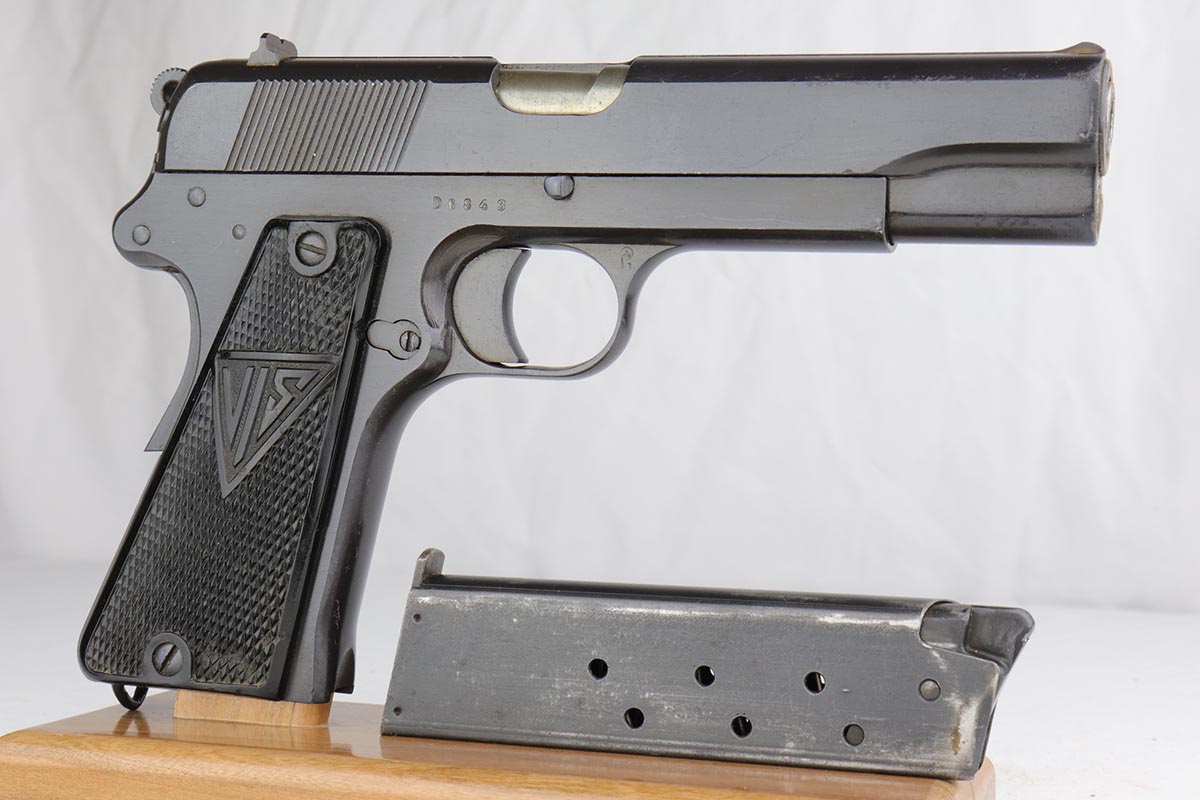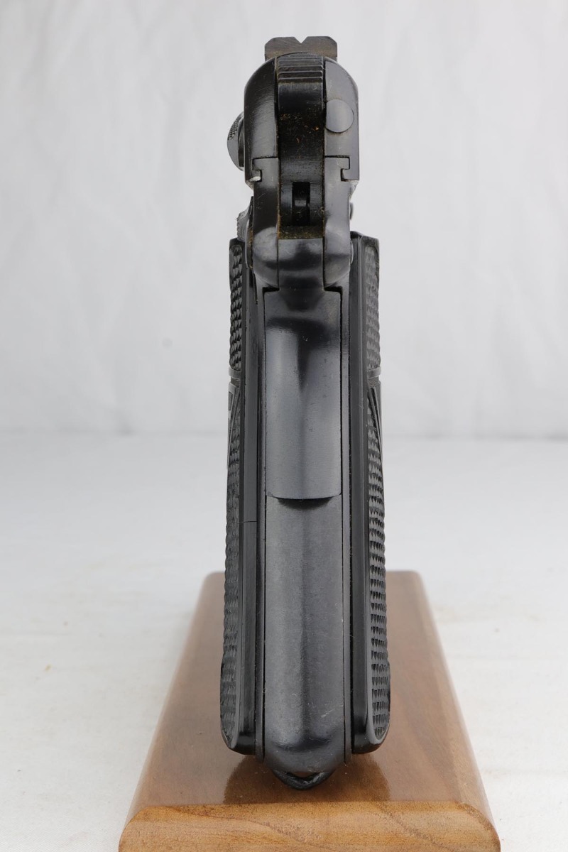 3/21/19 – This is a near-mint Radom VIS 35 with original holster. It is an earlier three-lever variant, all matching and original, retaining 98-99% blue. There is very little actual bluing loss, but there is minor freckling along the edges of the right side slide, and some age under the finish on the straps. Right grip panel does have a thin crack. Waffen marked magazine. Holster has fairly clear internal inkstamps but does show a good amount of age and wear.