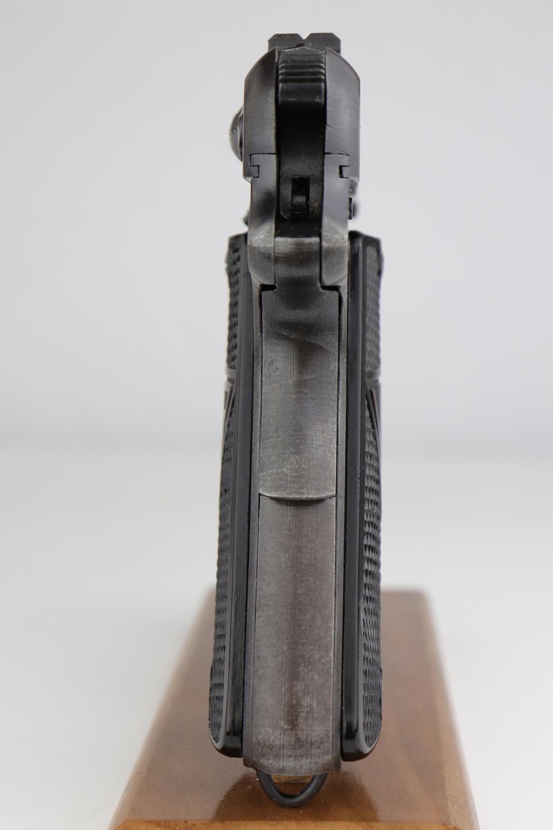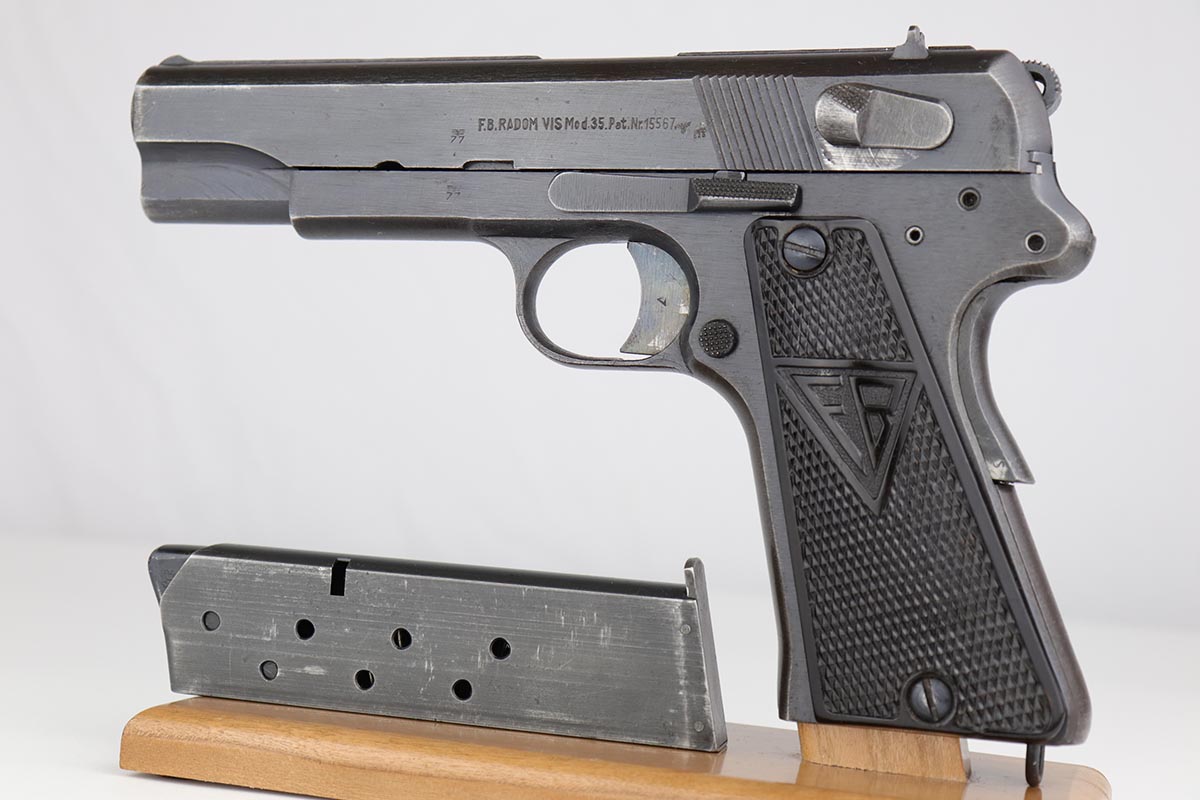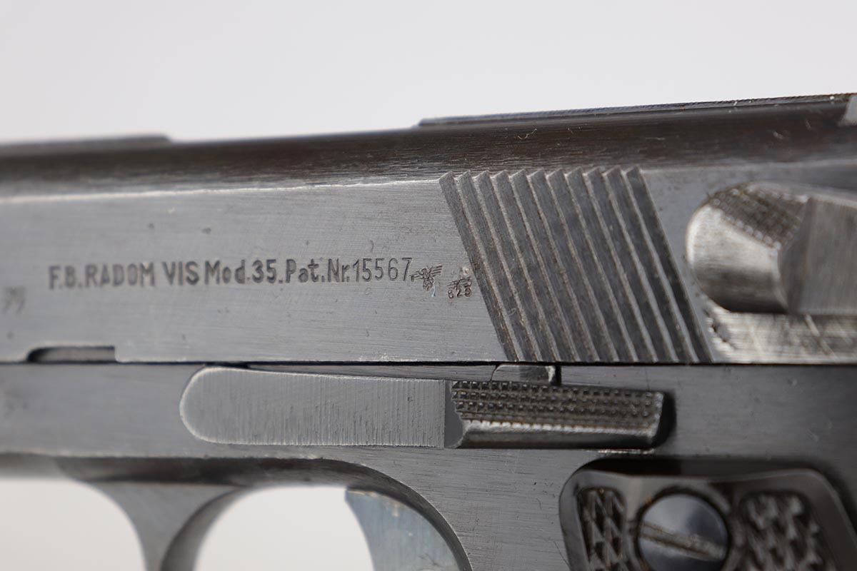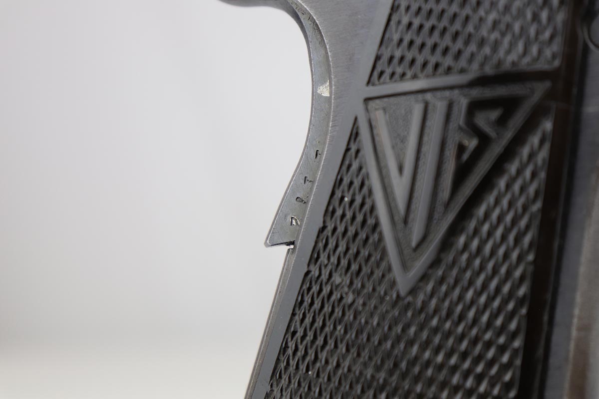 5/22/19 – This is an excellent example of an all matching and original Radom VIS Model 35, with ‘a-prefix’ serial. The original military style bluing rates in the high 90s, with minor muzzle wear on the slide, and an area of finish loss on the back strap. Nice, original grips with no major chips or cracks. Minty bore. Unmarked but original magazine.