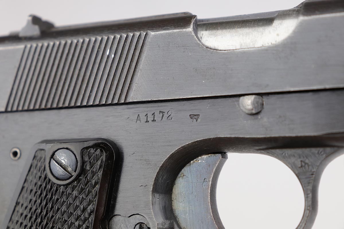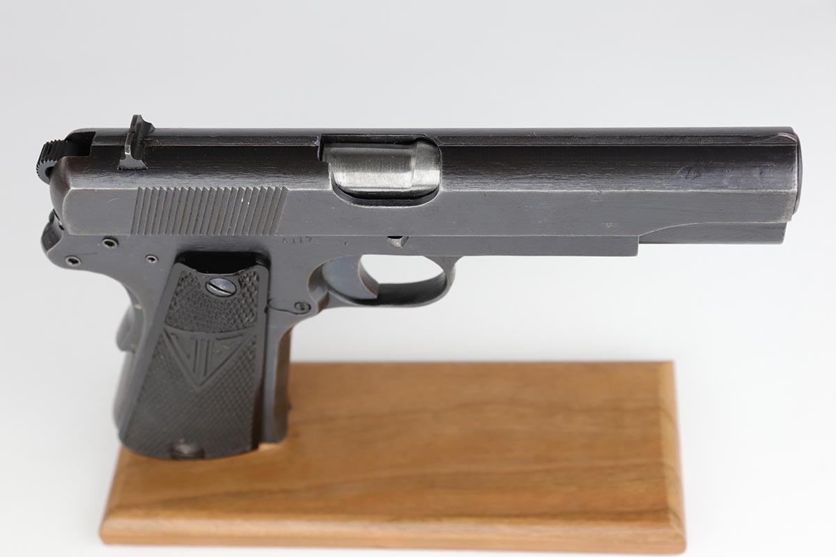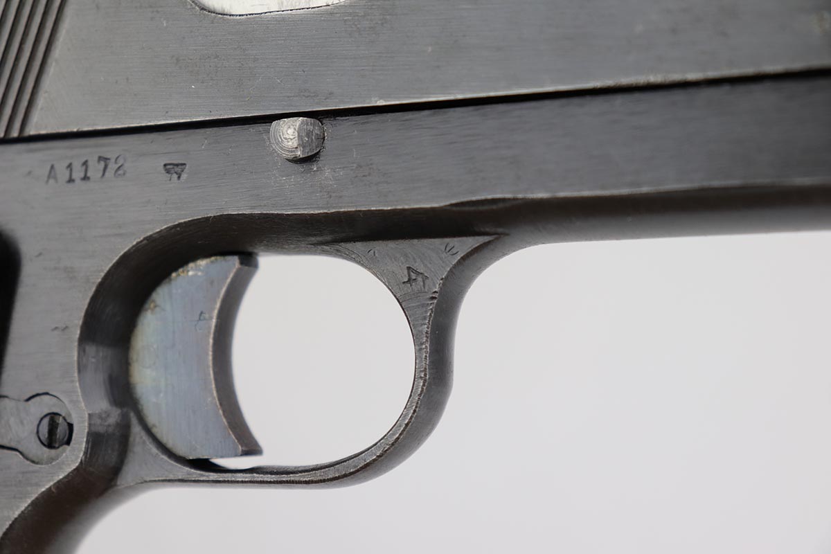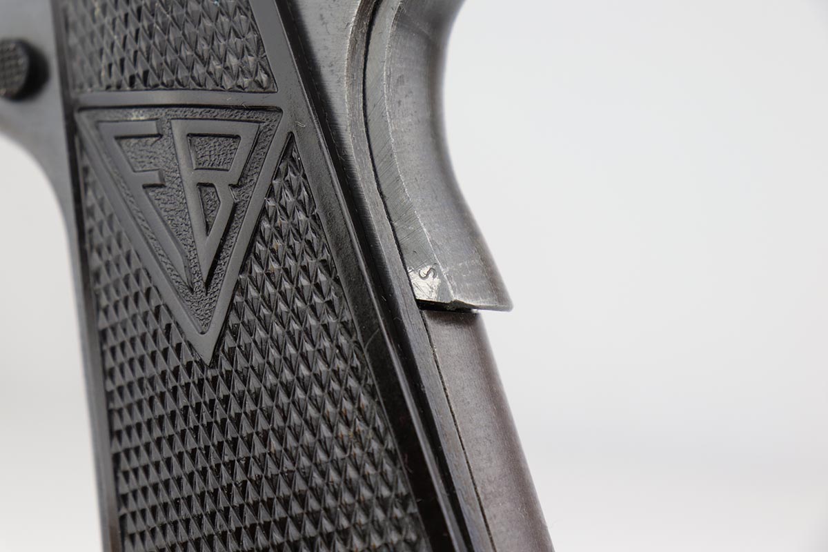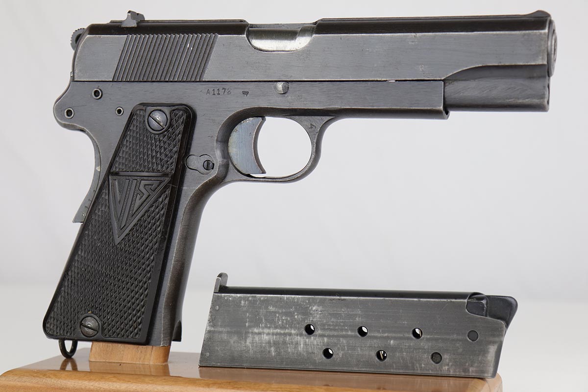 5/22/19 – This is an excellent example of an all matching and original Radom VIS Model 35, with ‘a-prefix’ serial. The original military style bluing rates in the high 90s, with minor muzzle wear on the slide, and an area of finish loss on the back strap. Nice, original grips with no major chips or cracks. Minty bore. Unmarked but original magazine.