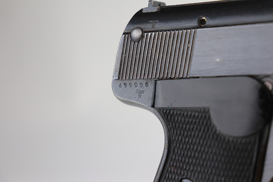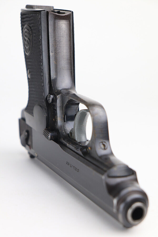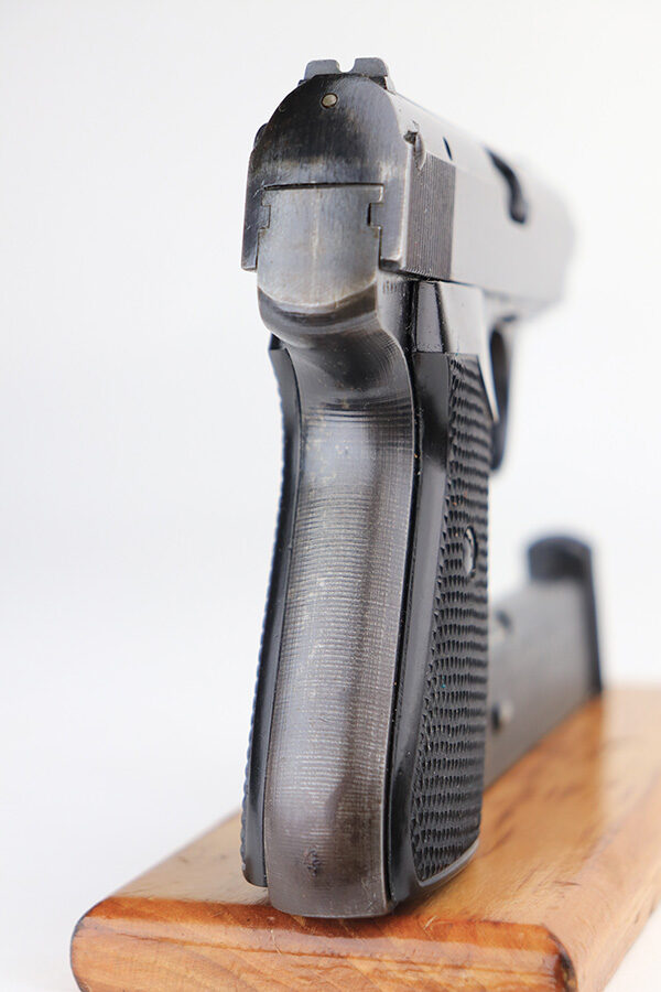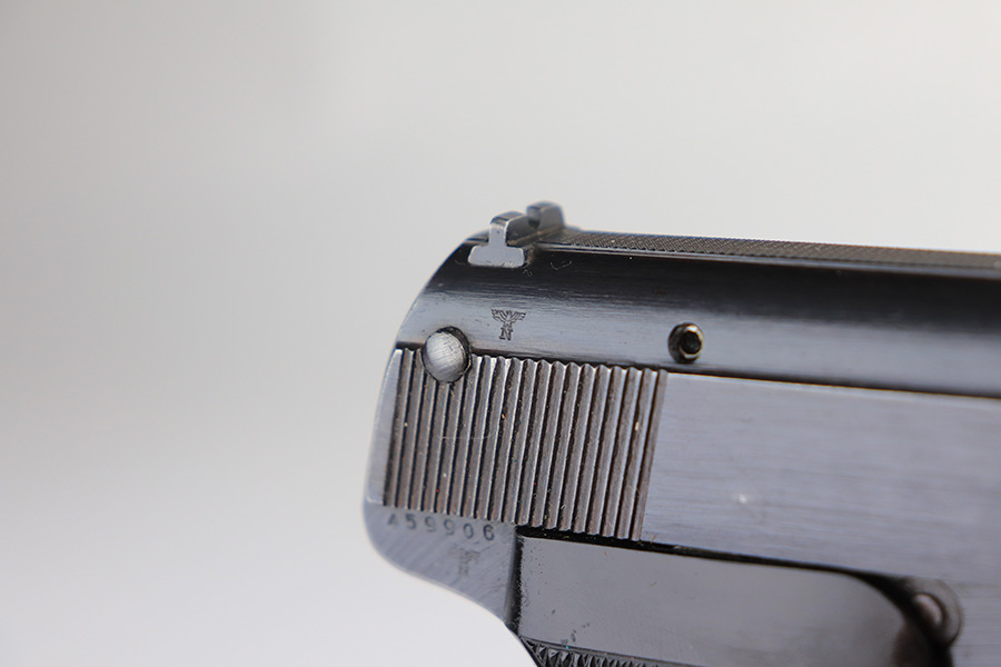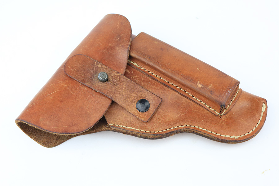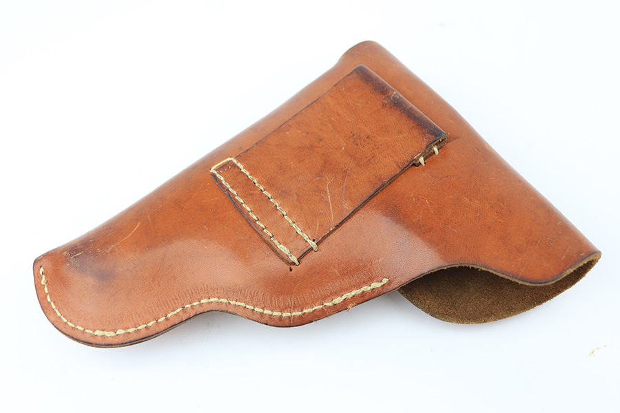 1/13/22 – This is an excellent example of a Sauer 38h issued to the Nazi military during WW2. It is all matching and has the proper “Eagle 37” Nazi military acceptance proof on the left side of the trigger guard. It comes as a rig with a generic tan leather holster and one period-correct magazine. The gun has retained about 95% of its original finish. There is very minor thinning and minor spotty wear on both grip straps. There are also a few small dots of wear along both sides of the slide. Comes with excellent period-correct black bakelite grips. The bore is near-mint.