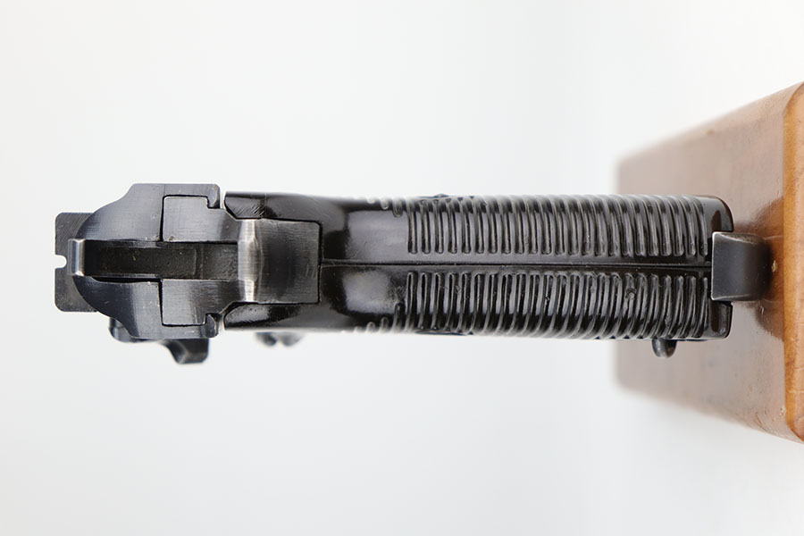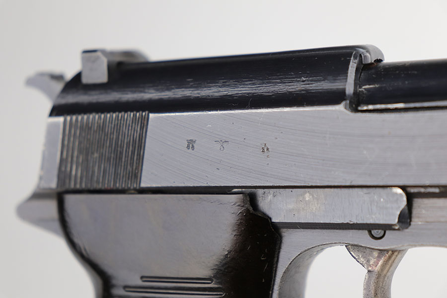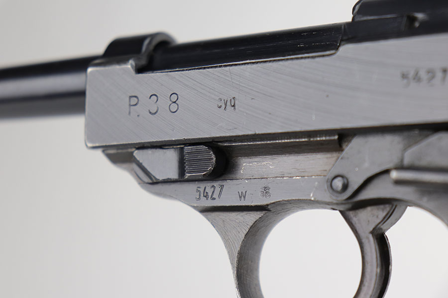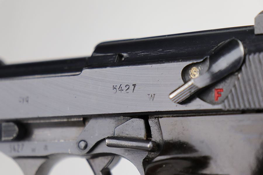 9/22/20 – This is an excellent Nazi Spreewerk P.38 from November of 1944. All matching and original with excellent bluing that rates at 95-97%. There’s high edge wear on the muzzle and slide, and a bit of thinning and oxidation on the front strap. Good mechanics, including de-cocker. Magazine is ‘jvd’ marked. Minty bore. Grips are in great shape aside from a chip in the upper corner of the right grip.