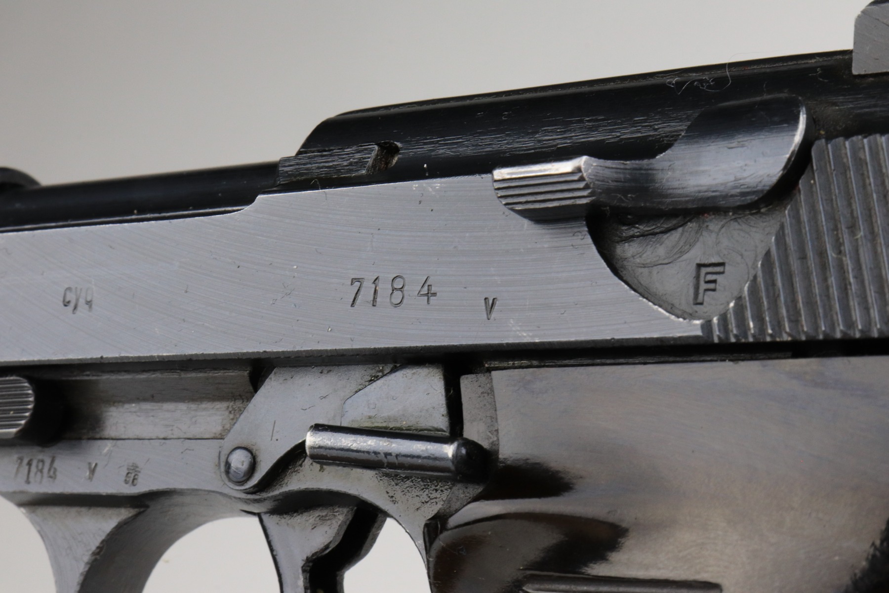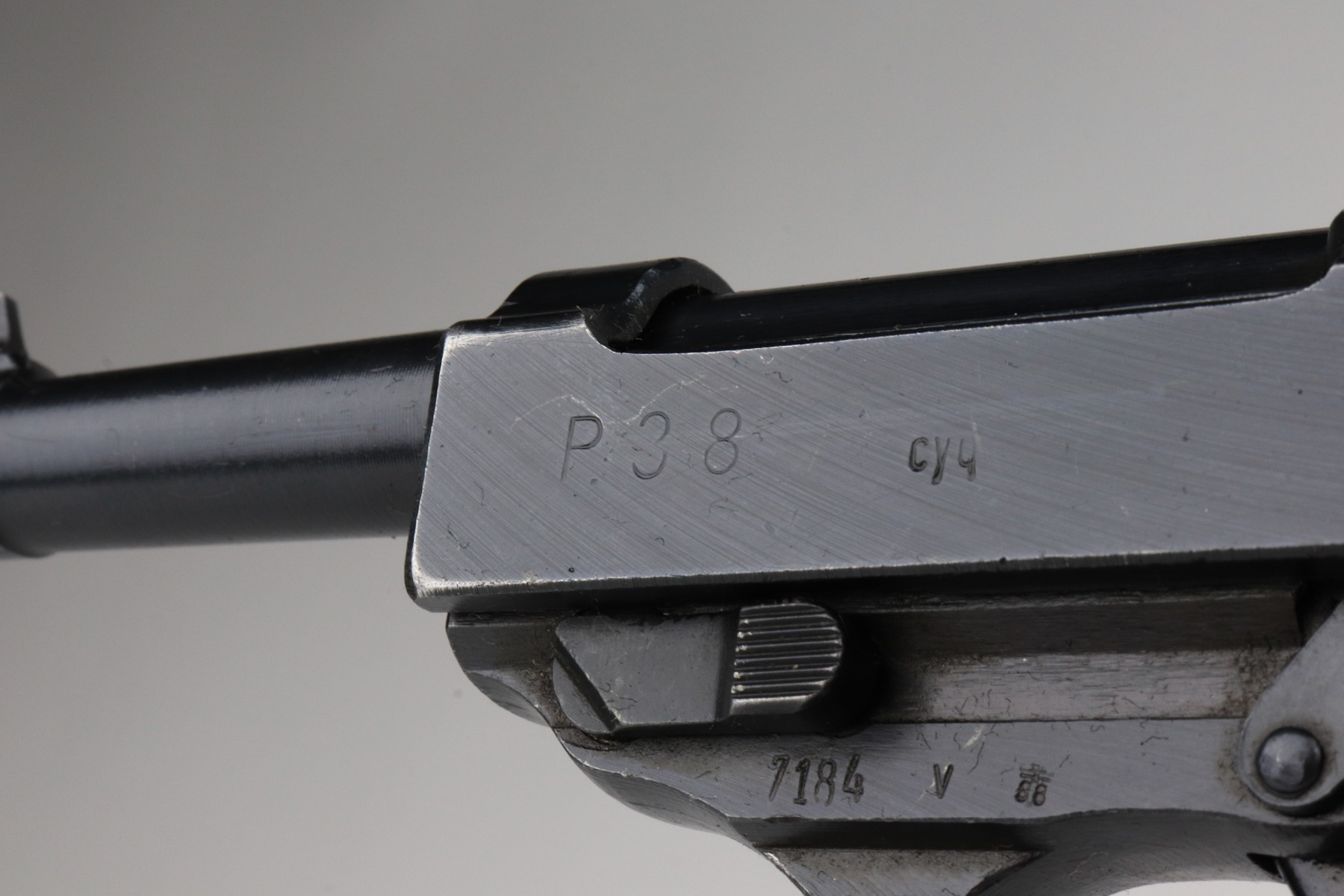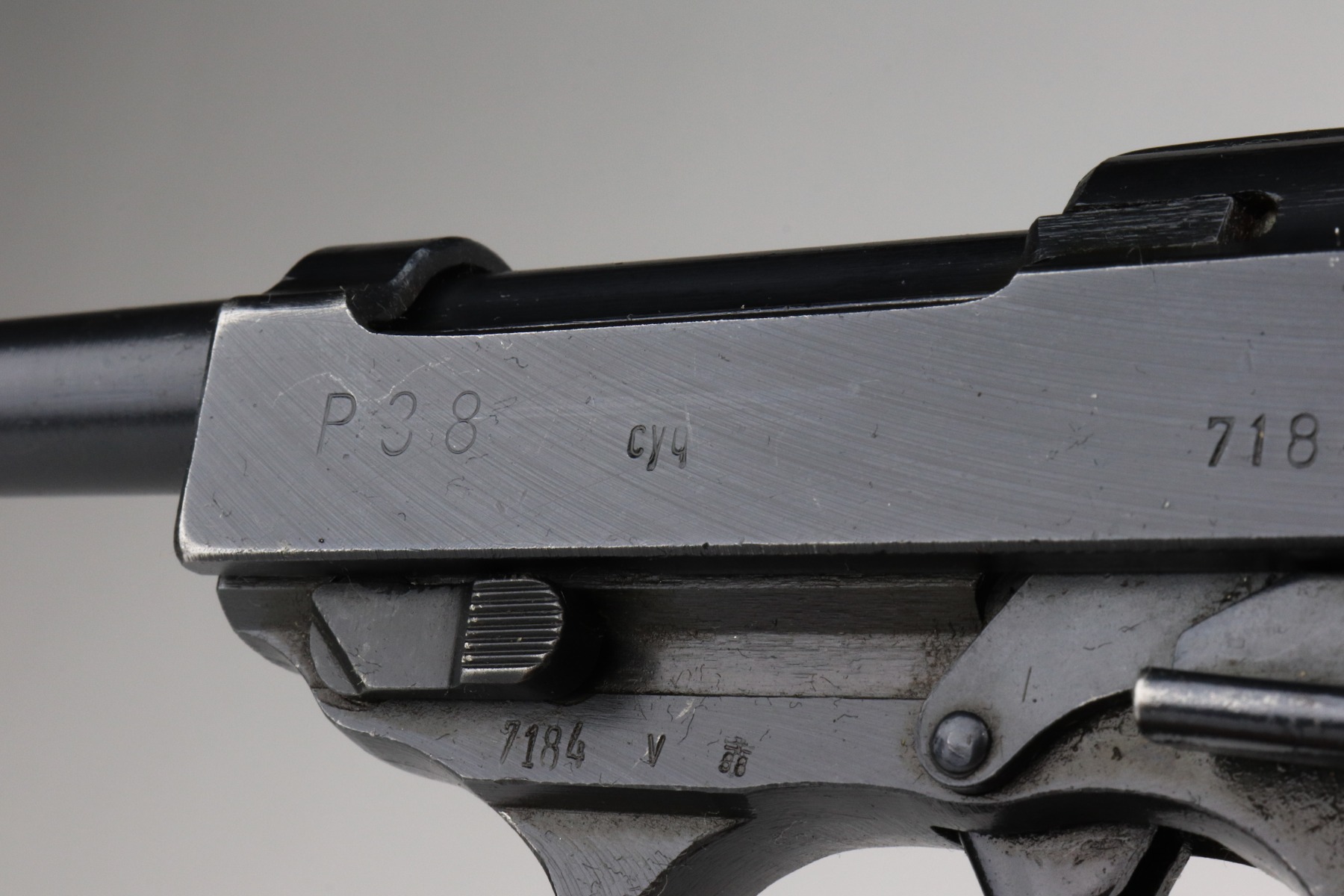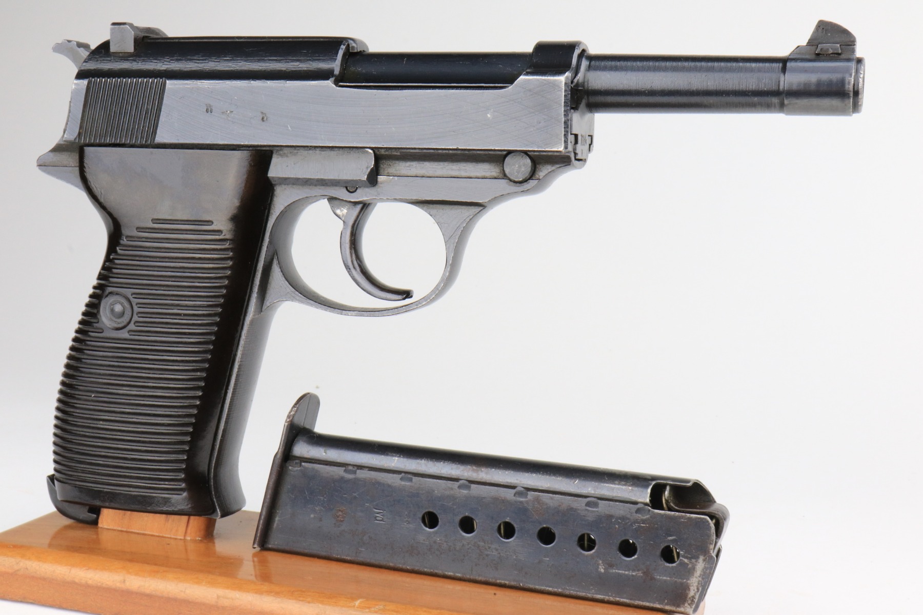 1/7/21 – This is an excellent example of a Spreewerk P.38 issued to the Nazi military in October of 1944. It is all matching and has the proper “Eagle 88” military proofs. This one has a slightly dark finish. We believe it was captured by the Russians at the end of the war and “Russian-dipped”. It appears, however, that it was cleaned off at some point because much of the original bluing is visible. It has retained about 96-97% of its finish. There is very minor thinning on the front strap and minor wear around the muzzle and high edges of the slide. A few very light handling marks here and there. It comes with excellent grips and a period-correct magazine. De-cocker is functional. The bore is excellent – shiny with strong rifling.
