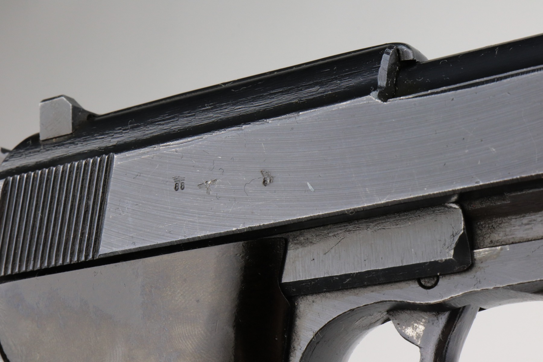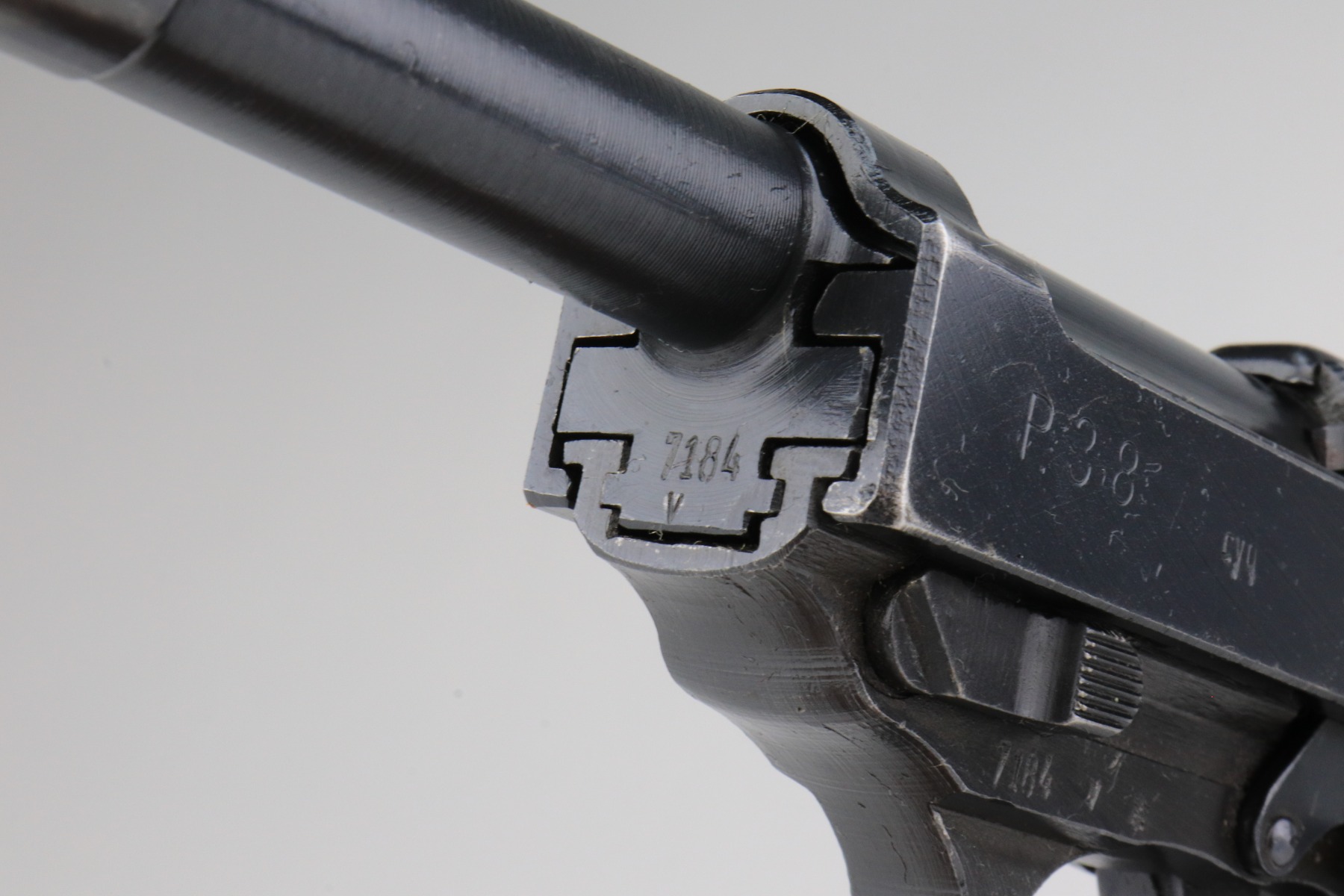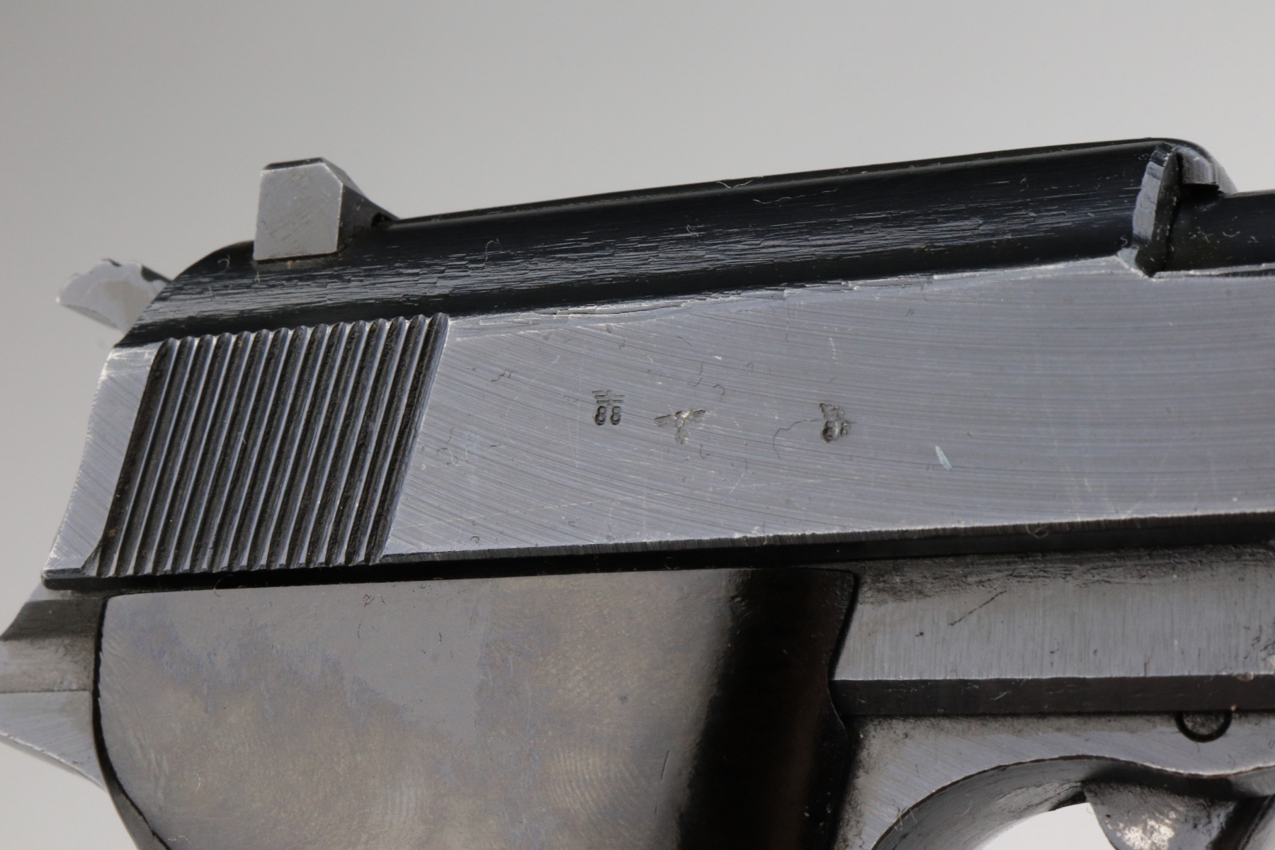 1/7/21 – This is an excellent example of a Spreewerk P.38 issued to the Nazi military in October of 1944. It is all matching and has the proper “Eagle 88” military proofs. This one has a slightly dark finish. We believe it was captured by the Russians at the end of the war and “Russian-dipped”. It appears, however, that it was cleaned off at some point because much of the original bluing is visible. It has retained about 96-97% of its finish. There is very minor thinning on the front strap and minor wear around the muzzle and high edges of the slide. A few very light handling marks here and there. It comes with excellent grips and a period-correct magazine. De-cocker is functional. The bore is excellent – shiny with strong rifling.