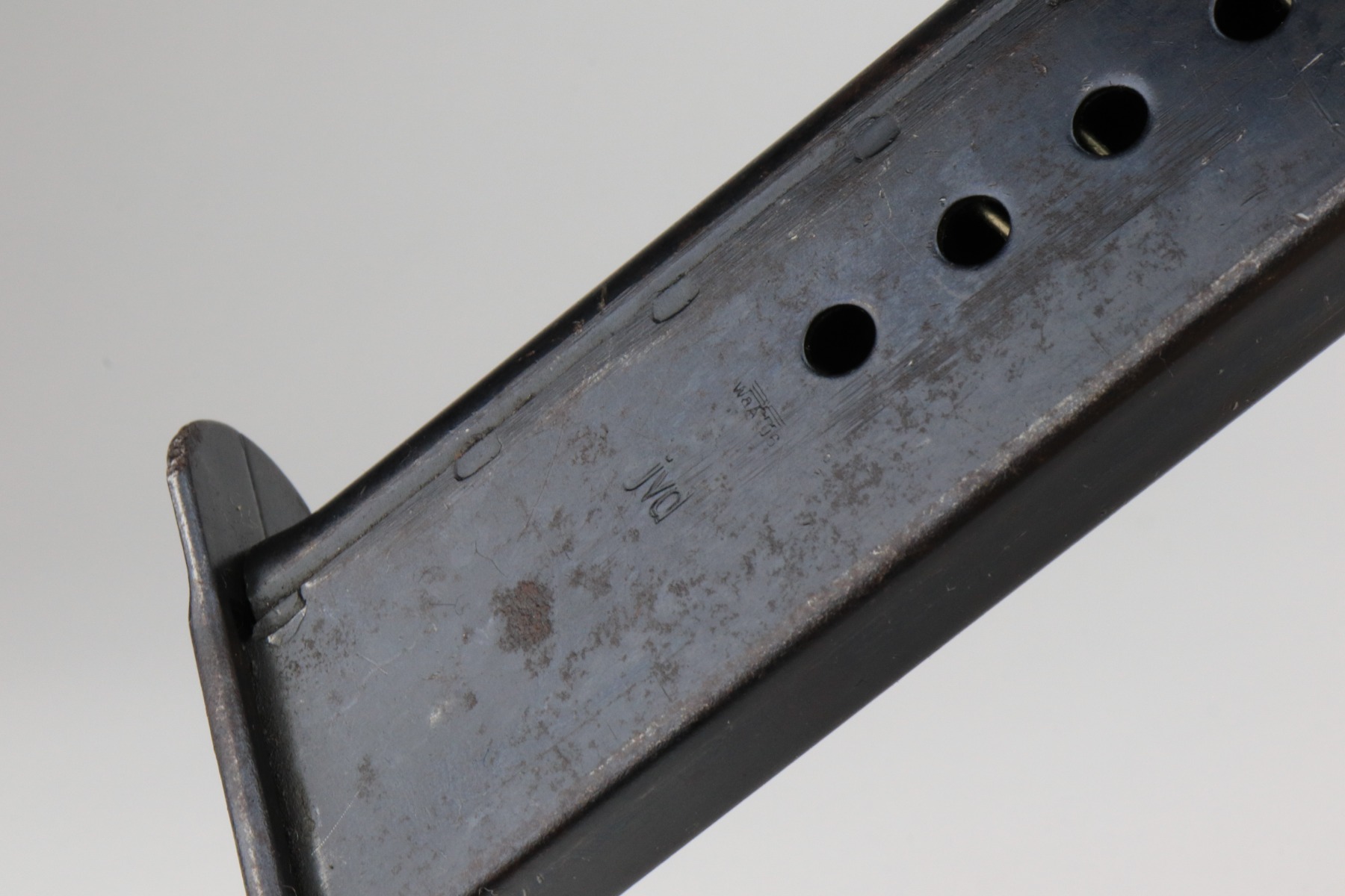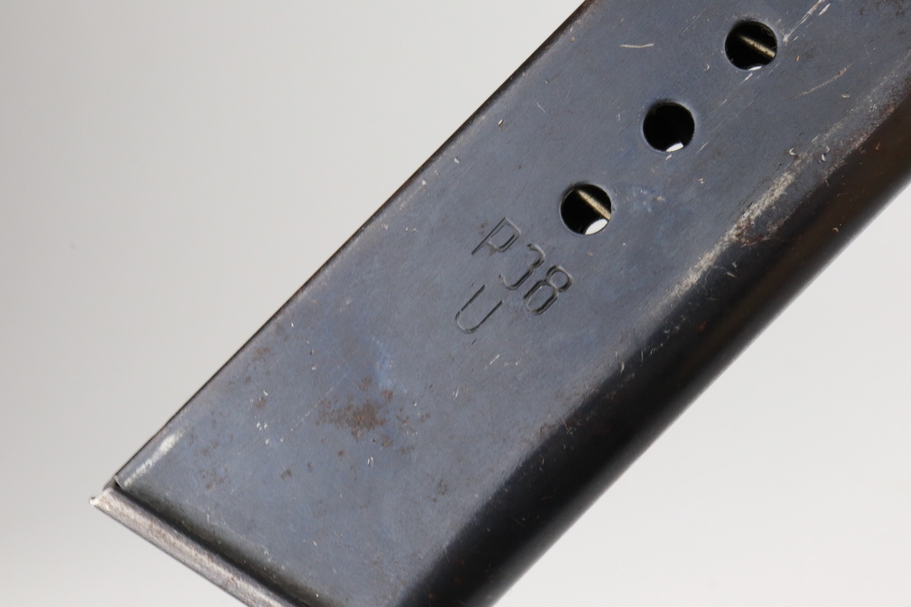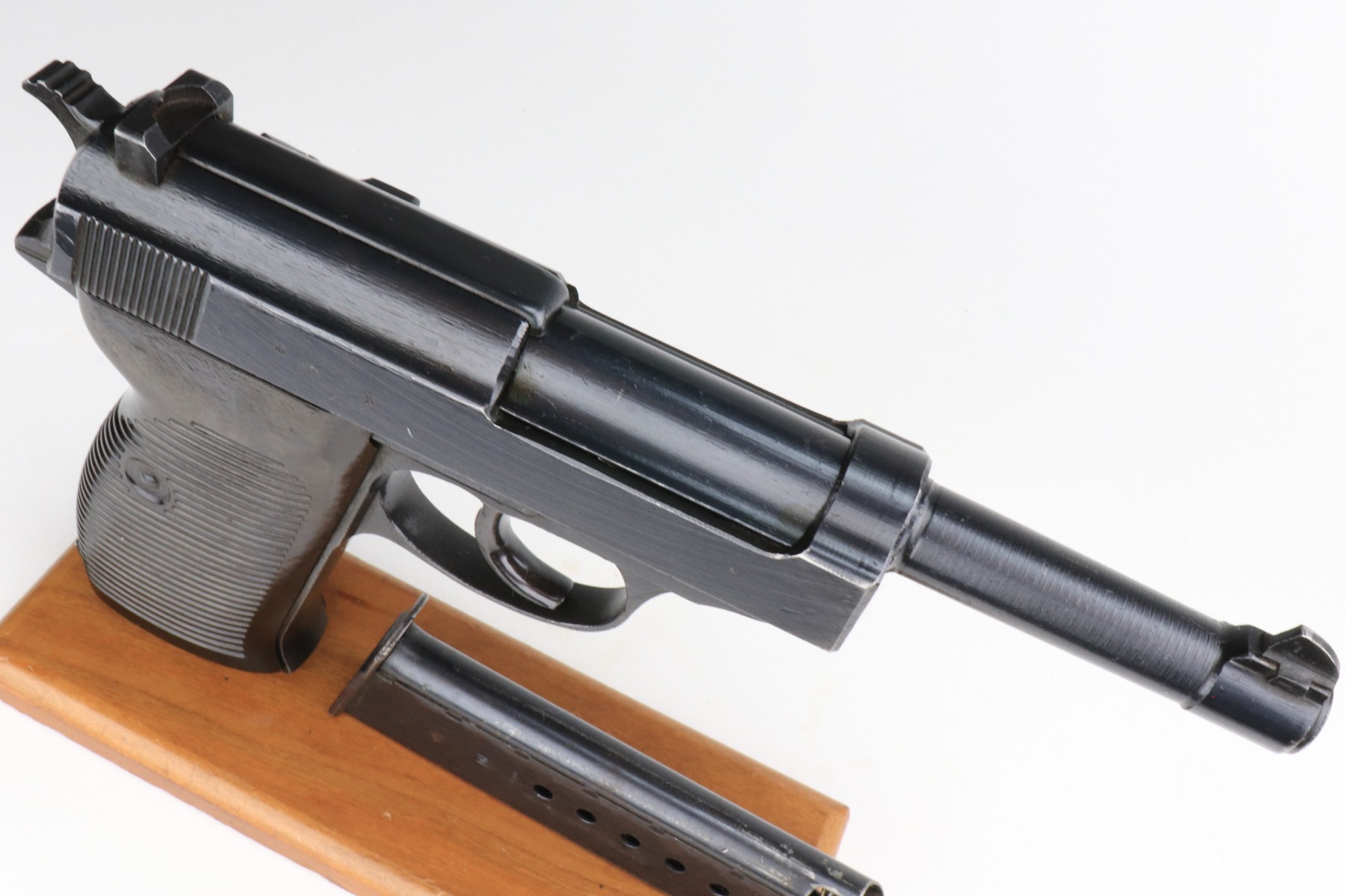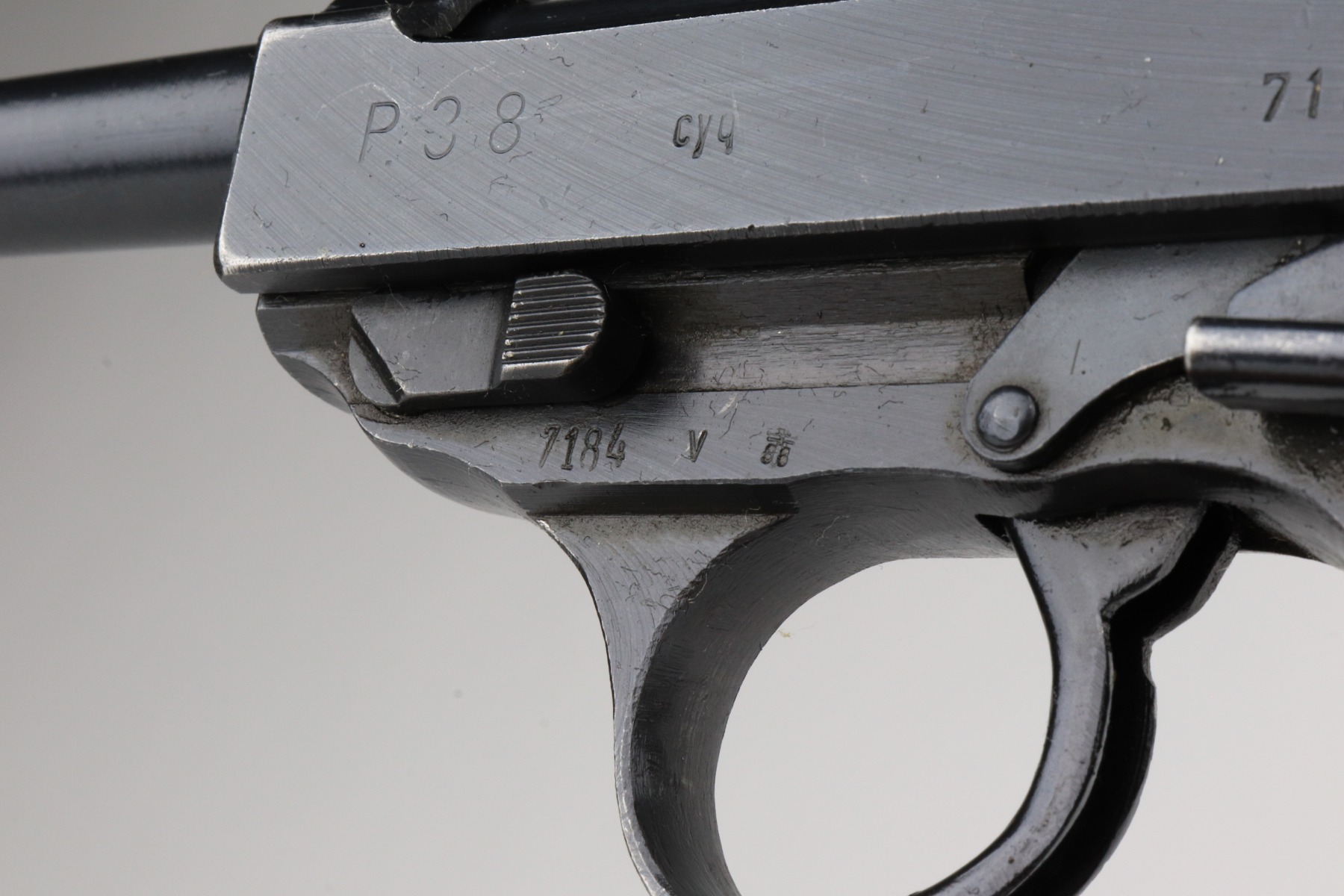 1/7/21 – This is an excellent example of a Spreewerk P.38 issued to the Nazi military in October of 1944. It is all matching and has the proper “Eagle 88” military proofs. This one has a slightly dark finish. We believe it was captured by the Russians at the end of the war and “Russian-dipped”. It appears, however, that it was cleaned off at some point because much of the original bluing is visible. It has retained about 96-97% of its finish. There is very minor thinning on the front strap and minor wear around the muzzle and high edges of the slide. A few very light handling marks here and there. It comes with excellent grips and a period-correct magazine. De-cocker is functional. The bore is excellent – shiny with strong rifling.