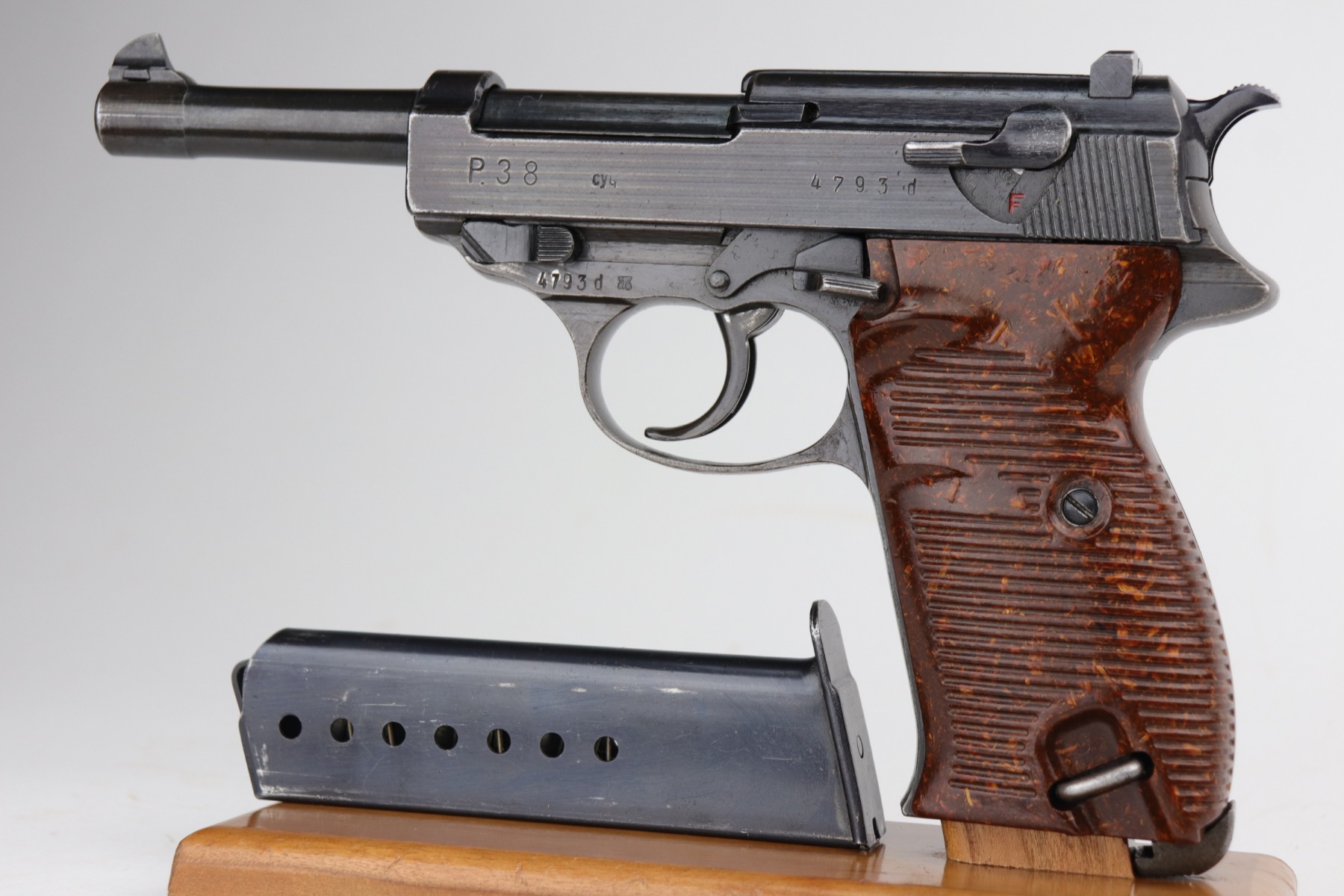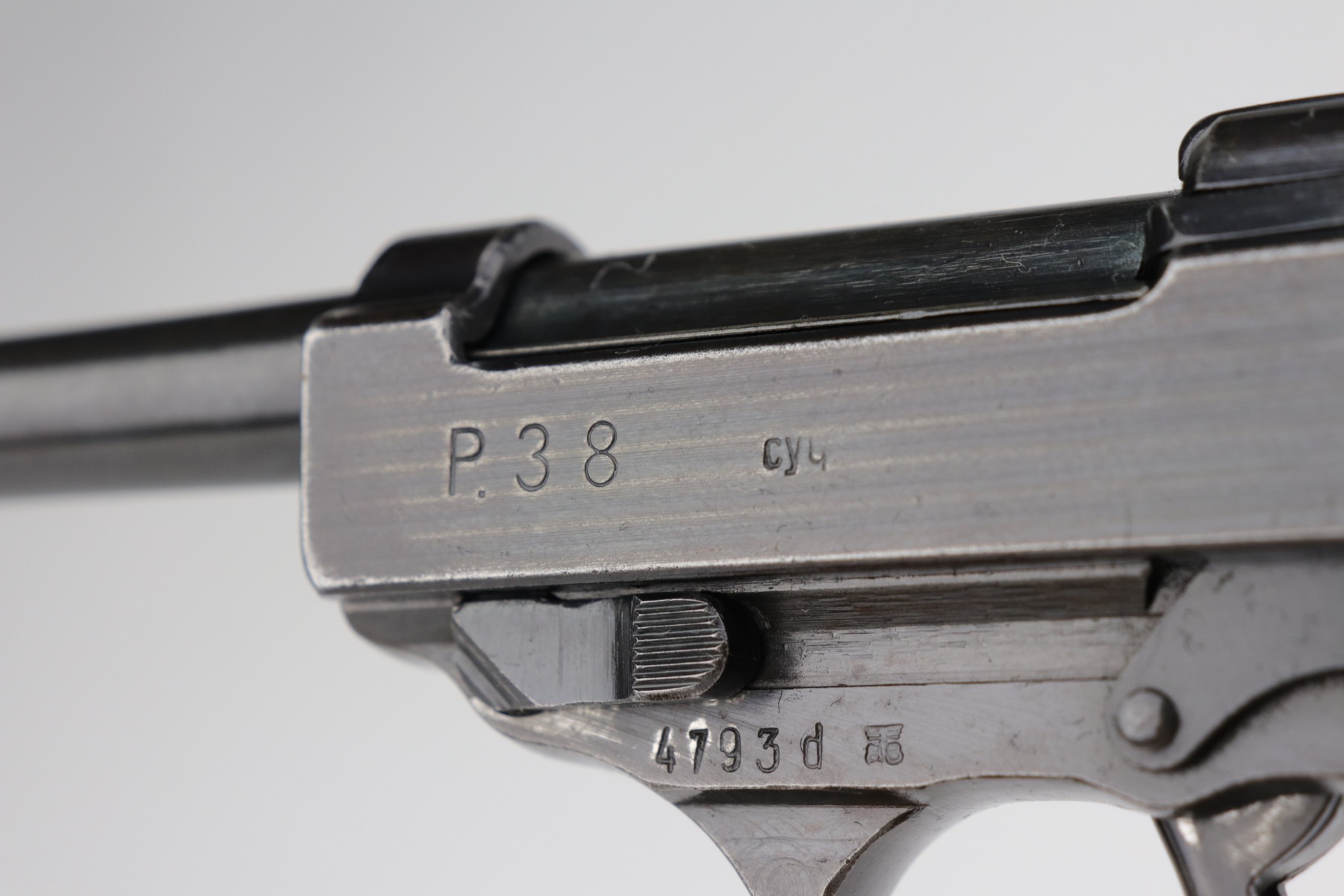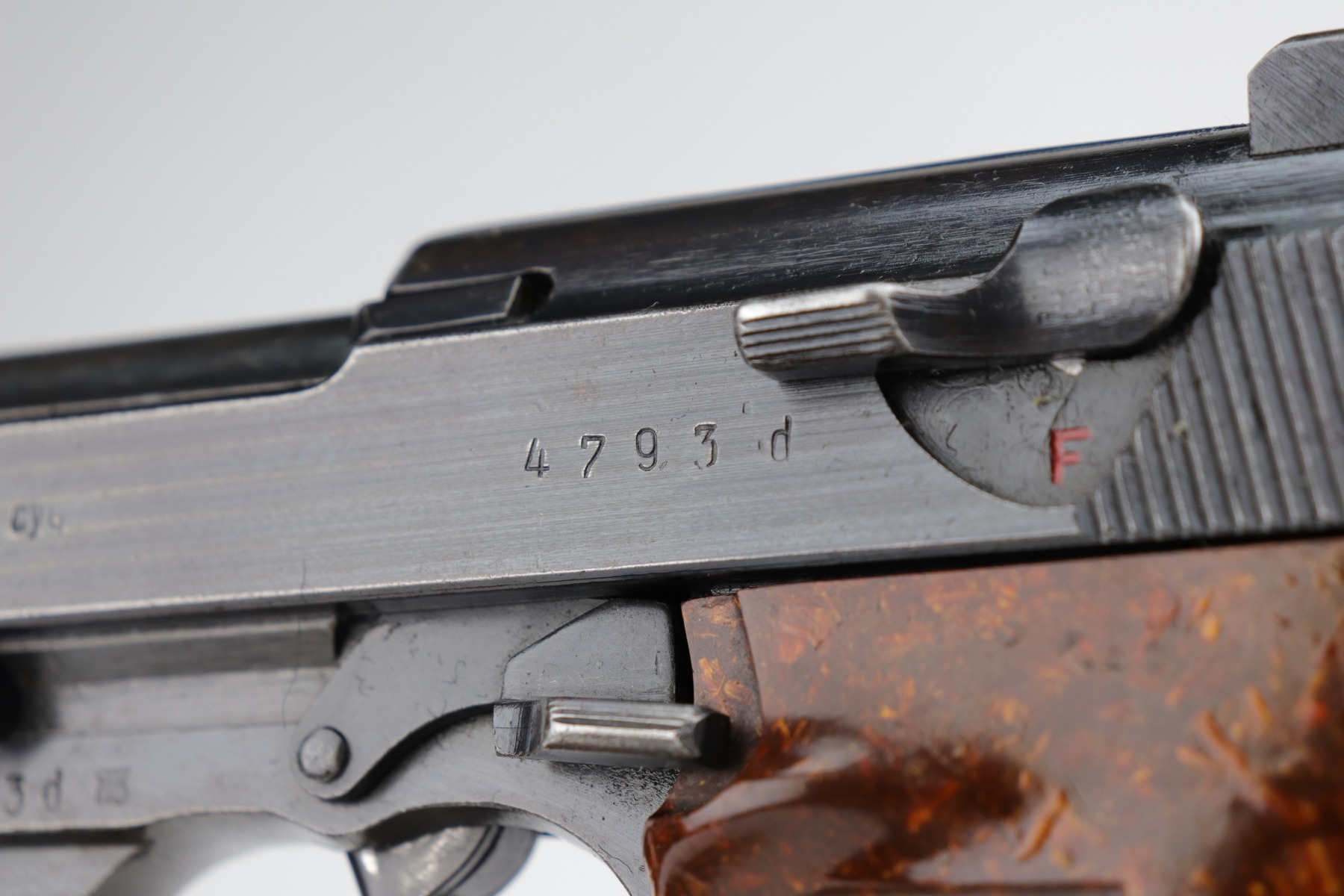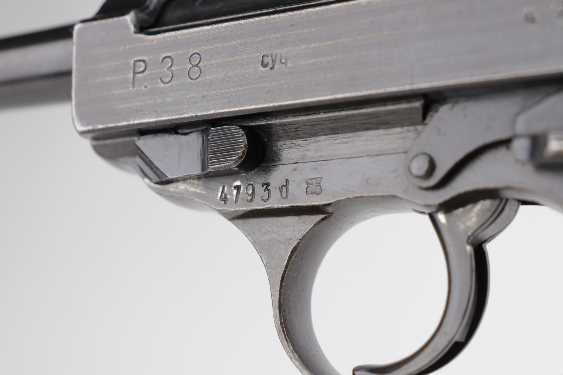 2/10/21 – This is an excellent example of a Spreewerk P.38 issued to the Nazi military in June of 1943. The gun is all matching and has the proper “Eagle 88” military proofs. It has retained about 95% of its finish. There is minor wear around some of the high edges and thinning on the front strap. Spotty oxidation on the front strap. There are a few streaks of wear on the left side of the slide where the machining marks are. There are a few small areas of discoloration on the right side of the slide. It comes with excellent grips and a period-correct magazine. The bore has good rifling, but there is pin-pricking throughout. The de-cocker does not work properly.