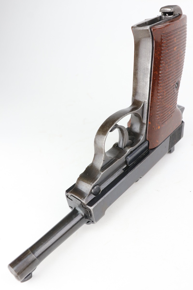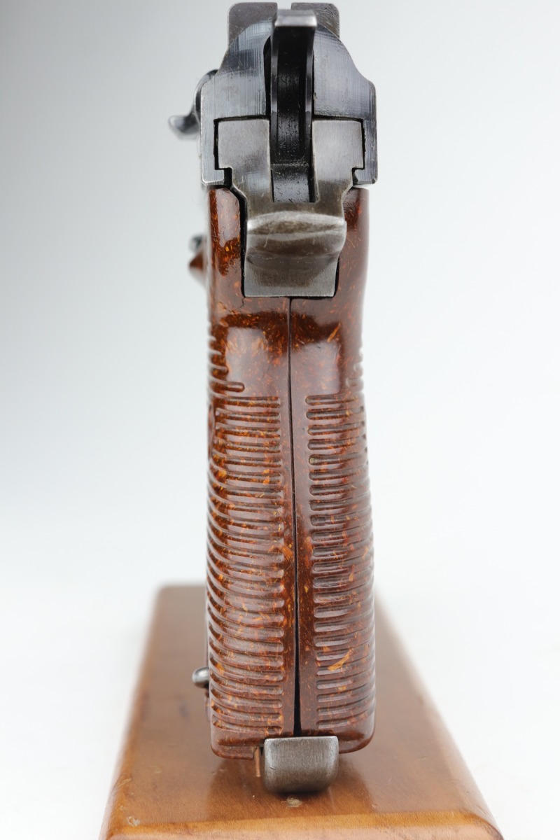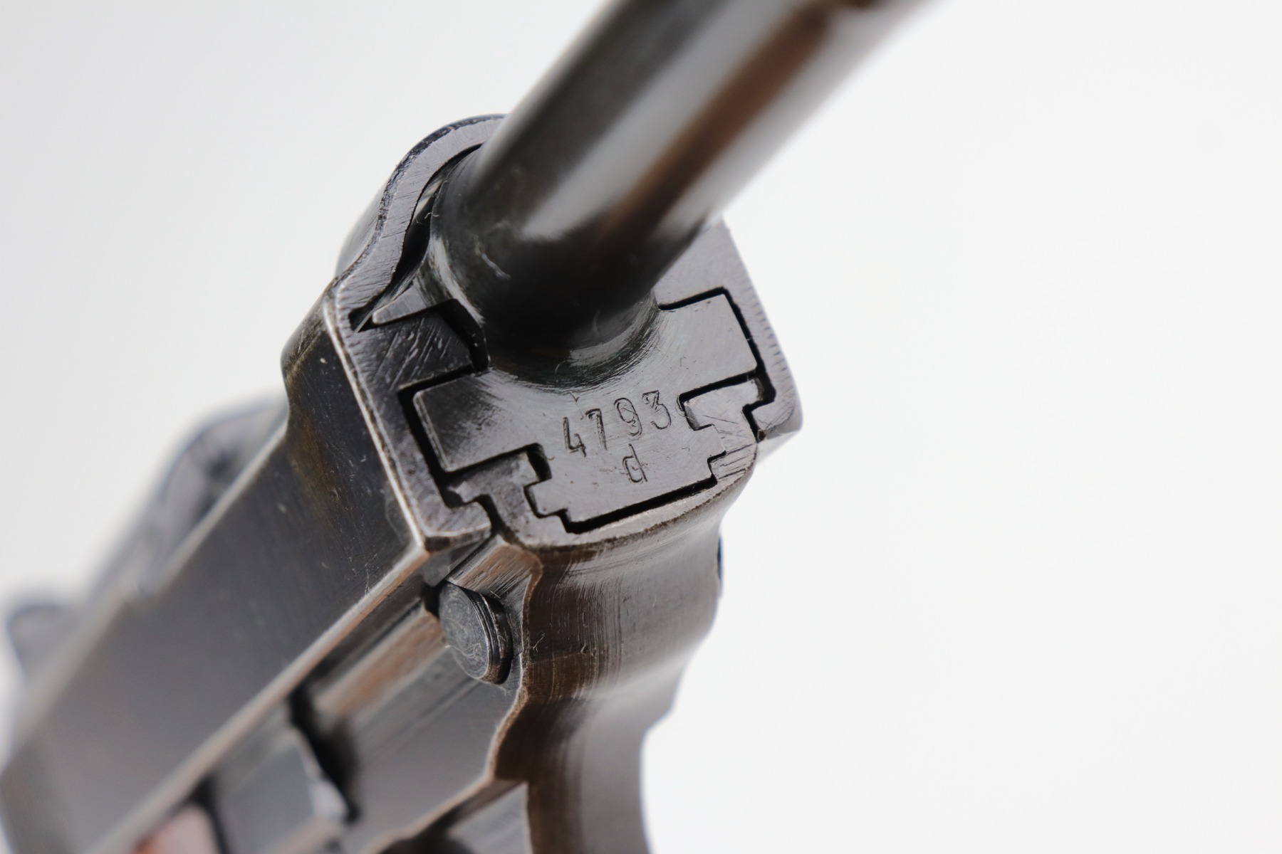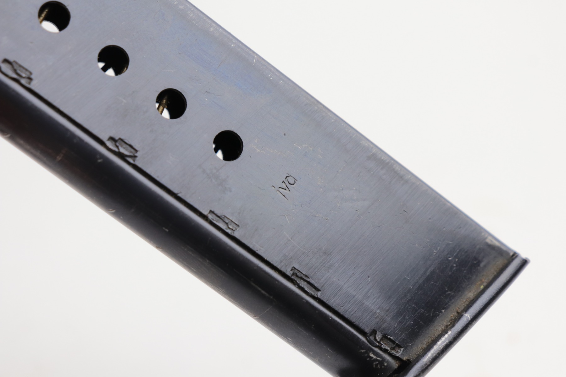 2/10/21 – This is an excellent example of a Spreewerk P.38 issued to the Nazi military in June of 1943. The gun is all matching and has the proper “Eagle 88” military proofs. It has retained about 95% of its finish. There is minor wear around some of the high edges and thinning on the front strap. Spotty oxidation on the front strap. There are a few streaks of wear on the left side of the slide where the machining marks are. There are a few small areas of discoloration on the right side of the slide. It comes with excellent grips and a period-correct magazine. The bore has good rifling, but there is pin-pricking throughout. The de-cocker does not work properly.