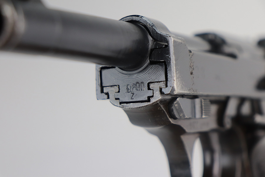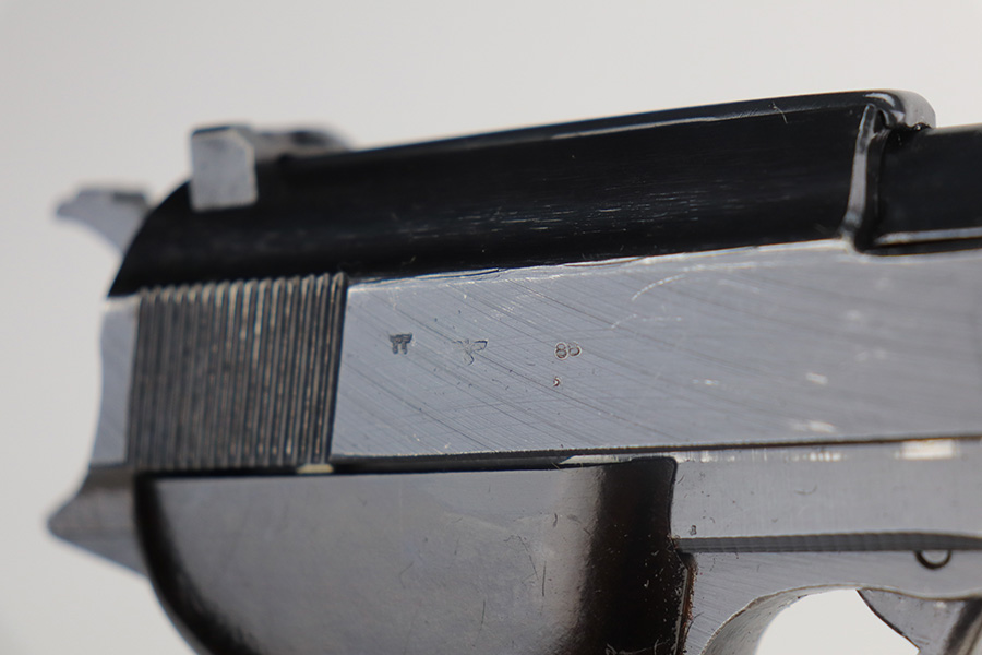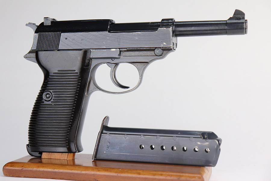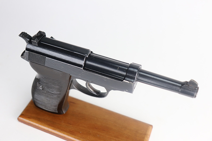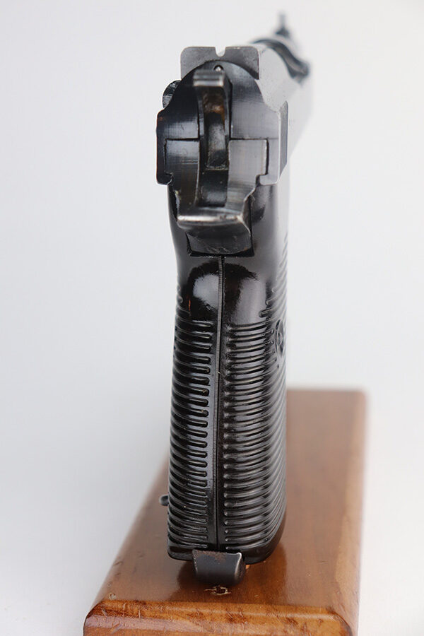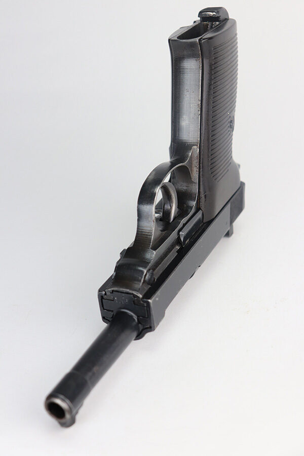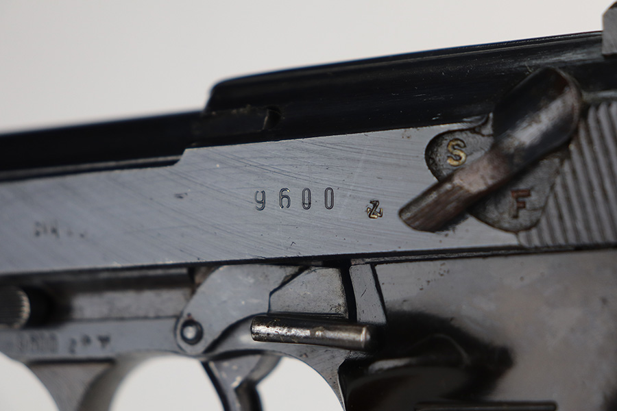 5/24/21 – This is an excellent example of a Spreewerk P.38 issued to the Nazi military in February of 1945. The gun is matching and has the proper “Eagle 88” military proofs. There is a star proof on the left side of the frame meaning the part was sent back to the factory for repair. It has retained about 95% of its original bluing. There is minor wear around the muzzle and front edges of the slide. Thinning on the front strap. Small areas of pitting on the left side of the slide and front strap. Comes with excellent grips and a period-correct magazine. Minty bore. De-cocker is functional.