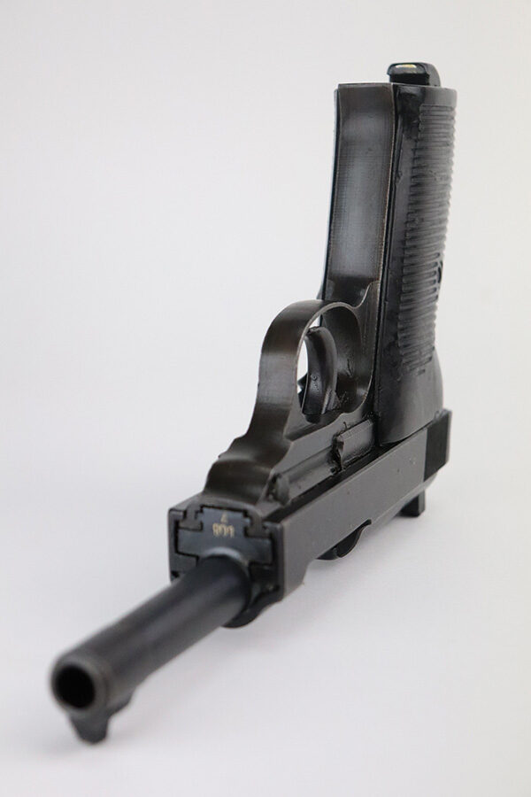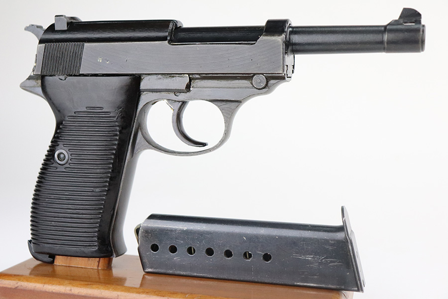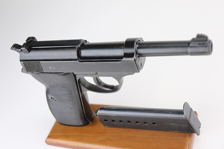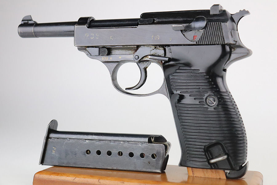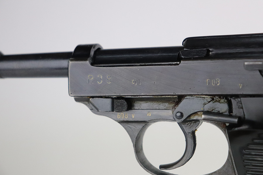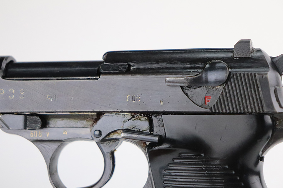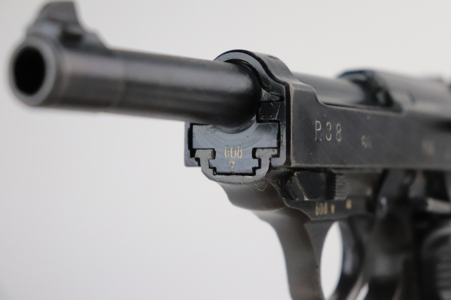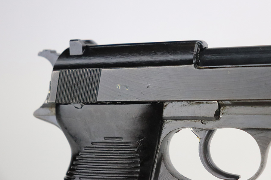 12/21/22 – This is an excellent of a Spreewerk P.38 issued to the Nazi military in October of 1944. The gun is all matching and has the proper “Eagle 88” military proofs. It has a cog hammer. There is an asterisk proof on the barrel, indicating it failed initial inspection and was sent back to the factory for repair. It has retained about 97-98% of its original finish. There is somewhat scratchy wear on the front strap and around the muzzle. Hints of wear on the high edges of the slide. Comes with excellent grips and a jvd/WaA706 magazine. The bore is factory-new. De-cocker is functional. The internals are covered in heavy grease – could use a good cleaning.