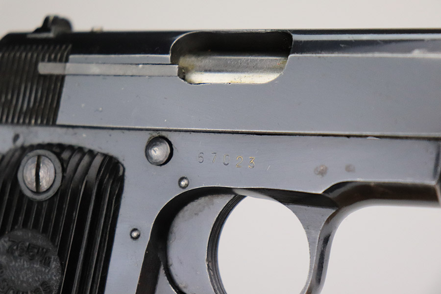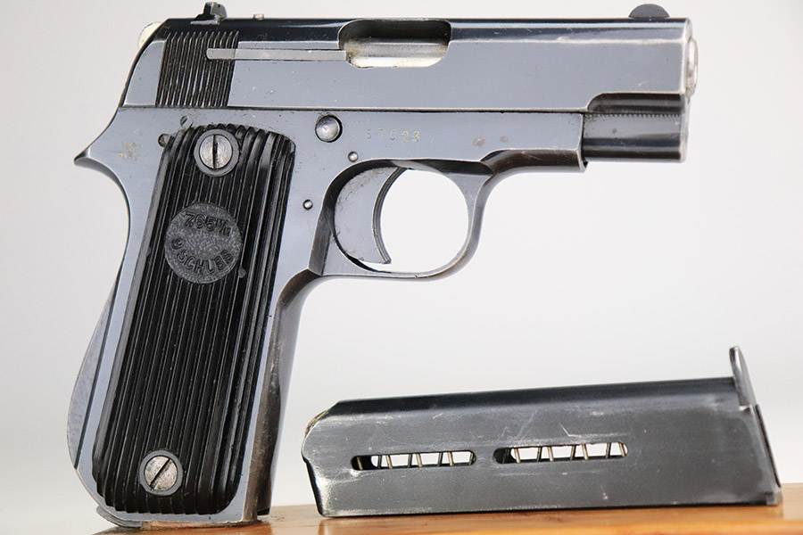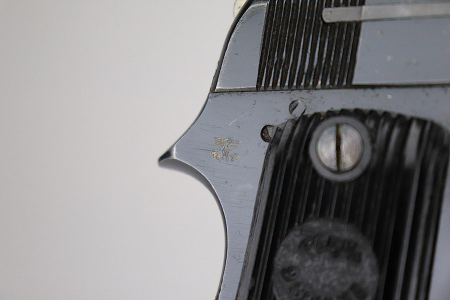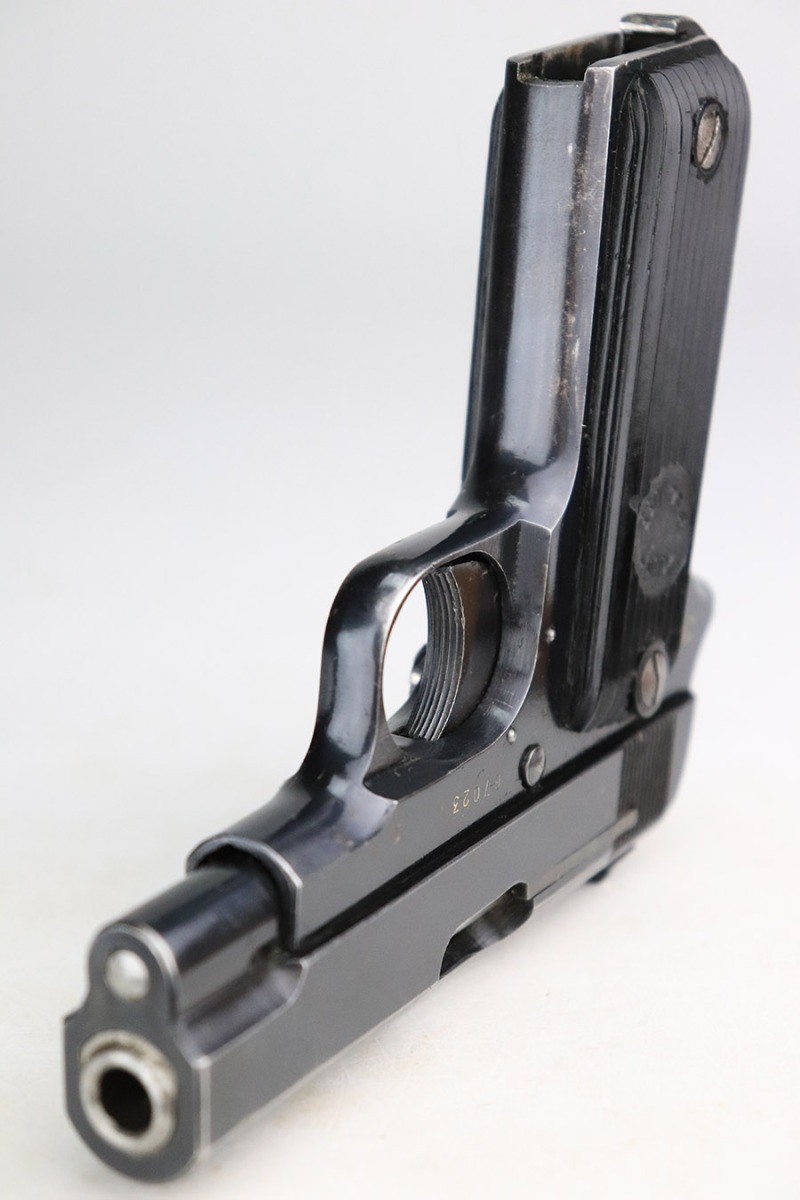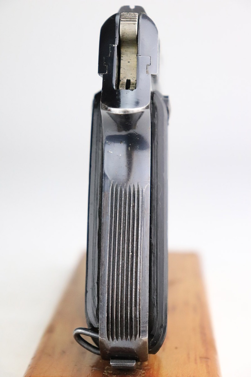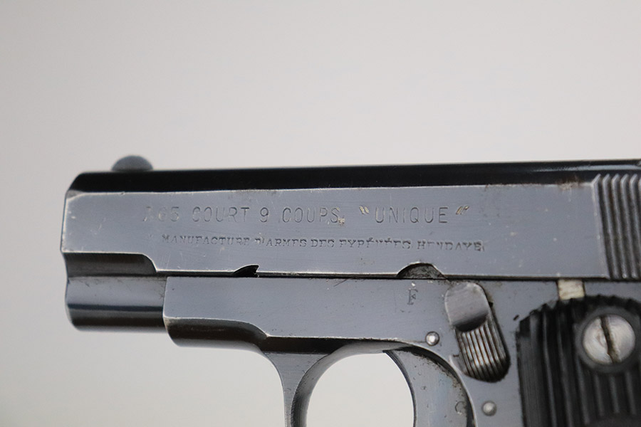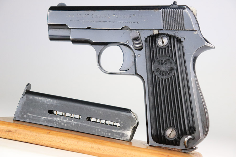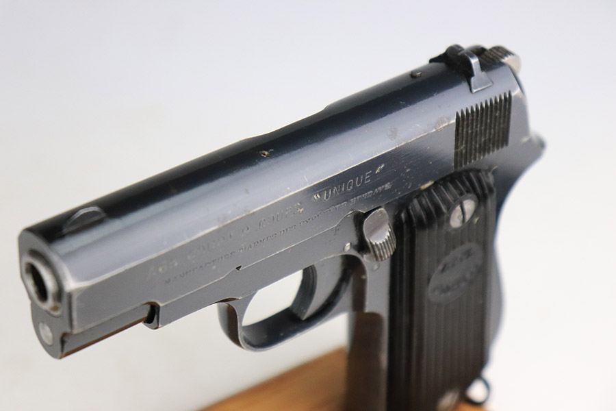 11/8/22 – This is an excellent example of a French Unique Kriegsmodell issued to the Nazi military during WW2. It is all matching and has the proper “Waffen D20” military acceptance proof on the right side of the tang. It has retained about 97% of its original bluing. There is very minor wear around the high edges in general and some light spotty wear on the front strap. There are some very light scratches and tiny dots of discoloration here and there. Comes with excellent period-correct black bakelite grips and one proper magazine. The bore has good rifling with very minor pin-pricking throughout.