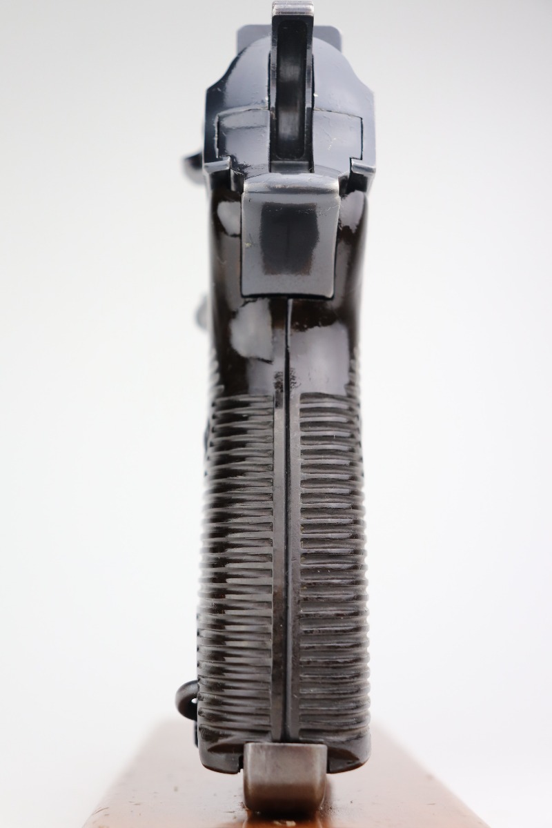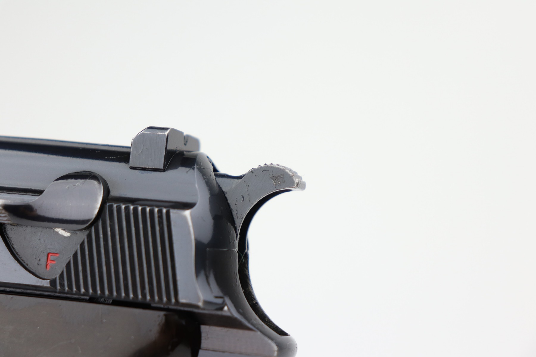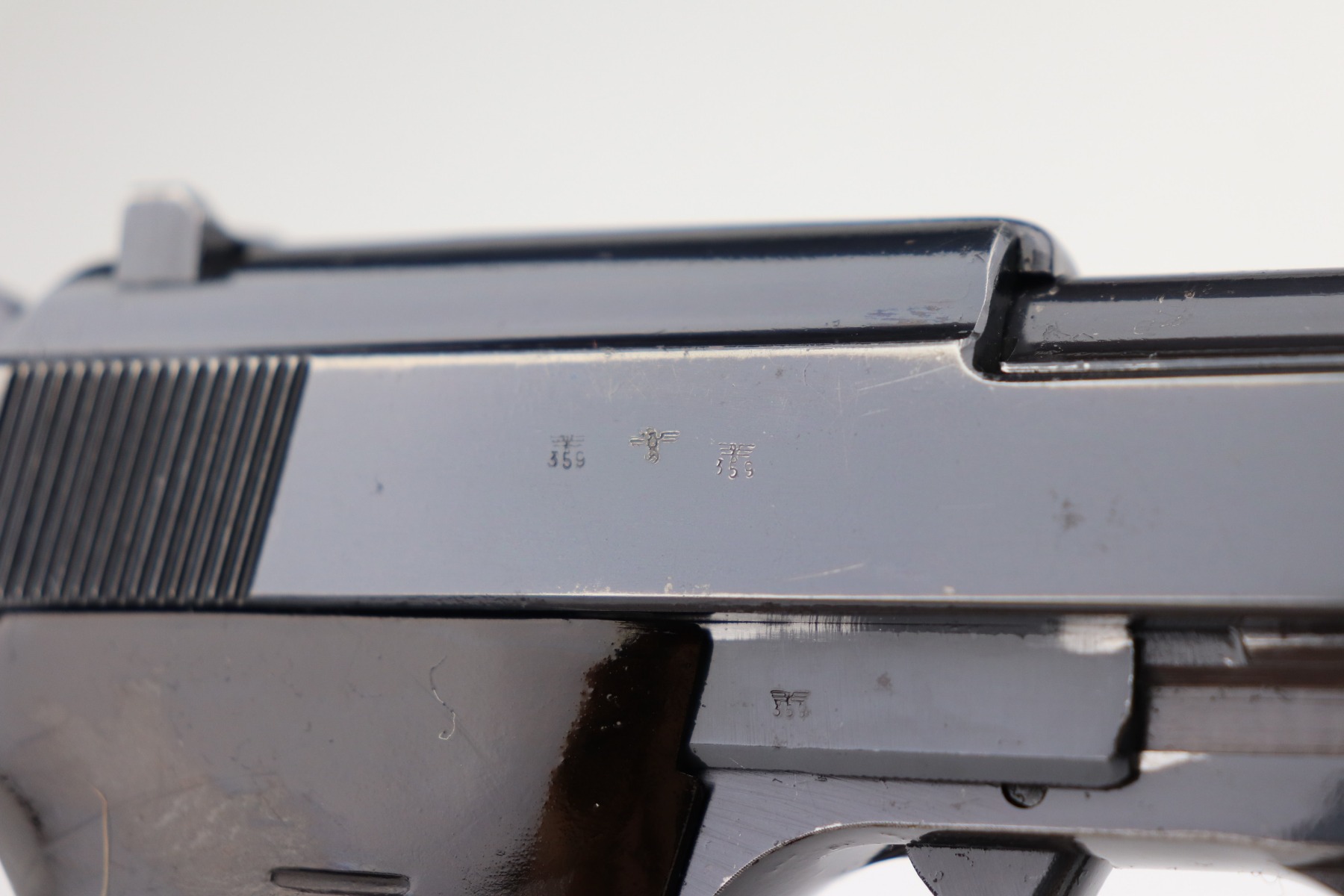 3/11/21 – This is an excellent example of a Walther P.38 issued to the Nazi military in 1941. It is all matching and has the proper “Eagle 359” military proofs. It comes with a period-correct numbered magazine that is mismatched and in the “f” serial block. The gun has retained about 97% of its original bluing. There is minor wear around the muzzle and high edges of the slide. Minor wear and patina on the front strap. Comes with excellent grips. The bore is excellent – shiny with strong rifling. The de-cocker is functional.