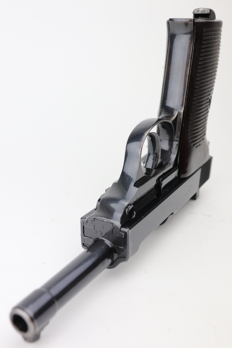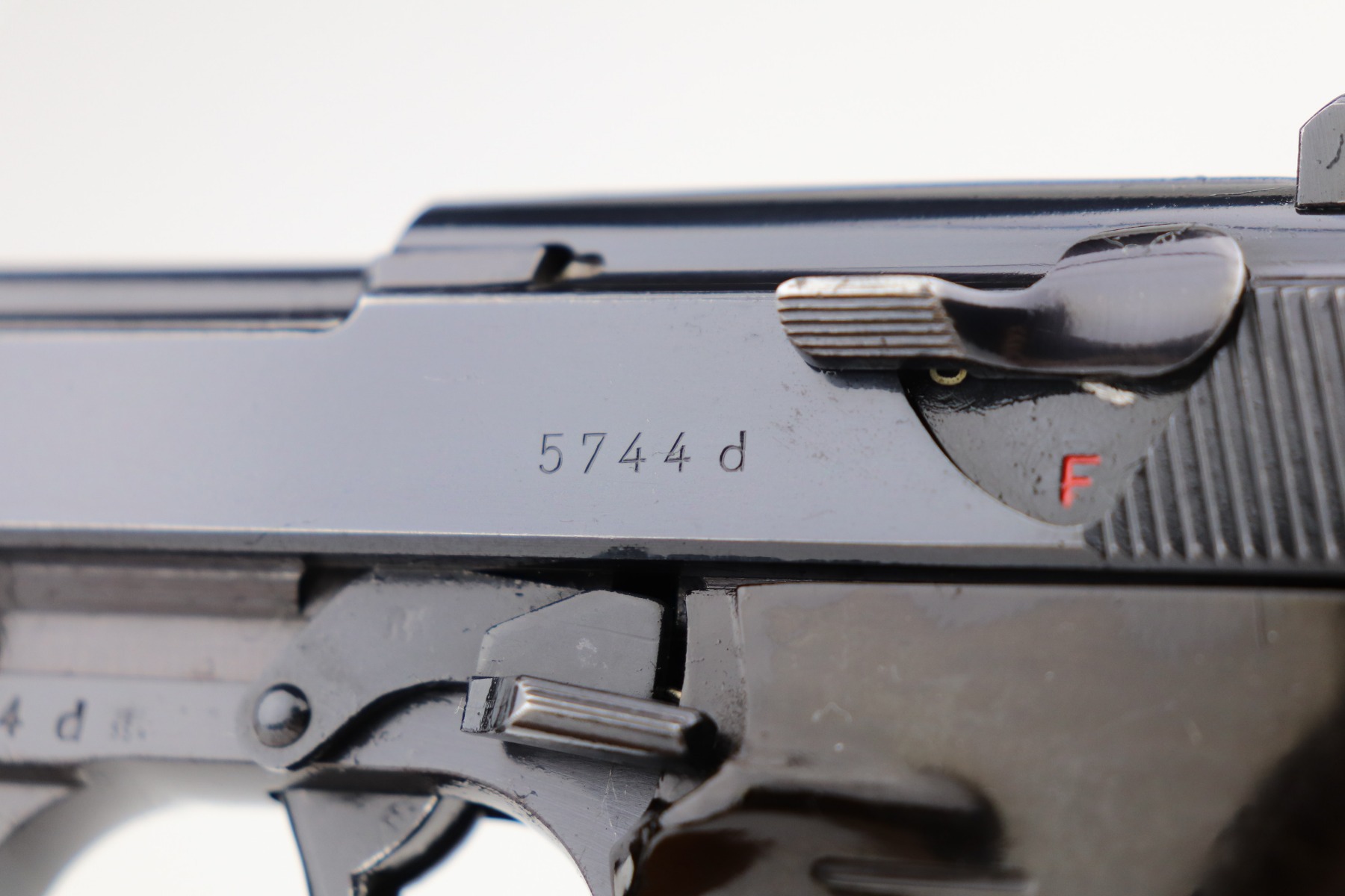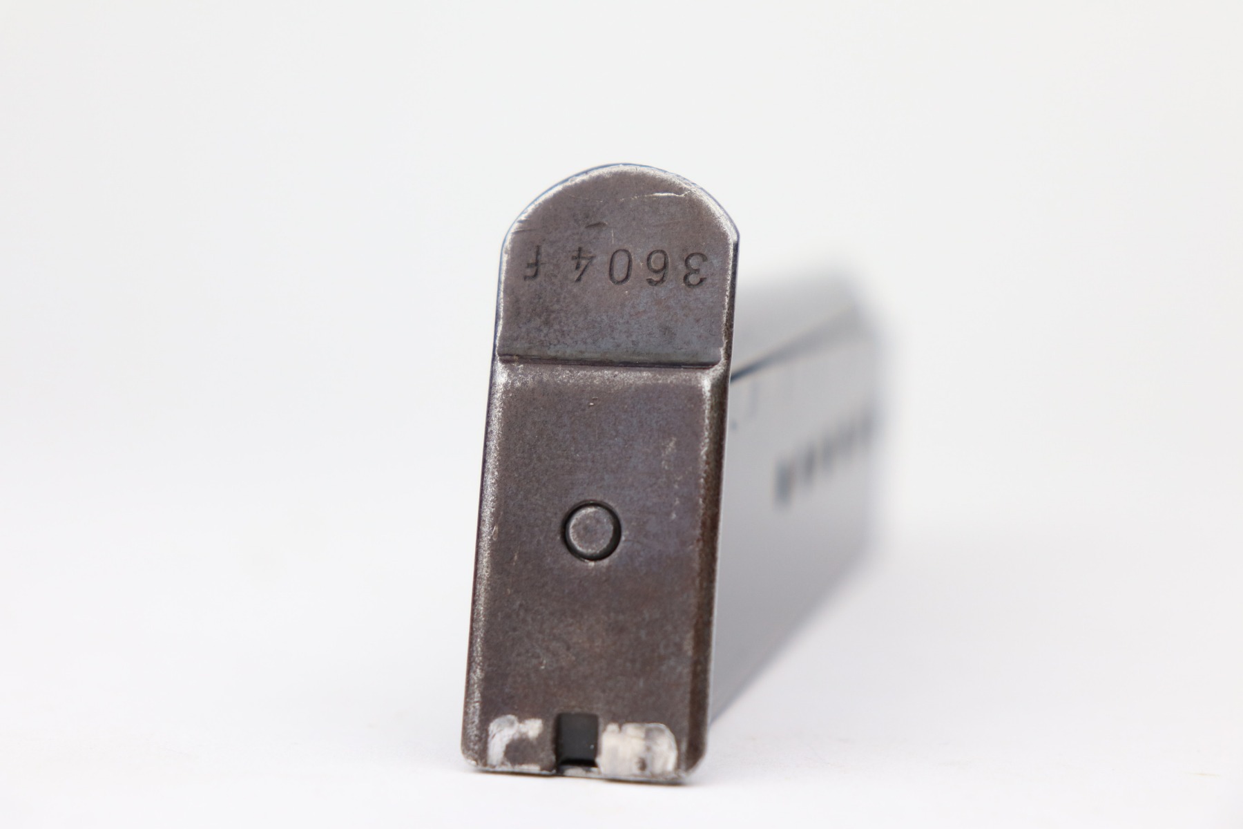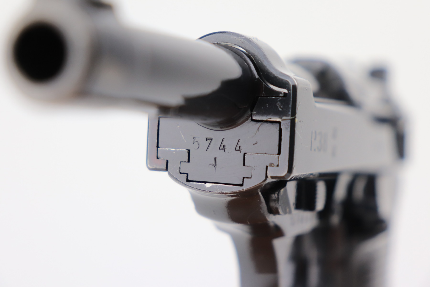 3/11/21 – This is an excellent example of a Walther P.38 issued to the Nazi military in 1941. It is all matching and has the proper “Eagle 359” military proofs. It comes with a period-correct numbered magazine that is mismatched and in the “f” serial block. The gun has retained about 97% of its original bluing. There is minor wear around the muzzle and high edges of the slide. Minor wear and patina on the front strap. Comes with excellent grips. The bore is excellent – shiny with strong rifling. The de-cocker is functional.