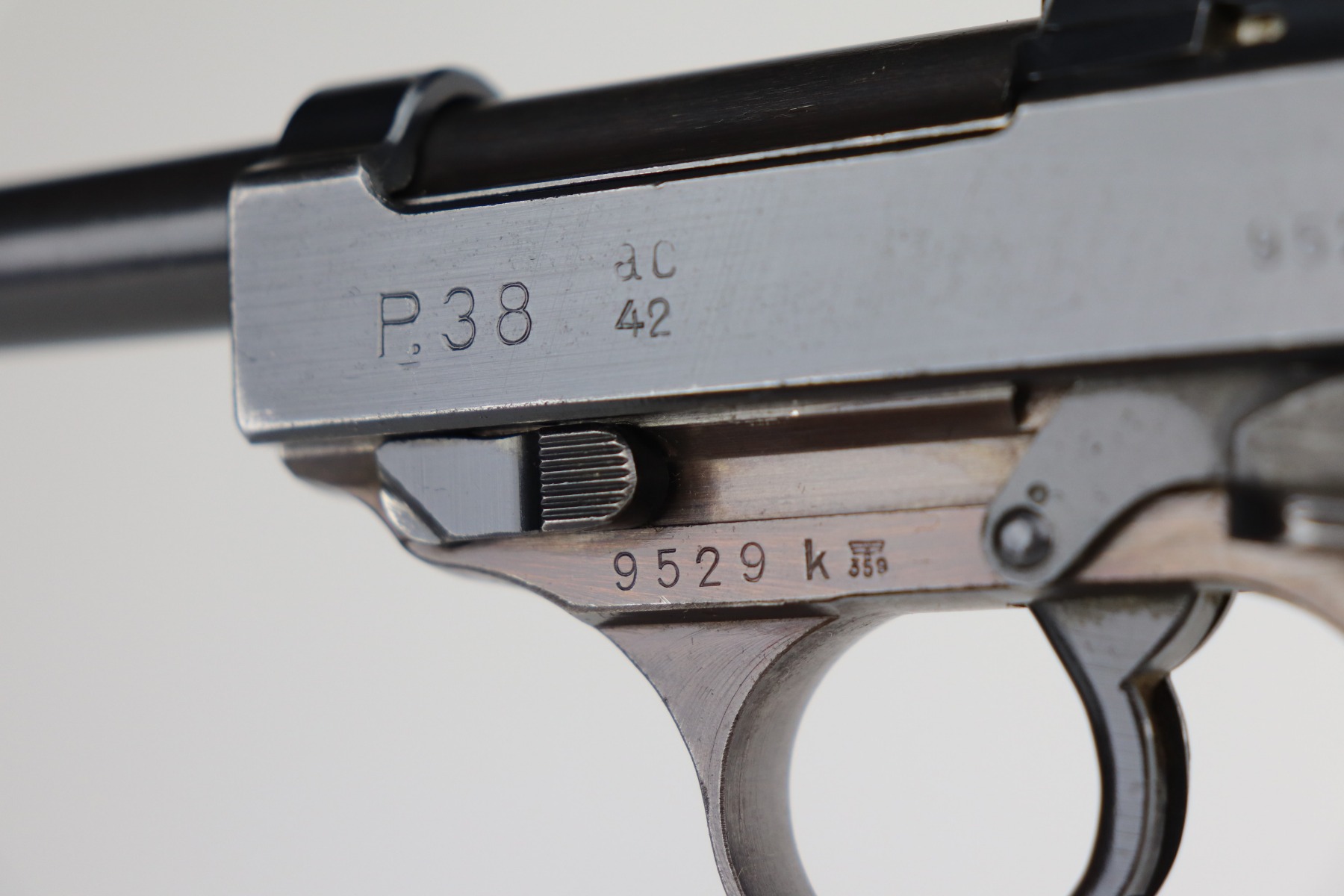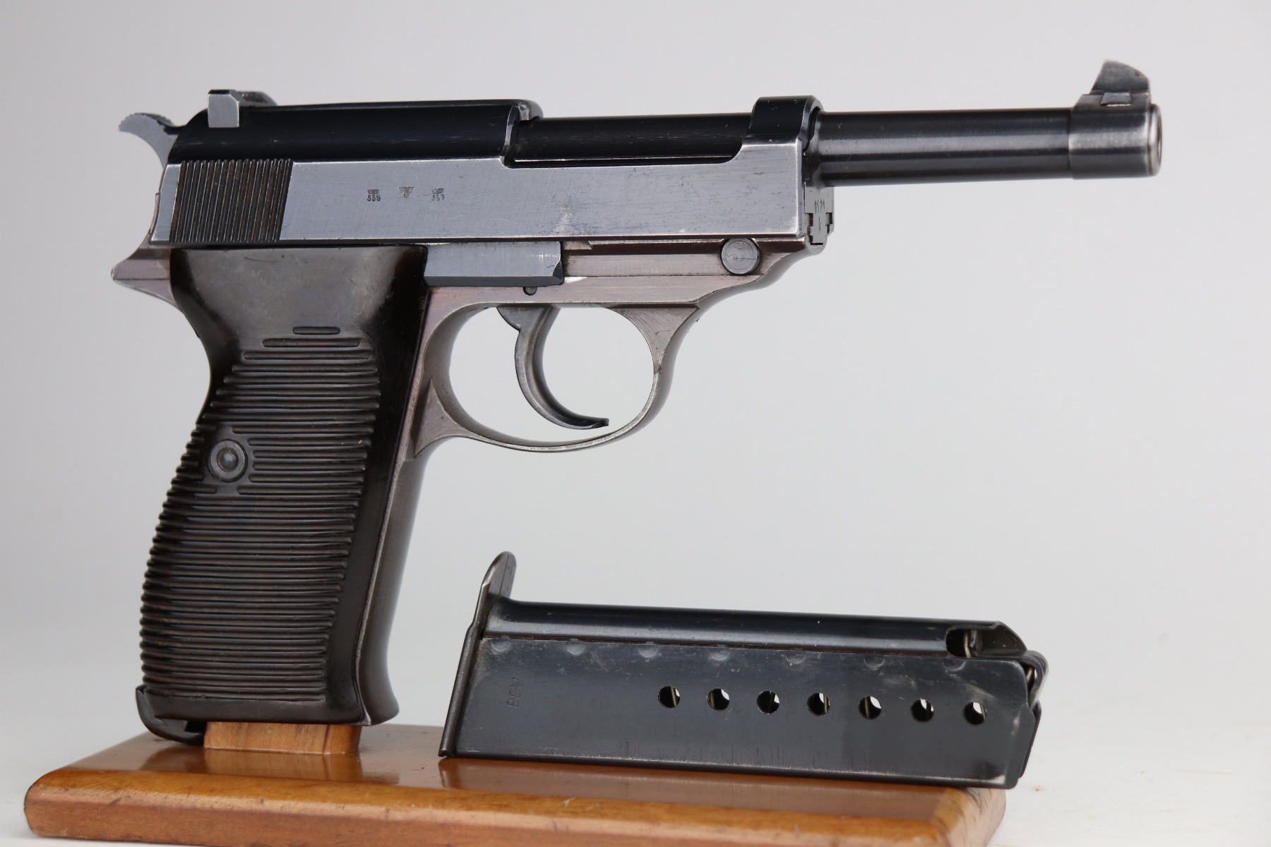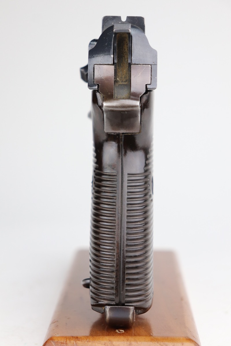 7/8/21 – This is an excellent example of a Walther P.38 issued to the Nazi military in 1942. It is all matching and has the proper “Eagle 359” military proofs. It has retained about 96-97% of its original bluing. The frame has a nice plumb color. There is very minor thinning on the front strap and minor wear around the muzzle and some of the high edges. Comes with excellent grips and a period-correct Walther magazine. The bore is excellent – shiny with strong rifling and very minor pin-pricking throughout. De-cocker is functional.