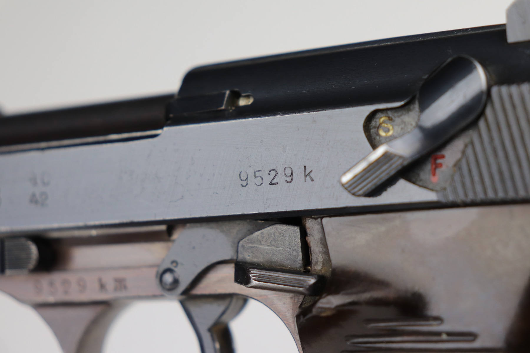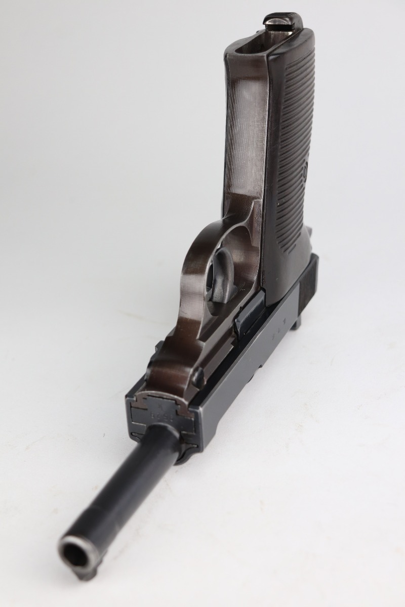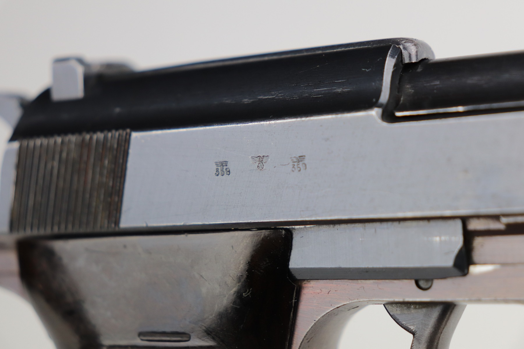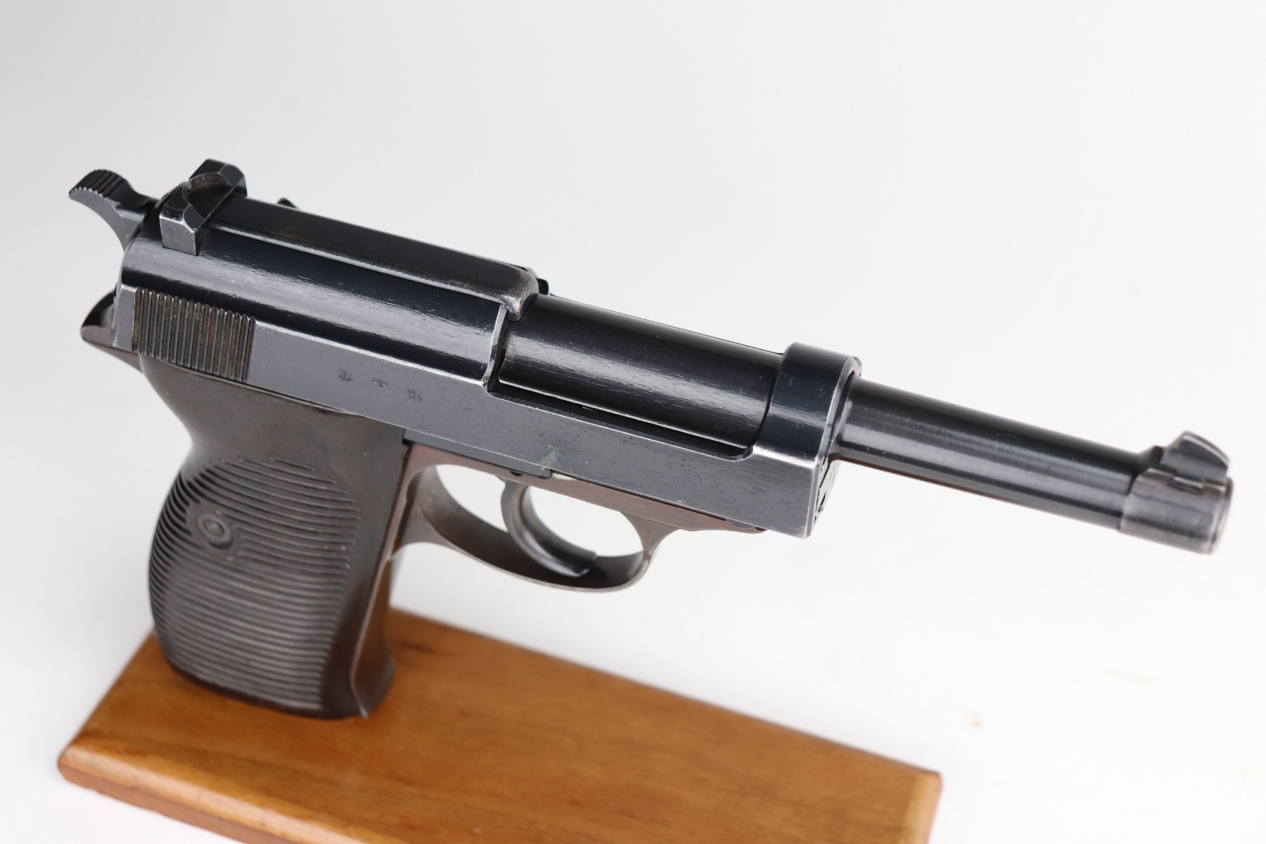 7/8/21 – This is an excellent example of a Walther P.38 issued to the Nazi military in 1942. It is all matching and has the proper “Eagle 359” military proofs. It has retained about 96-97% of its original bluing. The frame has a nice plumb color. There is very minor thinning on the front strap and minor wear around the muzzle and some of the high edges. Comes with excellent grips and a period-correct Walther magazine. The bore is excellent – shiny with strong rifling and very minor pin-pricking throughout. De-cocker is functional.