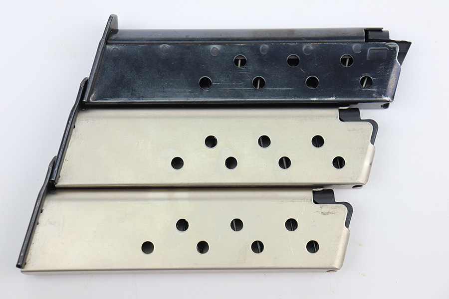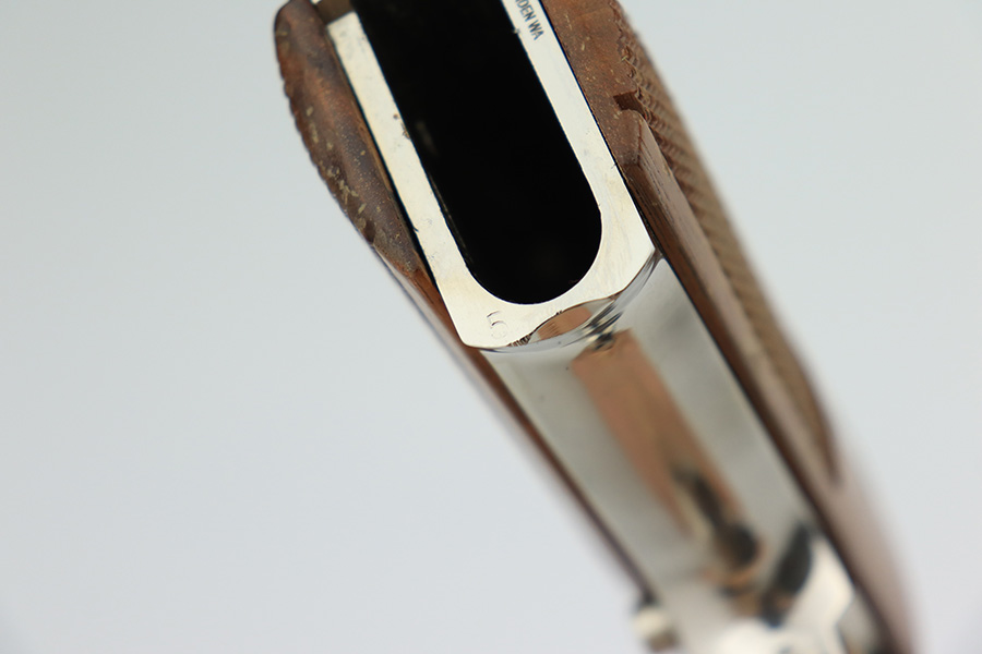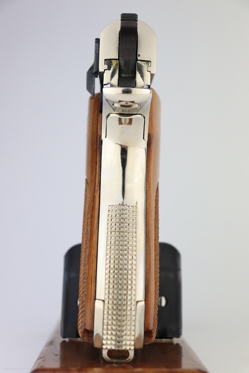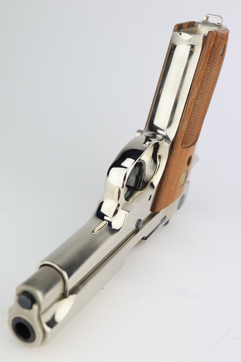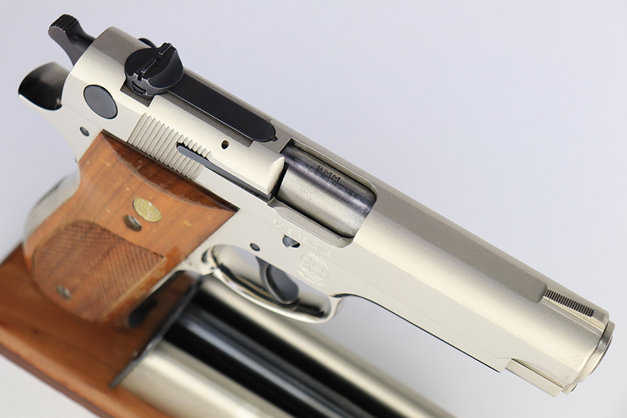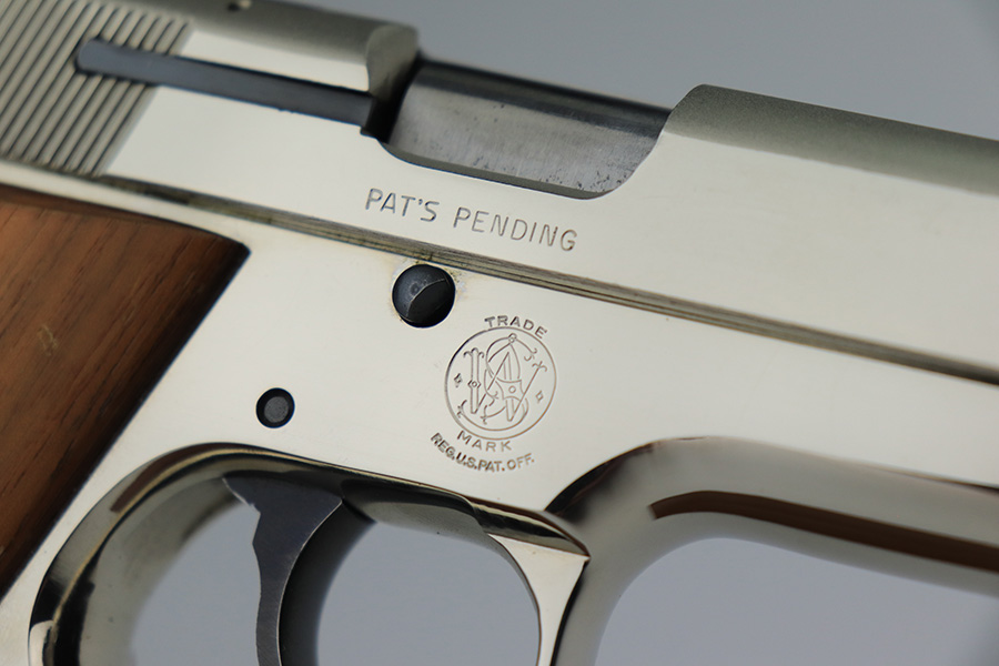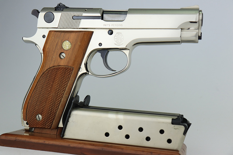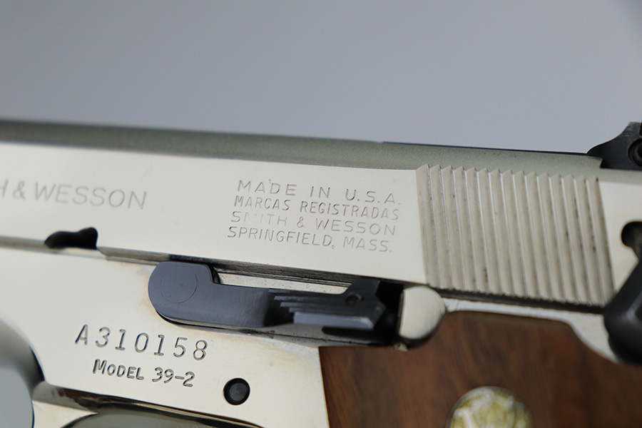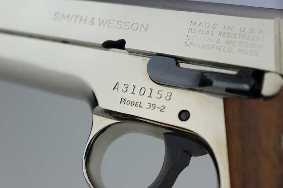 3/20/2023 – This is a fantastic example of a Smith & Wesson Model 39-2. It has nearly all of its original nickeled finish, with just some minor usage wear. Terrific bore with very minimal signs of use. Fitted with a set of excellent hand-checkered Walnut grips, with only a couple of minor scratches on the right panel. The Smith & Wesson Model 39 is a semi-automatic pistol developed for the United States Army service pistol trials of 1954. After the Army abandoned its search for a new pistol, the Model 39 went on the civilian market in 1955 and was the first of Smith & Wesson’s first generation semi-automatic pistols. Anodized aluminum frame with steel slide and curved backstrap. The 39-2 variant was produced from 1970-82 and added several improvements to improve feeding and increase reliability. Serial dates this one to the mid 1970s. Comes with a total of three magazines. Small import mark on underside of mag well.