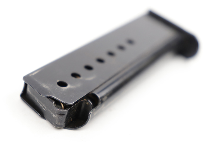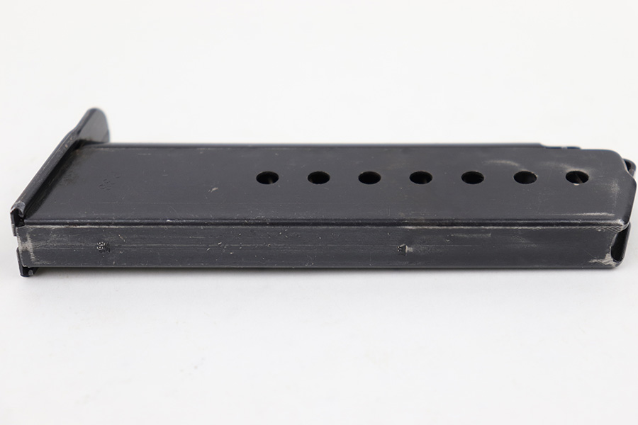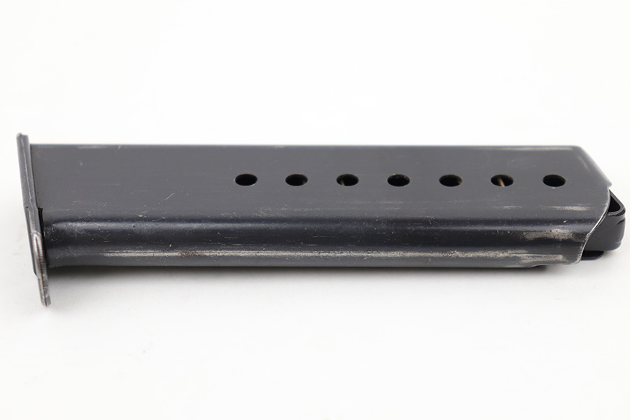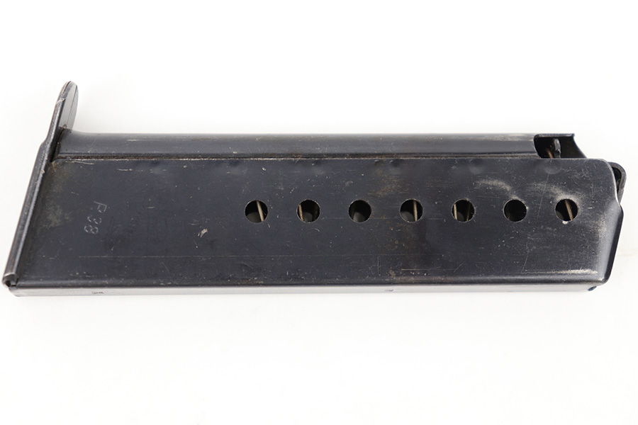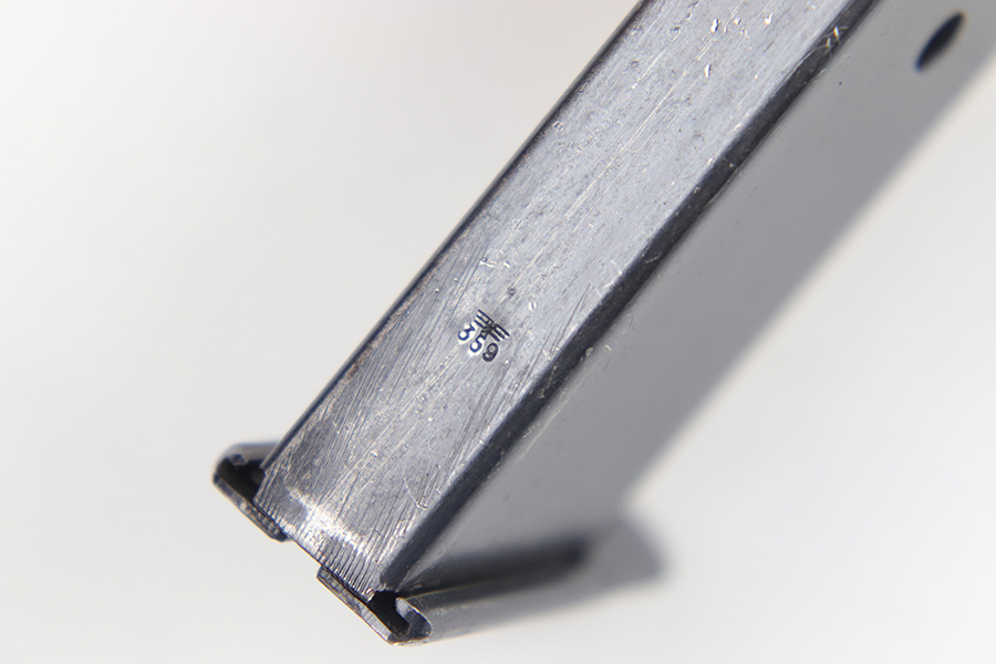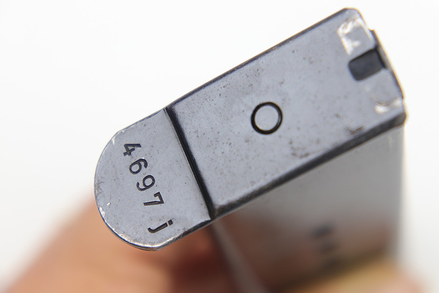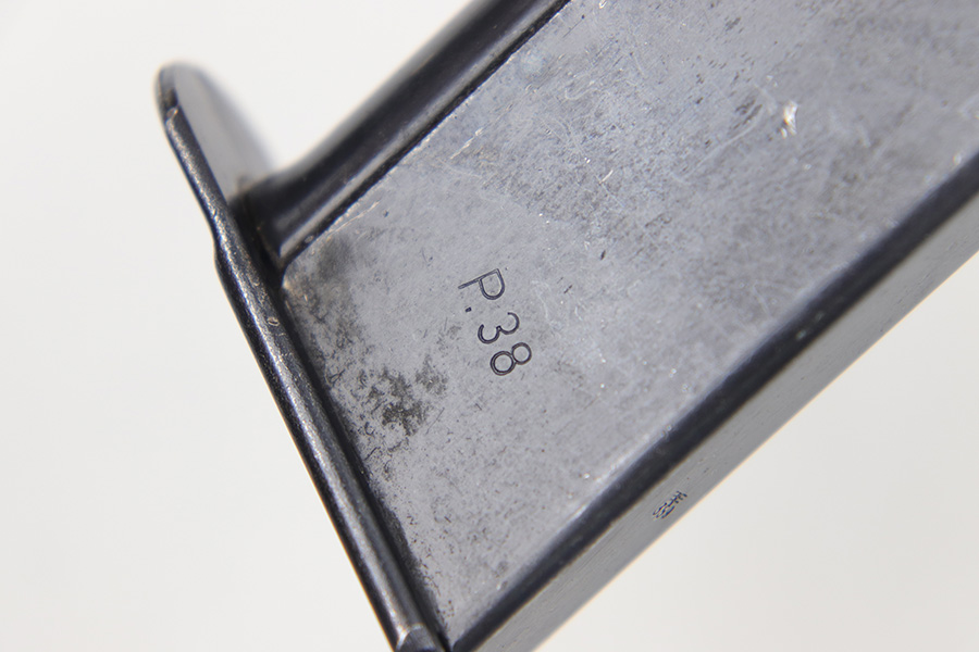4/18/23 – This is an excellent condition, early Walther production P.38 magazine. The magazine has minimal surface wear throughout and is stamped “P.38” on the left side of the tube with two eagle 359 military proof stamps on the spine. The base is serial numbered 4697j. Strong, fully functional spring. Great for an AC 41 or 42 P.38.