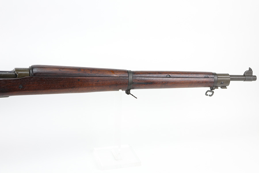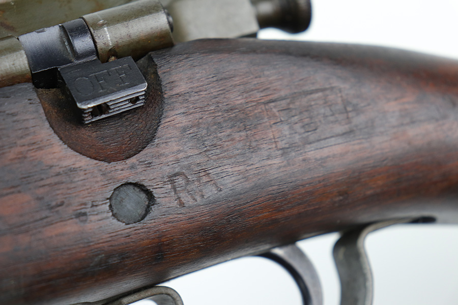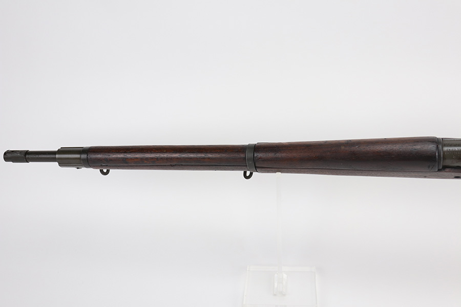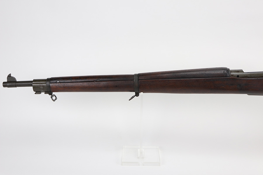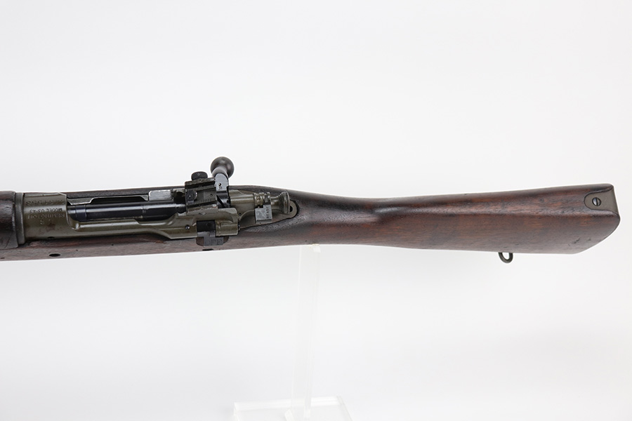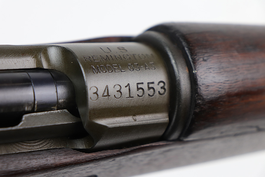 5/22/24 – This is an excellent example of an original Remington Model 1903 bolt action rifle issued to the US military in January of 1943. The barrel is dated February of 1943 and has the proper flaming bomb. The stock is marked with a military cross cannon cartouche, “FJA” inspector initials, and a Remington “RA” stamp. The barrel and receiver are parkerized and the bolt is blued. Bolt is properly marked with the Remington ‘R’, as is the front cap of the wooden stock. The stock is also properly marked with the sub-inspector markings in front of the trigger housing. It has retained most of its original finish with spotty discoloration on the receiver. The stock is excellent with minor dings here and there. The bore is mint.