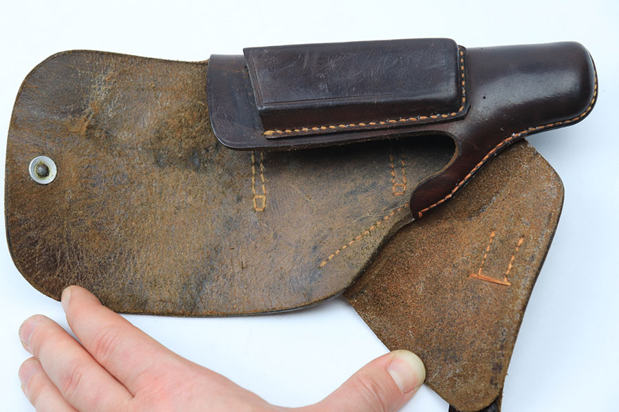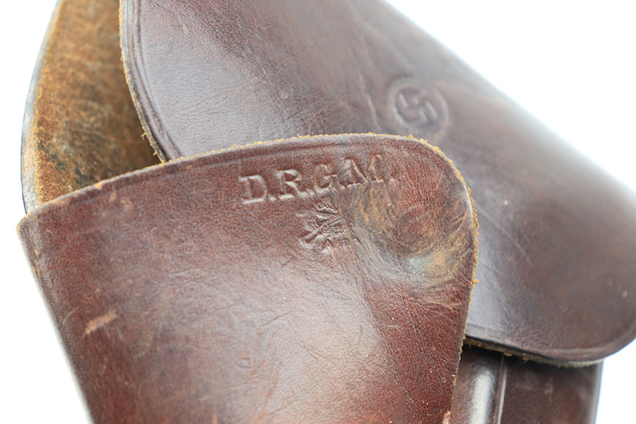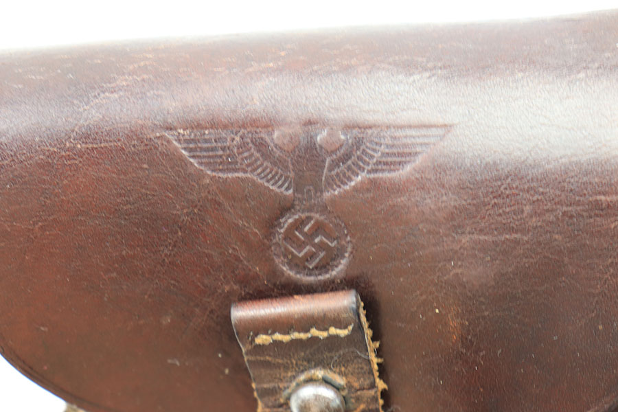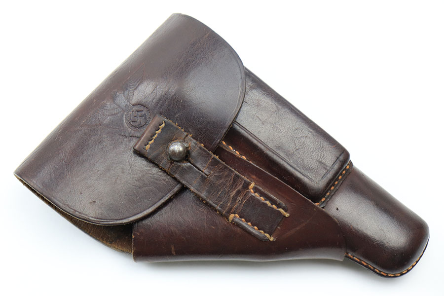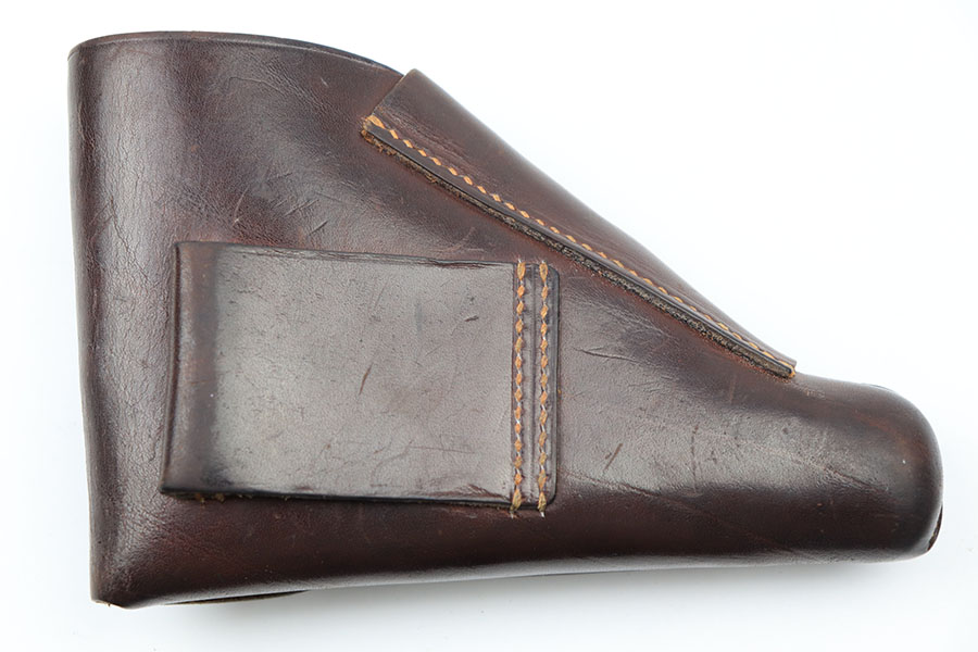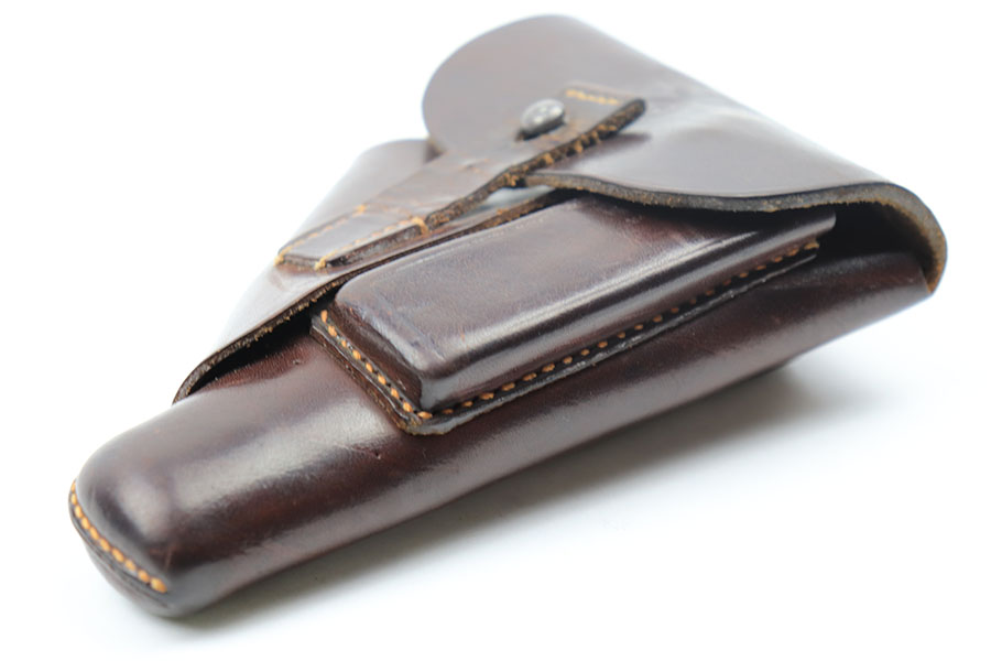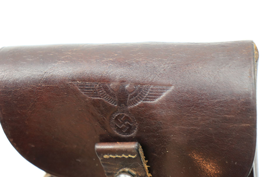 5/6/21 – This is a very nice example of a rare Party Leader PPK holster. AKAH stamped under the closure strap. The interior leather has a faint Walther PPK ink stamp still visible. The front leather has a distinguished, crisply stamped party leader eagle as shown. The leather has some light surface wrinkling on the closure strap, and mild signs of use but no major wear or damage. Strong, tight stitching is all original.