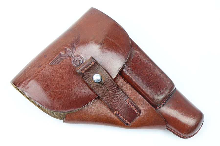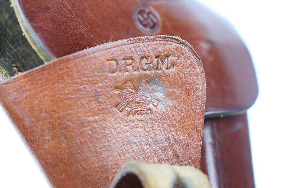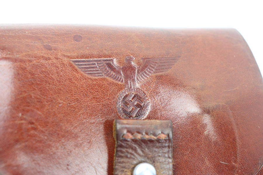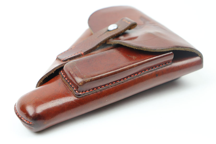 6/17/21 – This is an excellent original AKAH Walther PPK Party Leader holster. Stamped with a distinct party leader eagle on the front leather. Very nice brown leather and clean interior with the ink stamp still visible. AKAH stamped under the closure strap. Excellent stitching as well without issue.
