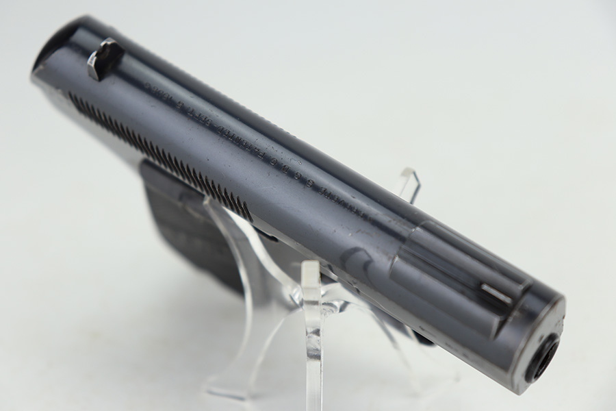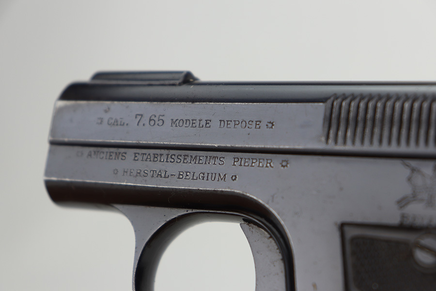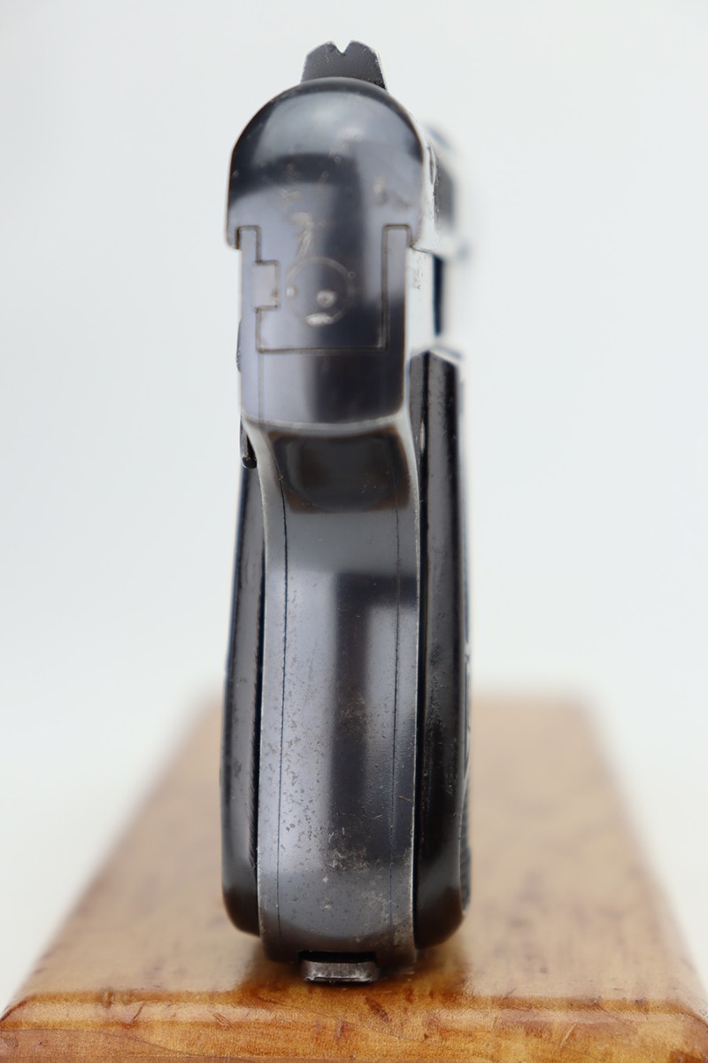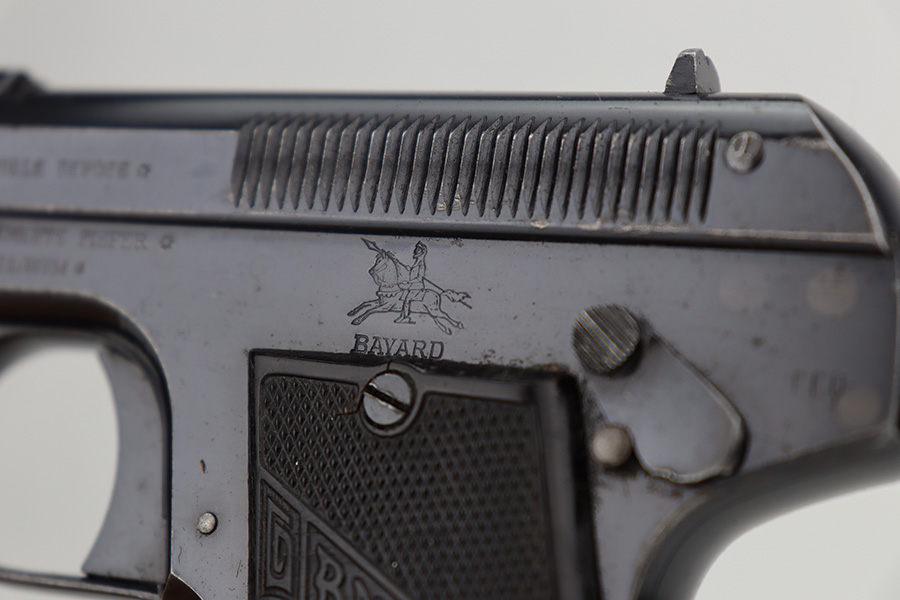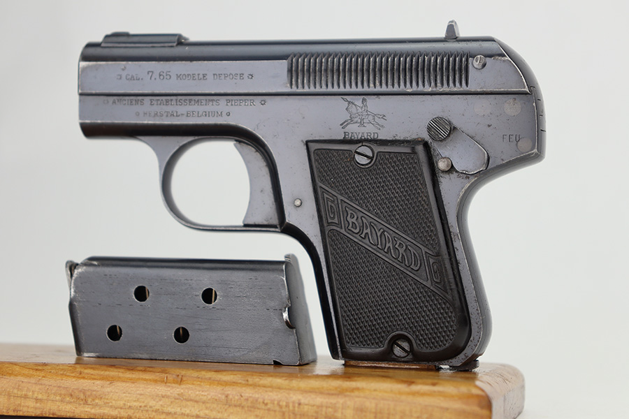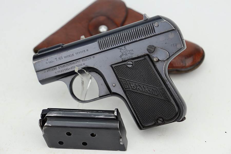 1/1/24 – This is a very nice example of a Belgian Pieper “Bayard” Model 1908 Pocket Pistol. “Model 1908” has become a standard designation for this gun, after the date the U.S. patent was issued, but it was not used by the Pieper company, which always referred to the gun as the Bayard Self-Loading Pistol, or simply as the Bayard Pistol. After 1923, when it was superceded by a newer model, it was referred to as the “Old Model Bayard.” The Bayard pocket models were made by Anciens Etablissements Pieper (A.E.P.) and were produced in three calibers: 6 .35, 7.65, and 9 mm. The first to be produced was the so called Model of 1908 which appeared in late 1909 or early 1910. The first advertisement of this pistol appeared in the April 1, 1910, issue of Schuss and Waffe. The design was based on patents taken out by B. Clarus from 1905 to 1907 and purchased by A.E.P. in 1907 or early in 1908. This particular gun is chambered in 7.65mmmm. This one is all matching and has retained about 95% of its original finish. There is very minor general high edge wear and some light spotty wear on the front strap. Excellent black bakelite grips. Great bore with strong rifling. Comes as a rig with a nice tan leather holster and two magazines.