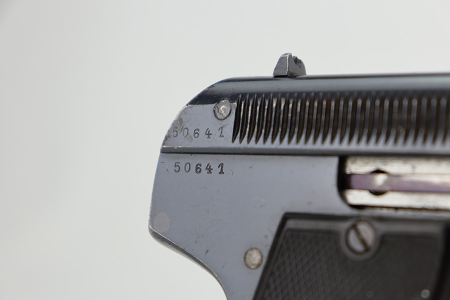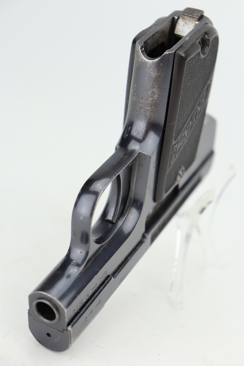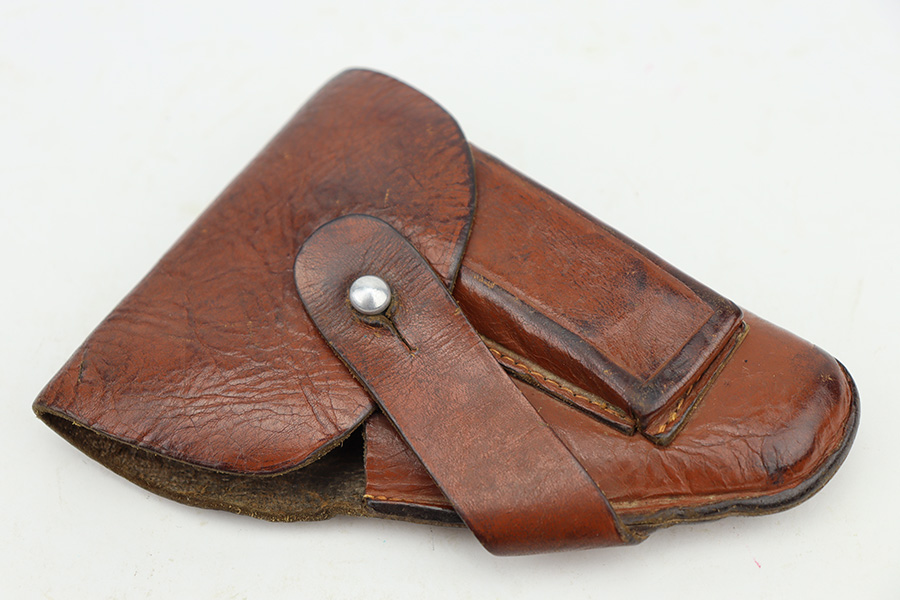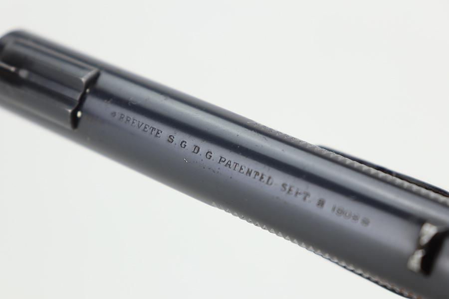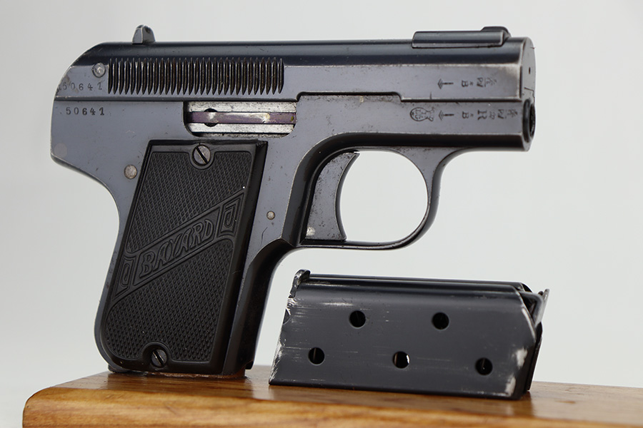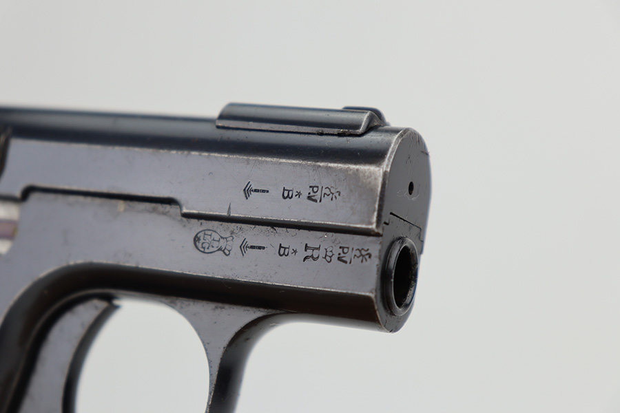 1/1/24 – This is a very nice example of a Belgian Pieper “Bayard” Model 1908 Pocket Pistol. “Model 1908” has become a standard designation for this gun, after the date the U.S. patent was issued, but it was not used by the Pieper company, which always referred to the gun as the Bayard Self-Loading Pistol, or simply as the Bayard Pistol. After 1923, when it was superceded by a newer model, it was referred to as the “Old Model Bayard.” The Bayard pocket models were made by Anciens Etablissements Pieper (A.E.P.) and were produced in three calibers: 6 .35, 7.65, and 9 mm. The first to be produced was the so called Model of 1908 which appeared in late 1909 or early 1910. The first advertisement of this pistol appeared in the April 1, 1910, issue of Schuss and Waffe. The design was based on patents taken out by B. Clarus from 1905 to 1907 and purchased by A.E.P. in 1907 or early in 1908. This particular gun is chambered in 7.65mmmm. This one is all matching and has retained about 95% of its original finish. There is very minor general high edge wear and some light spotty wear on the front strap. Excellent black bakelite grips. Great bore with strong rifling. Comes as a rig with a nice tan leather holster and two magazines.