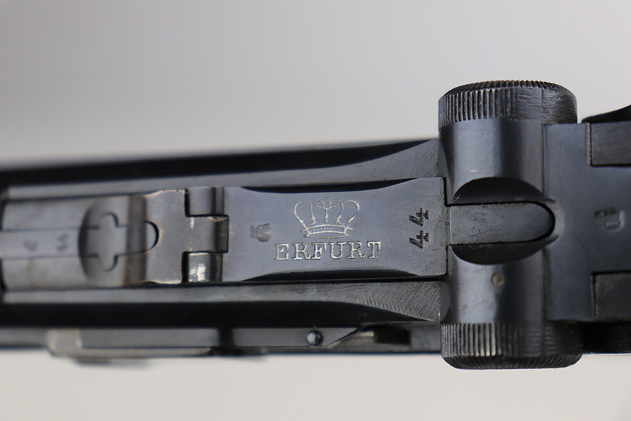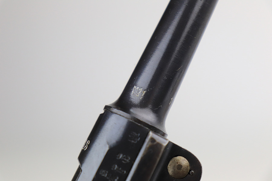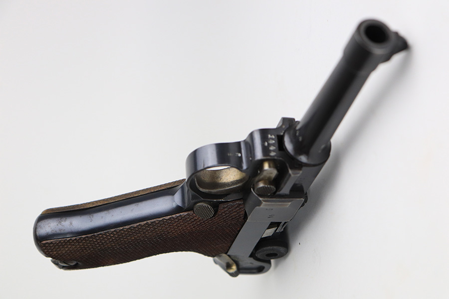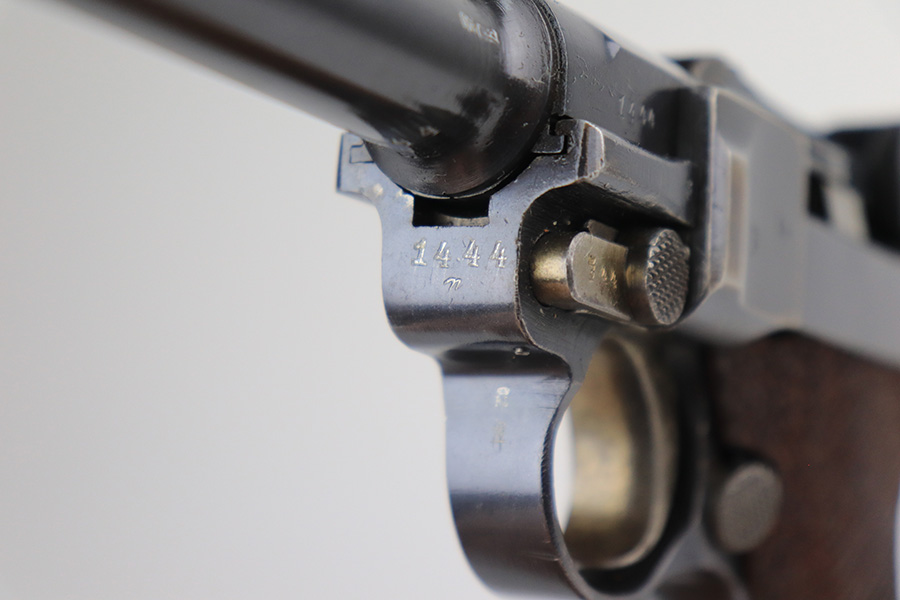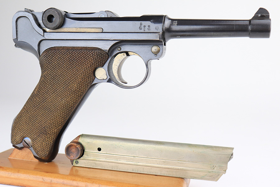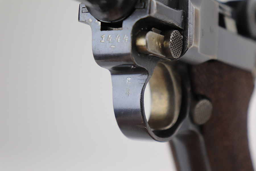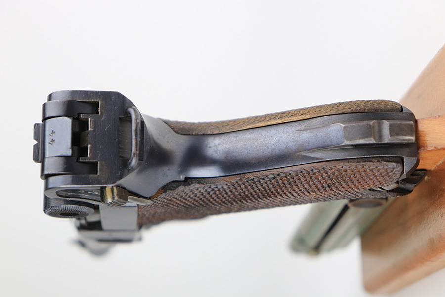 11/24/21 – This is a beautiful Erfurt Luger from 1918 that was sent to the German Army at the end of World War I, then to their police following the war. It has all matching numbers, including the grips and magazine, which was likely numbered at the police arsenal. It’s not unit marked but does have the police sear safety intact. The bluing rates at about 97% with most of the wear on the sideplate, and tiny hints of edge wear otherwise. Minor oxidation is visible on the grip straps. Strong, shiny bore. Excellent grips with sharp checkering.