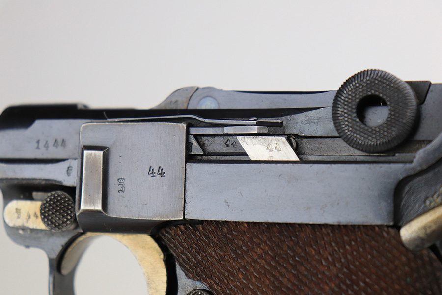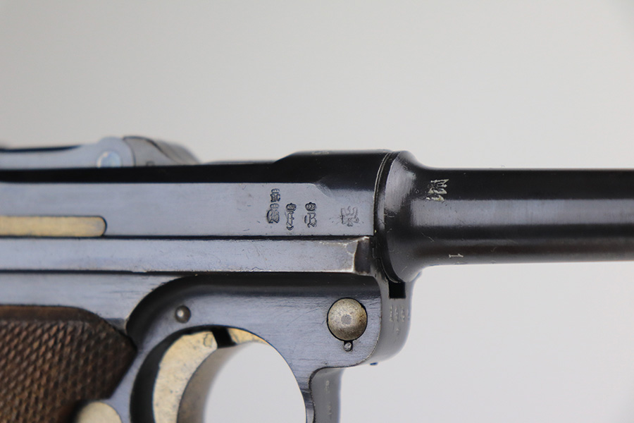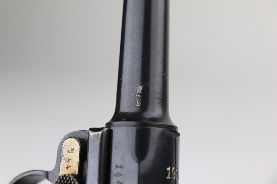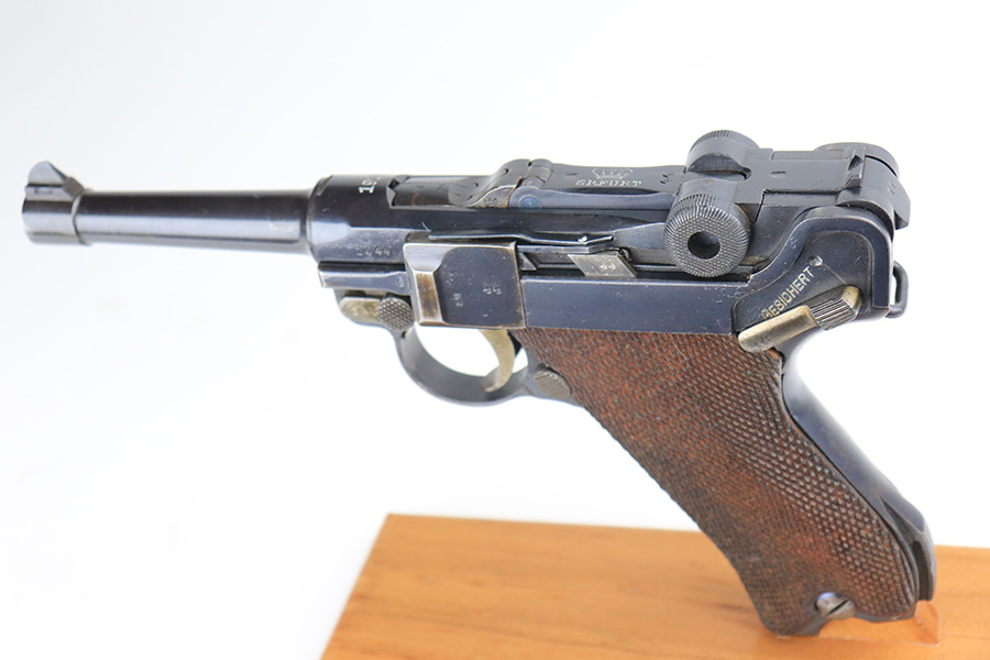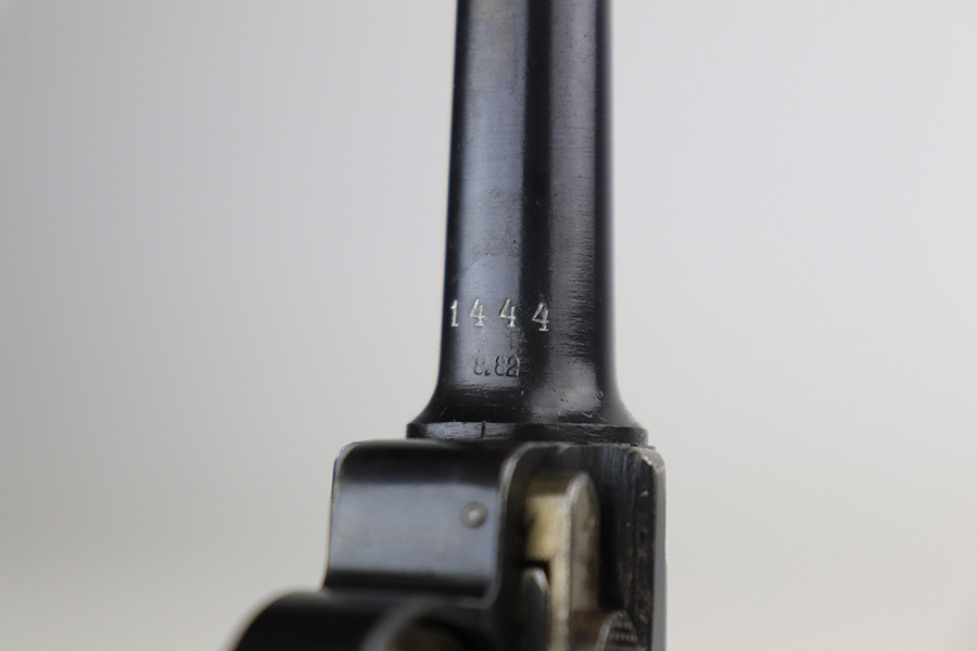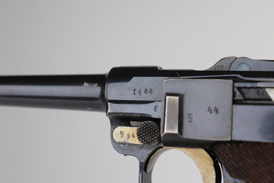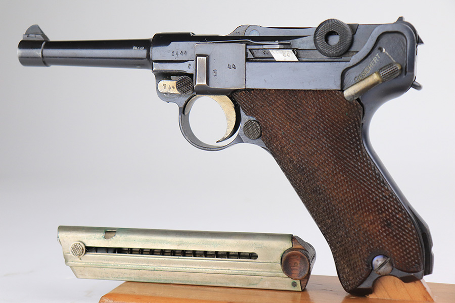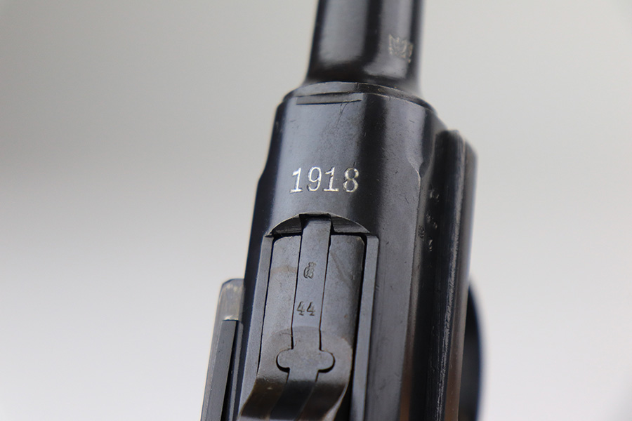 11/24/21 – This is a beautiful Erfurt Luger from 1918 that was sent to the German Army at the end of World War I, then to their police following the war. It has all matching numbers, including the grips and magazine, which was likely numbered at the police arsenal. It’s not unit marked but does have the police sear safety intact. The bluing rates at about 97% with most of the wear on the sideplate, and tiny hints of edge wear otherwise. Minor oxidation is visible on the grip straps. Strong, shiny bore. Excellent grips with sharp checkering.