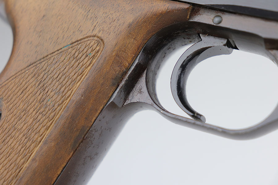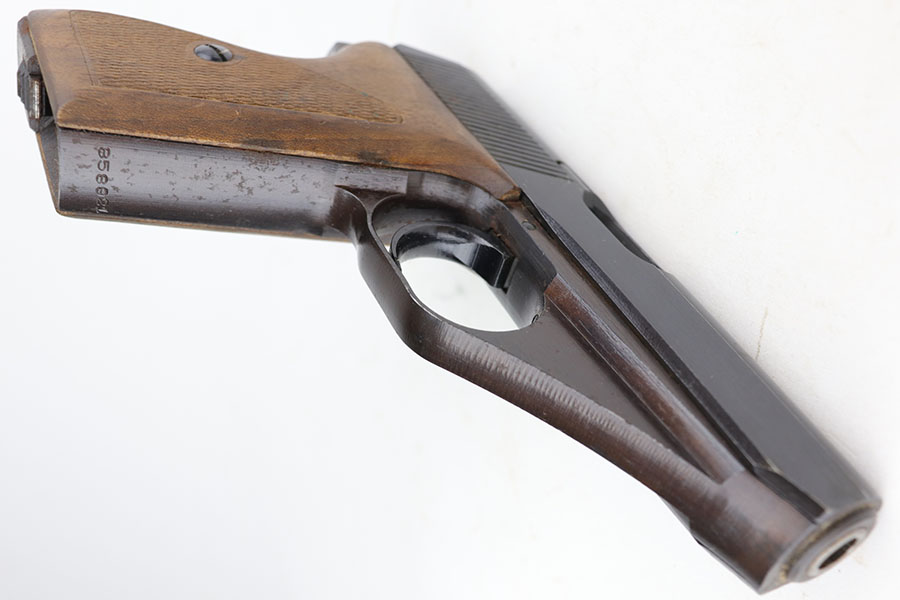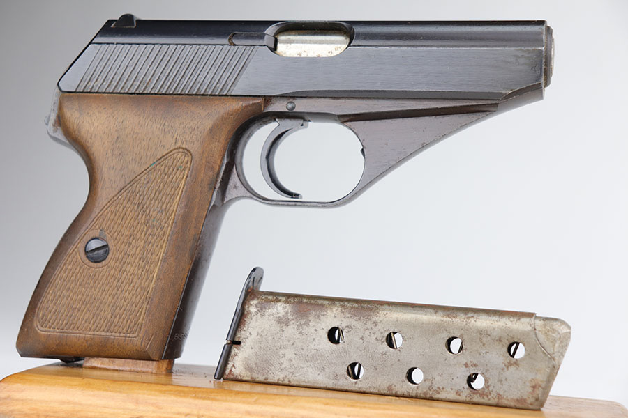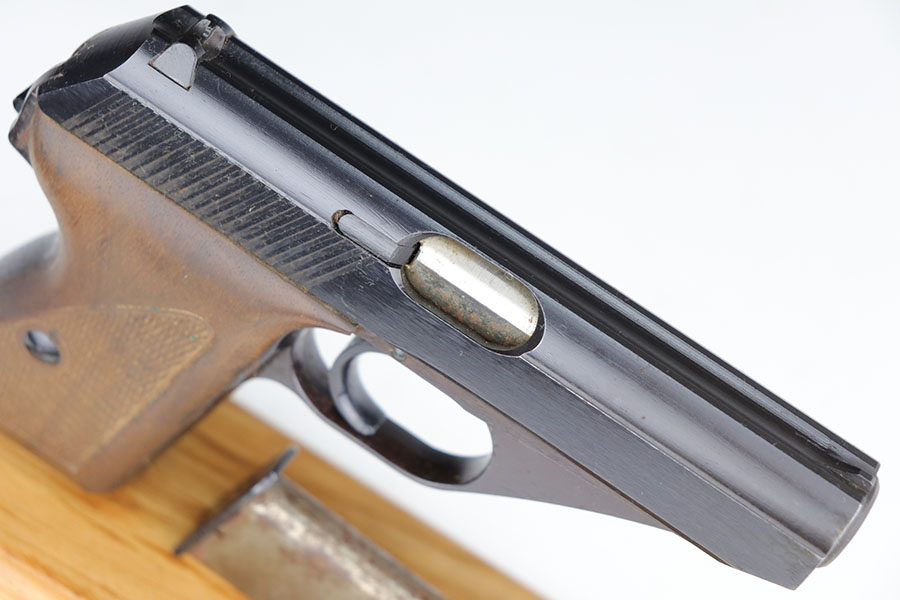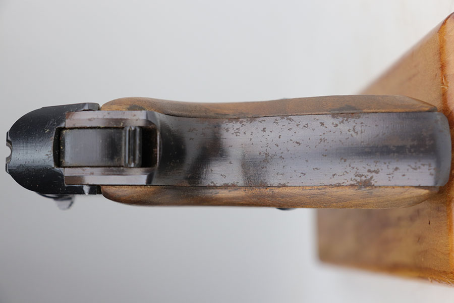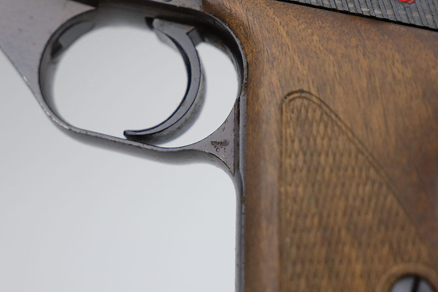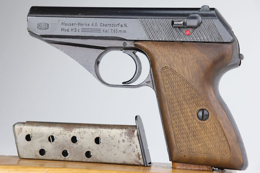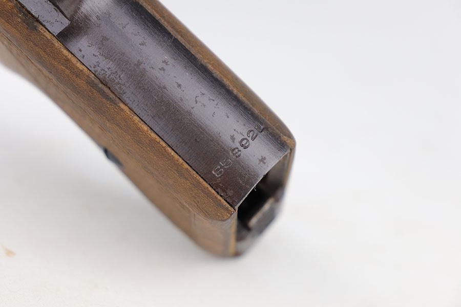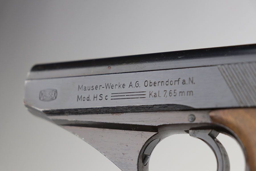 1/19/21 – This is a police Mauser HSc from 1943 with minty, original bluing. There’s 99+% of the military blue remaining, and the pistol has a mint bore. So while it appears very lightly used, it does have oxidation in a few areas so was likely stored in a humid place at some point in its life. Trigger guard is marked with the Police Eagle/L proof. Excellent grips with no chips or cracks. Note that the magazine in the photos had a mechanical issue so we replaced it with an original magazine that was in better condition.