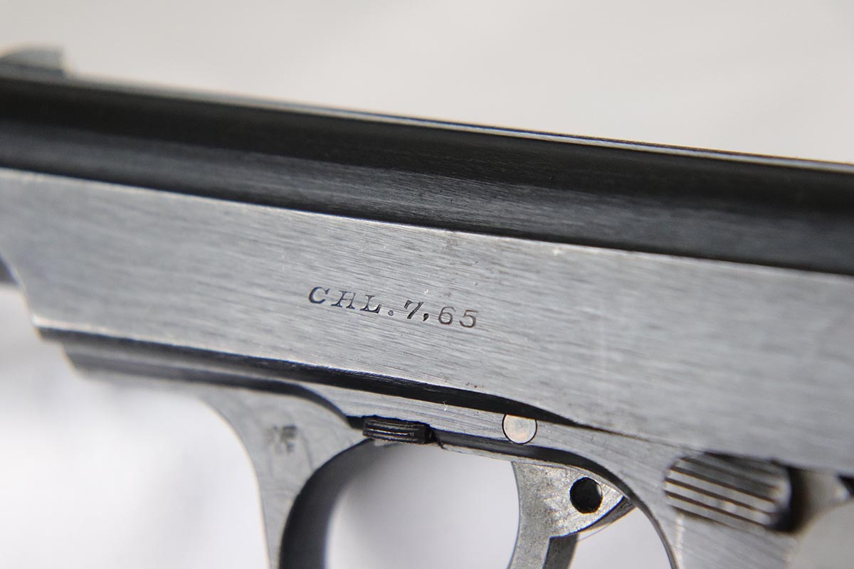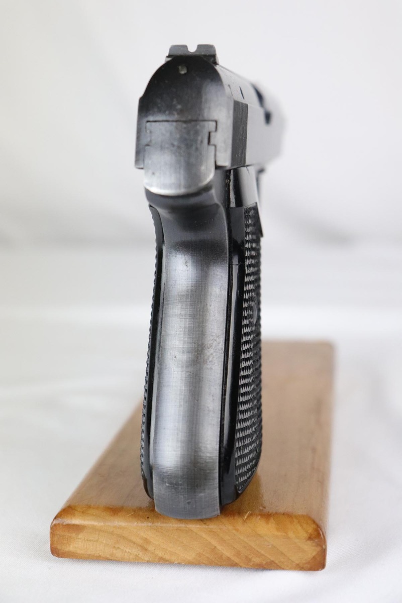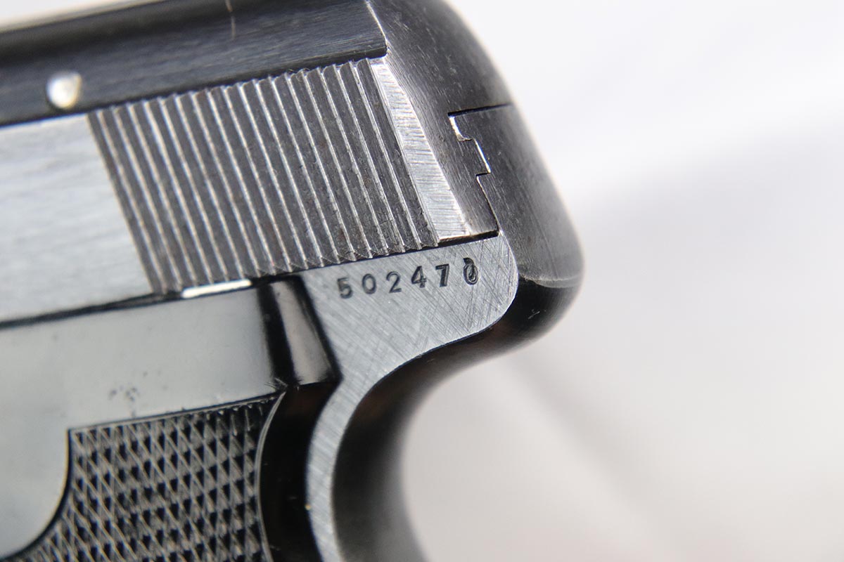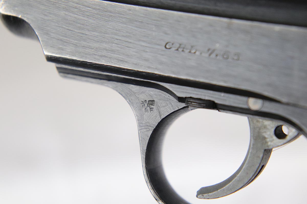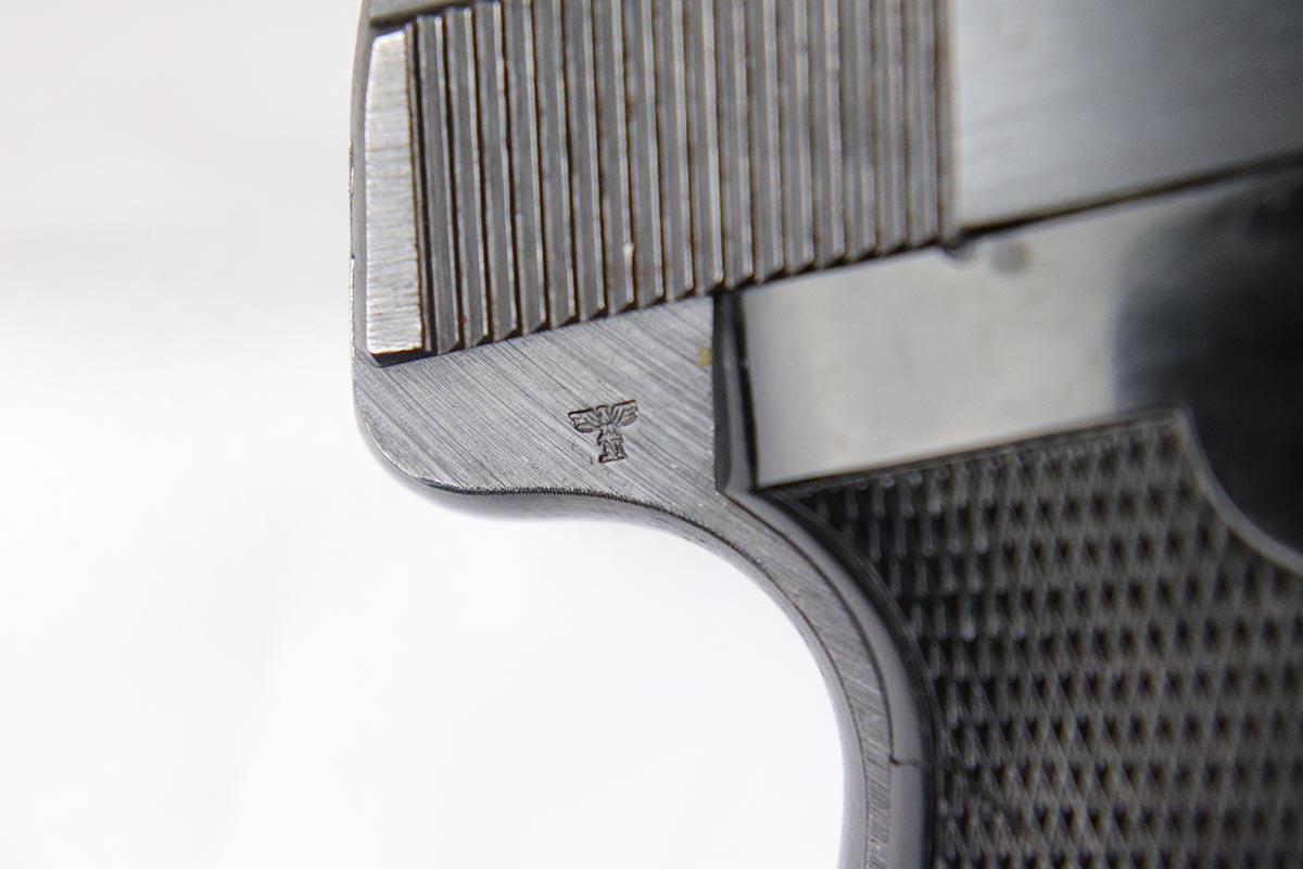 5/2/18 – This is an excellent example of a scarce Police issued Sauer 38h with Eagle/F proof on the trigger guard.  The original finish rates at 98% with only minor muzzle wear on either side of the slide.  There were only an estimated 10,000 of this variation produced.  Excellent grips and bore.  Half-moon magazine.