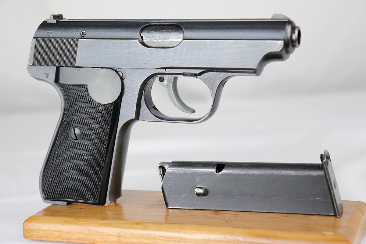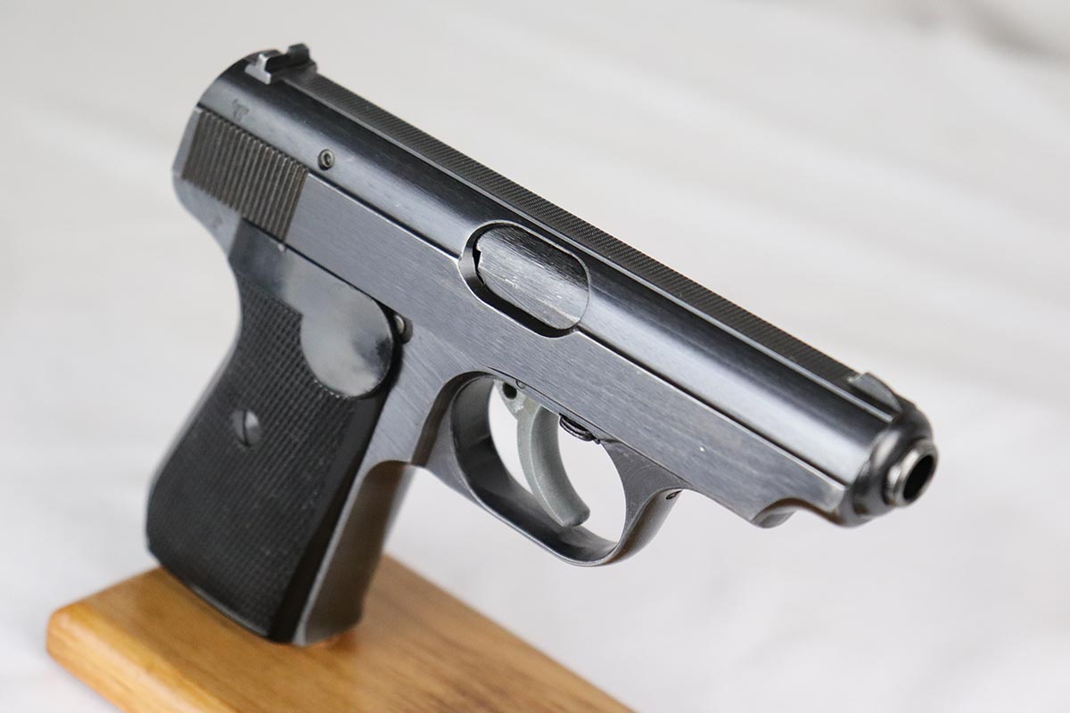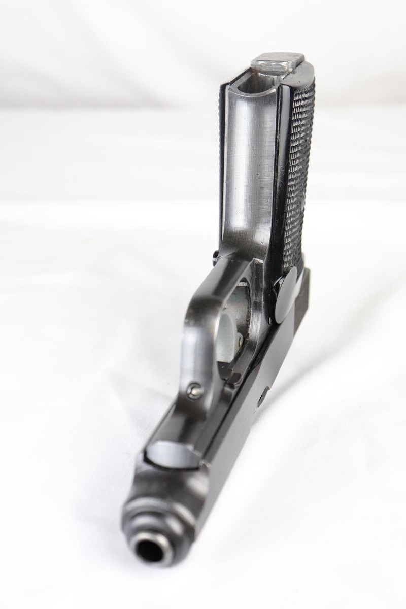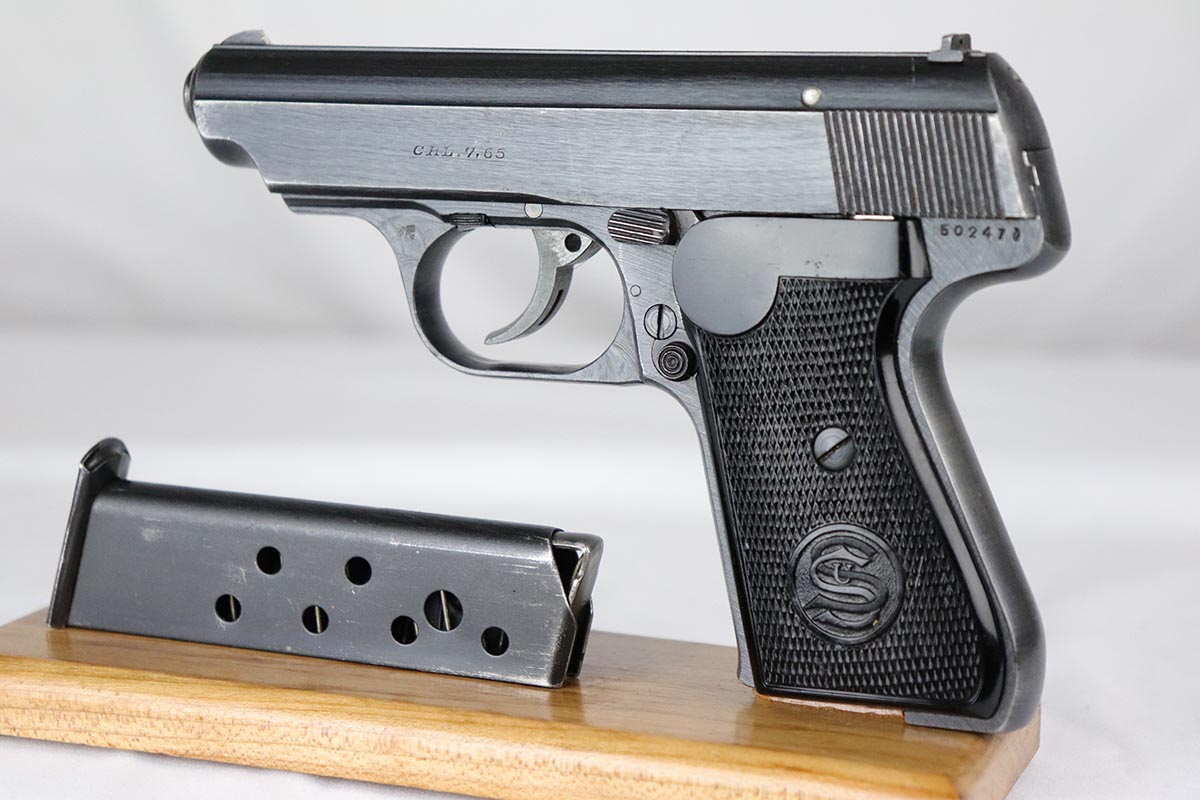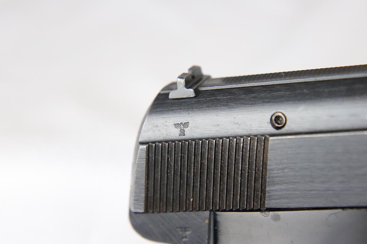 5/2/18 – This is an excellent example of a scarce Police issued Sauer 38h with Eagle/F proof on the trigger guard.  The original finish rates at 98% with only minor muzzle wear on either side of the slide.  There were only an estimated 10,000 of this variation produced.  Excellent grips and bore.  Half-moon magazine.