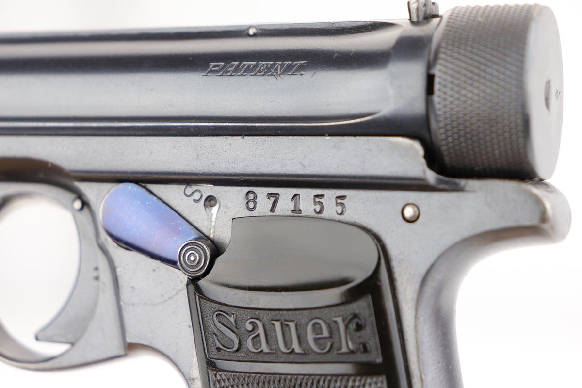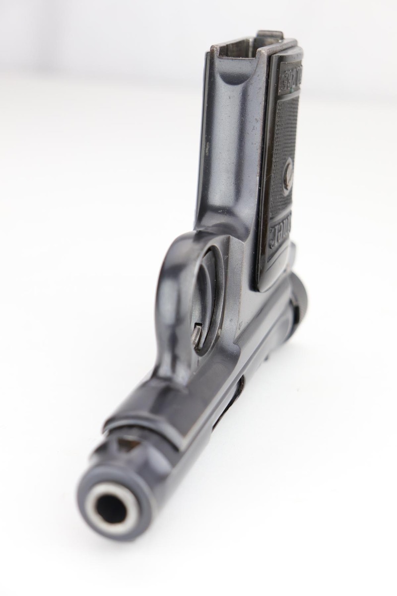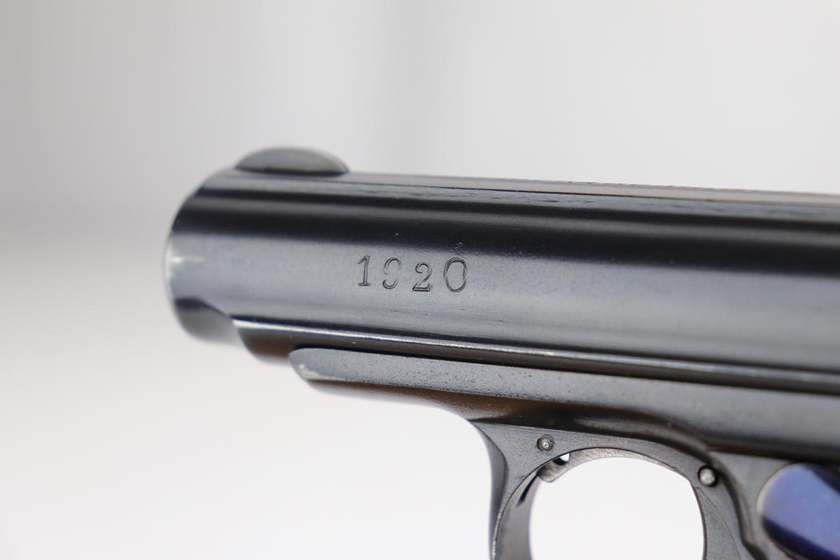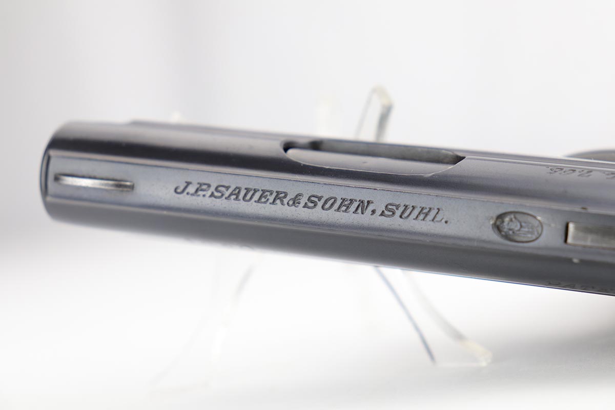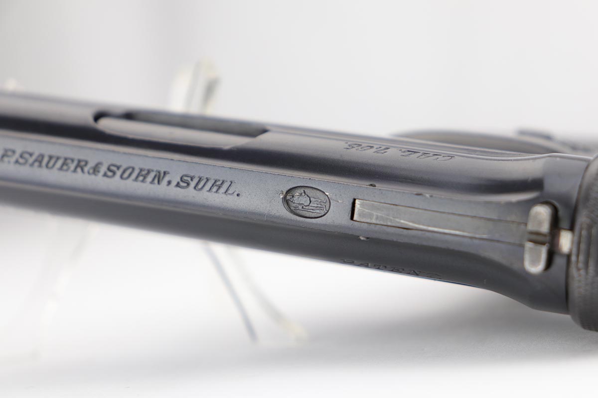 1/28/20 – This is an excellent Sauer M1913 that was likely Police issued following World War I given the 1920 proof on slide and matching numbered magazine. The bluing rates at about 98% with a bit of high edge wear on the left side, and a little more on the front strap/trigger guard. Crown/N proofs and very nice grips. Strong, shiny bore.