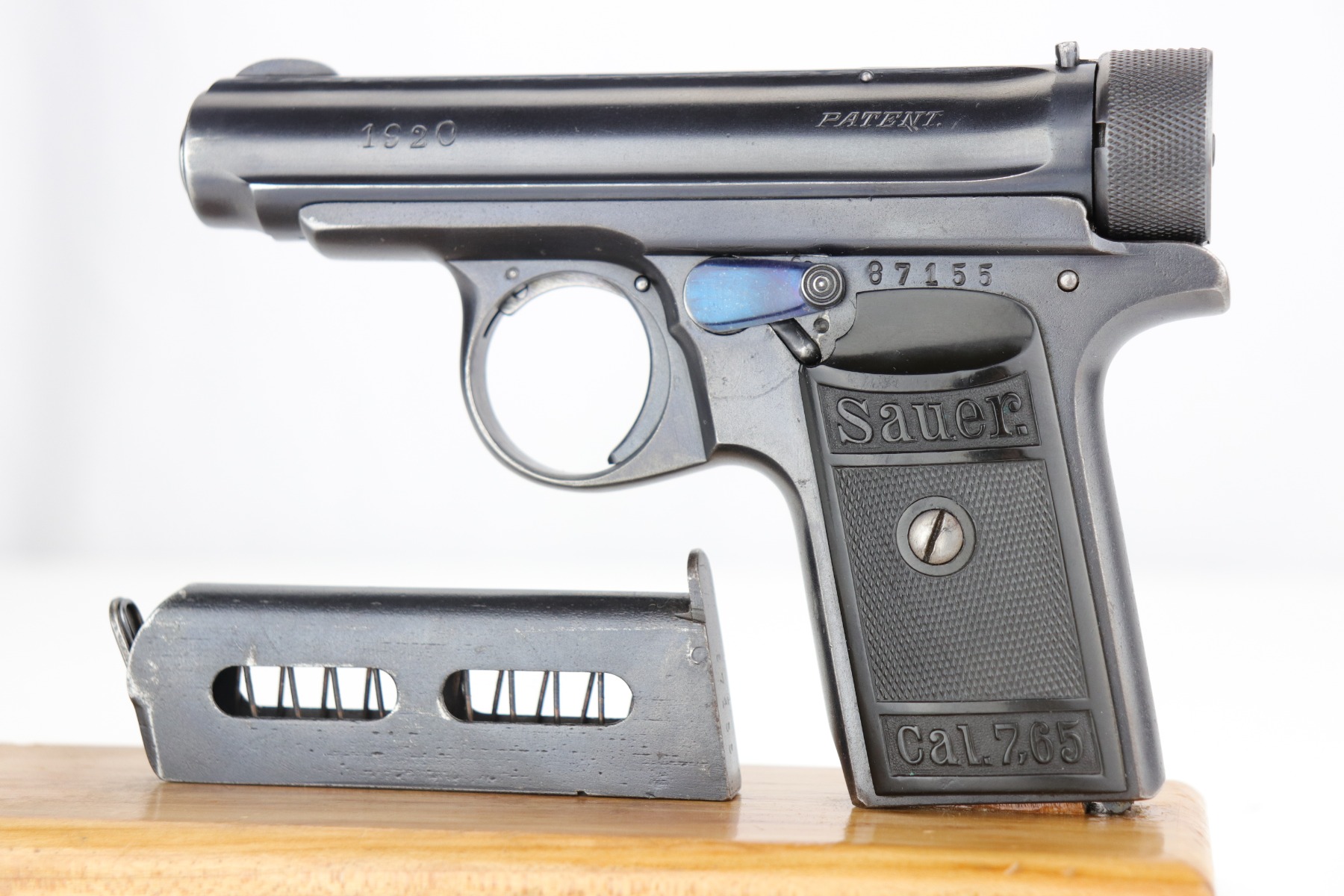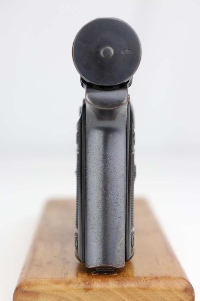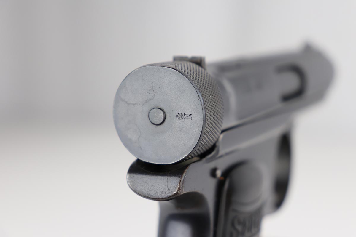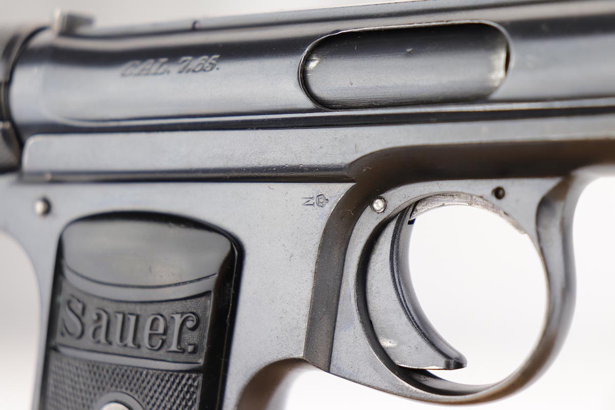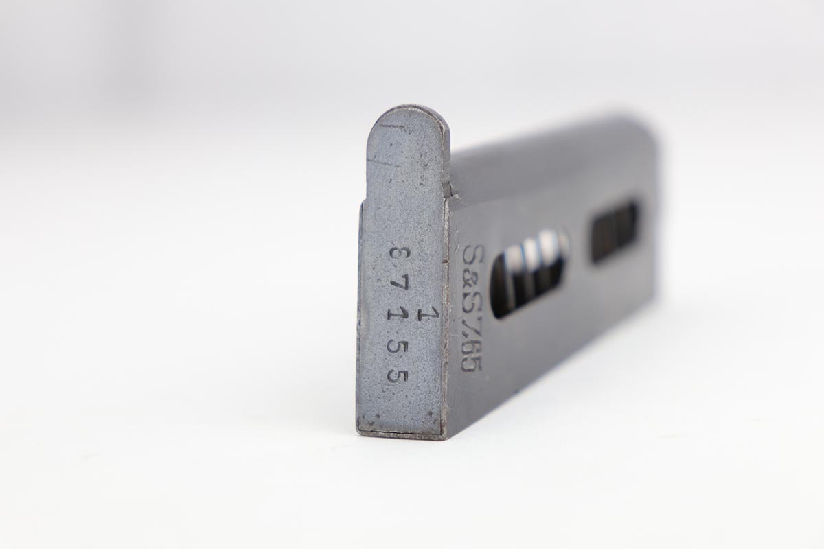 1/28/20 – This is an excellent Sauer M1913 that was likely Police issued following World War I given the 1920 proof on slide and matching numbered magazine. The bluing rates at about 98% with a bit of high edge wear on the left side, and a little more on the front strap/trigger guard. Crown/N proofs and very nice grips. Strong, shiny bore.