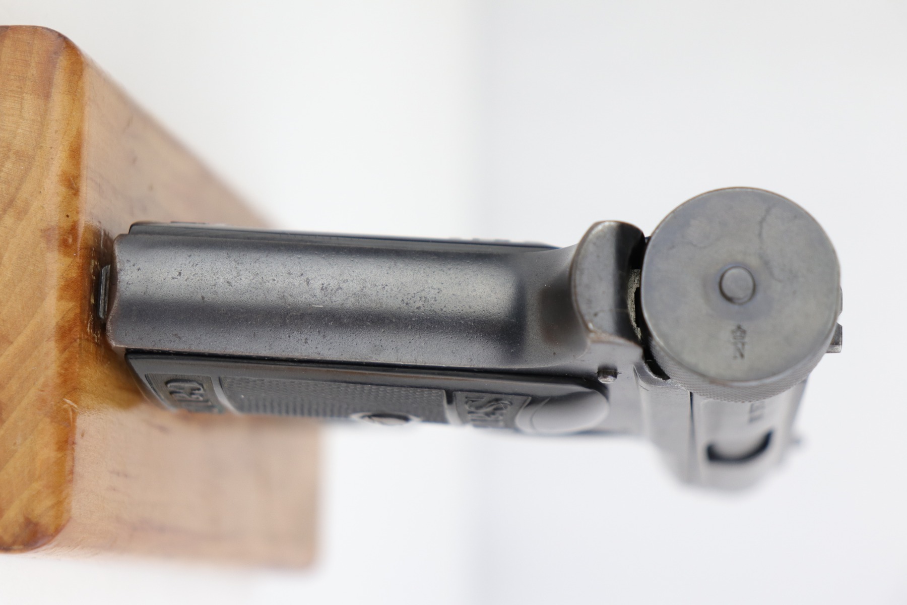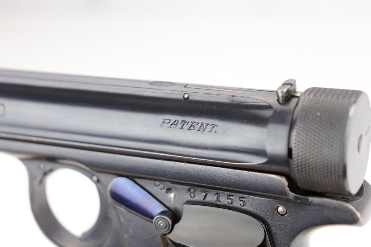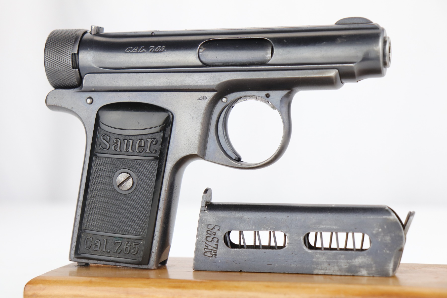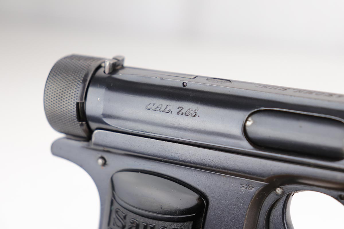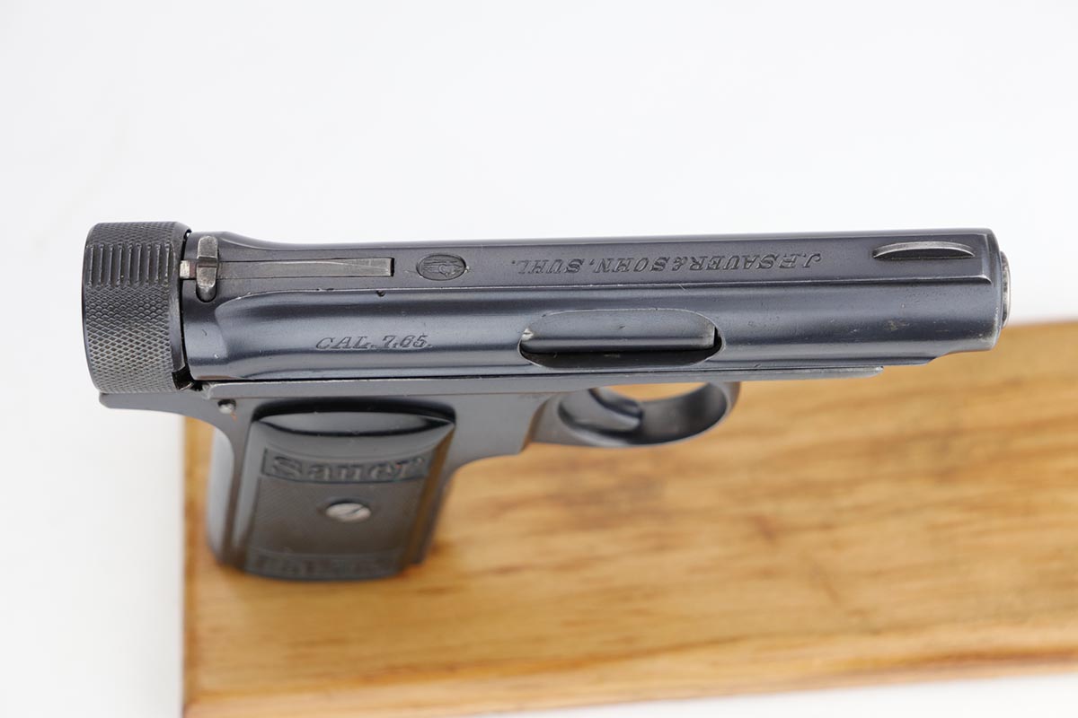 1/28/20 – This is an excellent Sauer M1913 that was likely Police issued following World War I given the 1920 proof on slide and matching numbered magazine. The bluing rates at about 98% with a bit of high edge wear on the left side, and a little more on the front strap/trigger guard. Crown/N proofs and very nice grips. Strong, shiny bore.