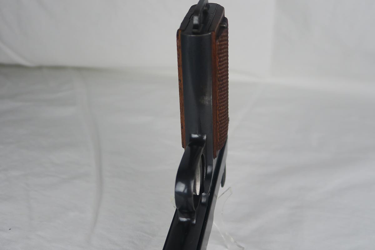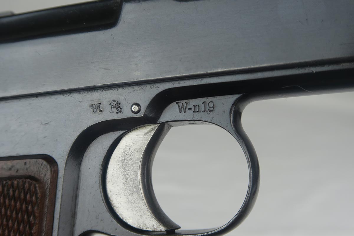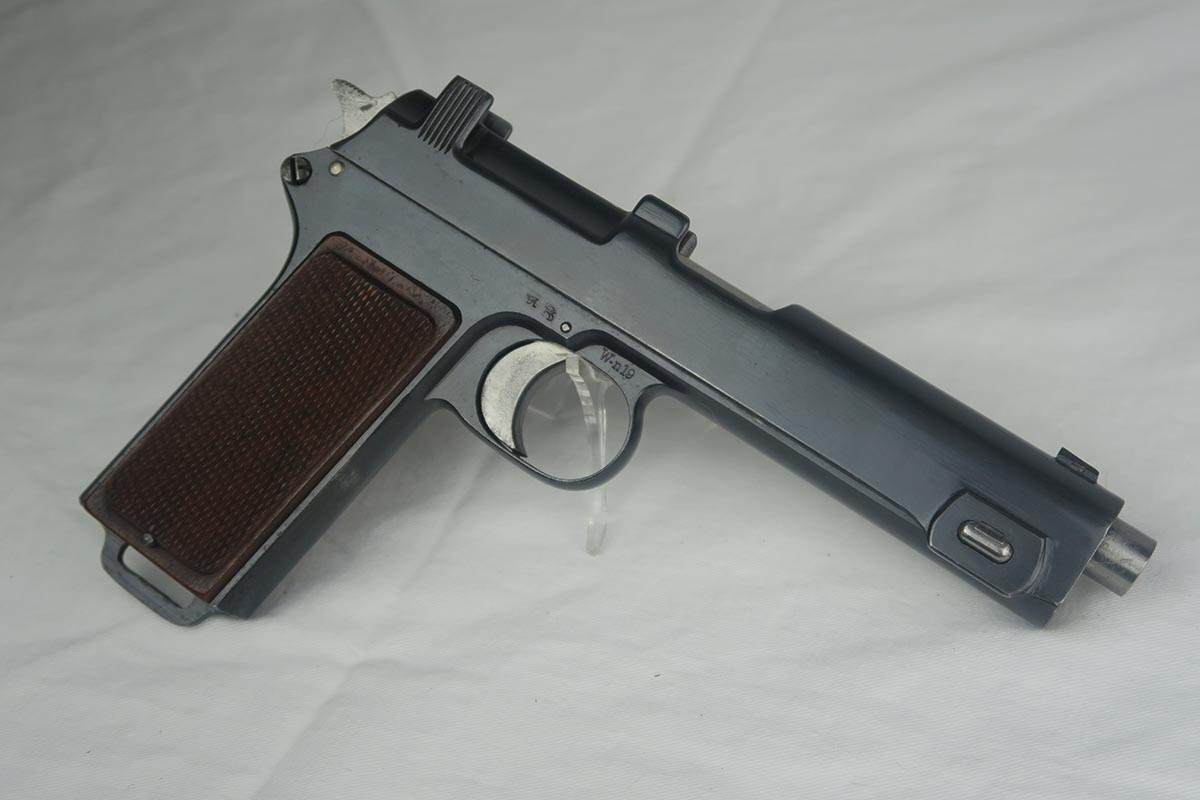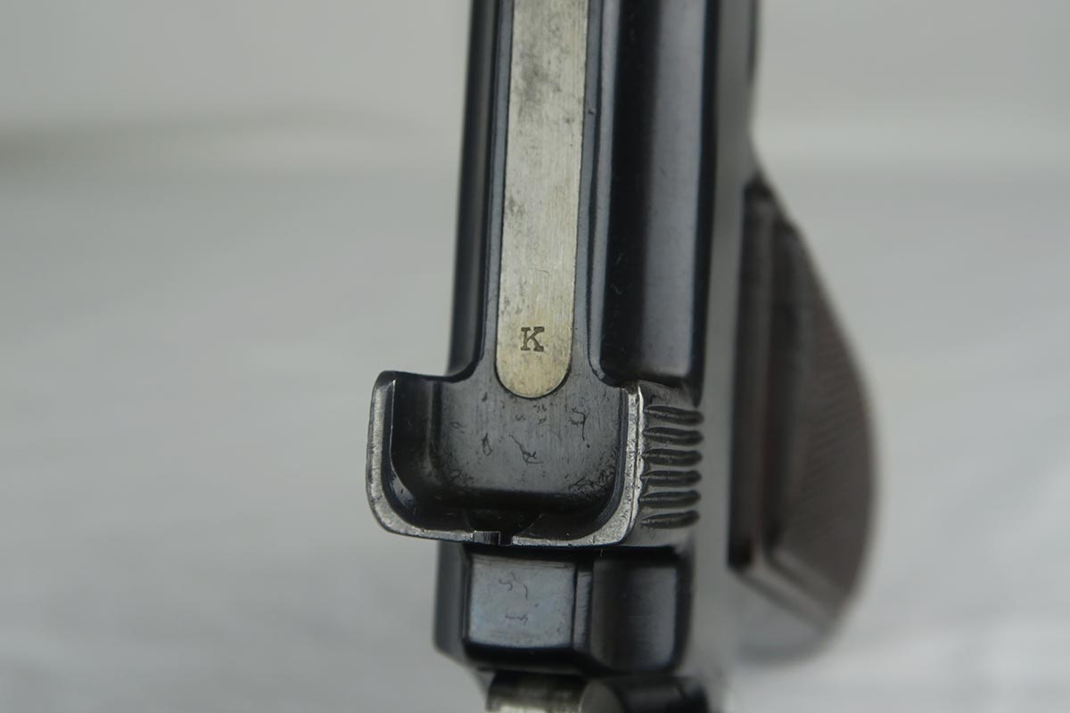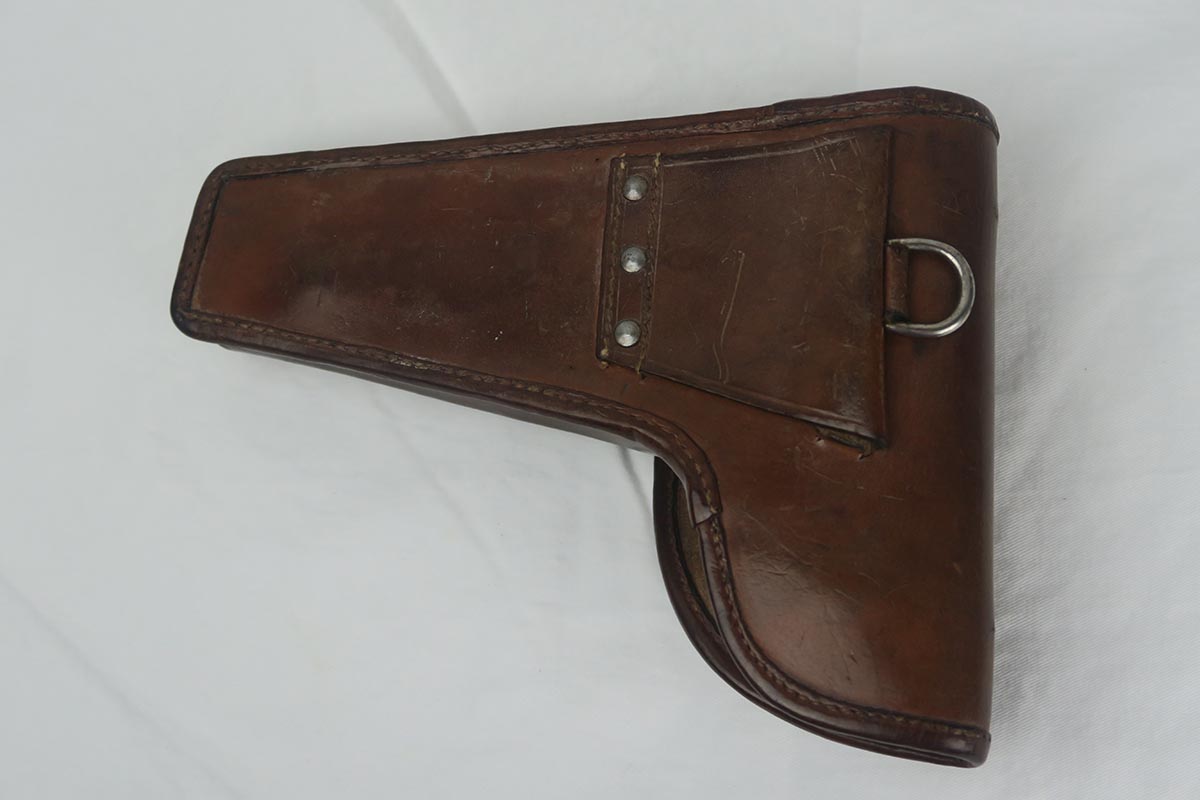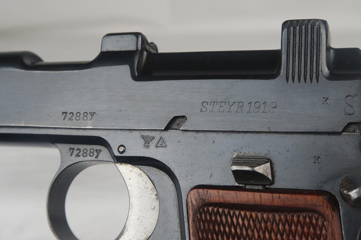 8/10/17 – This is an excellent Steyr Hahn 1912 that was reworked by Mauser for use by the German police during WW2.  The Steyr Hahn 1912 was manufactured in Imperial Austria, but after the 1938 German occupation of Austria some were converted to 9mm.  They were stamped ’08’ to indicate this conversion, E/N proofed, and accepted with the German Police Eagle/L.  This pistol is all original and correct with about 98% bluing remaining.  There is minor finish loss near the muzzle and on the front strap.  Mint bore.  Along with this pistol comes a super rare and correct holster for the Steyr 1912.  It is in similarly excellent condition to the pistol.