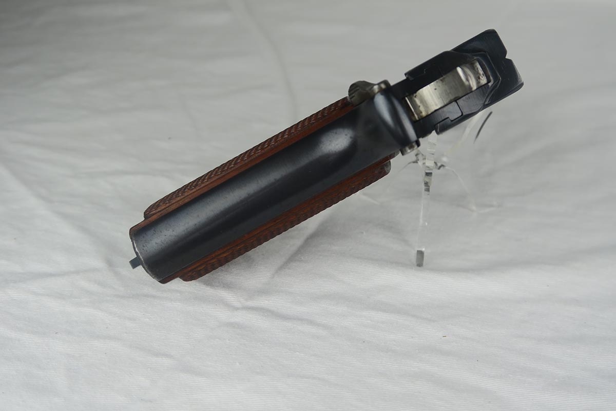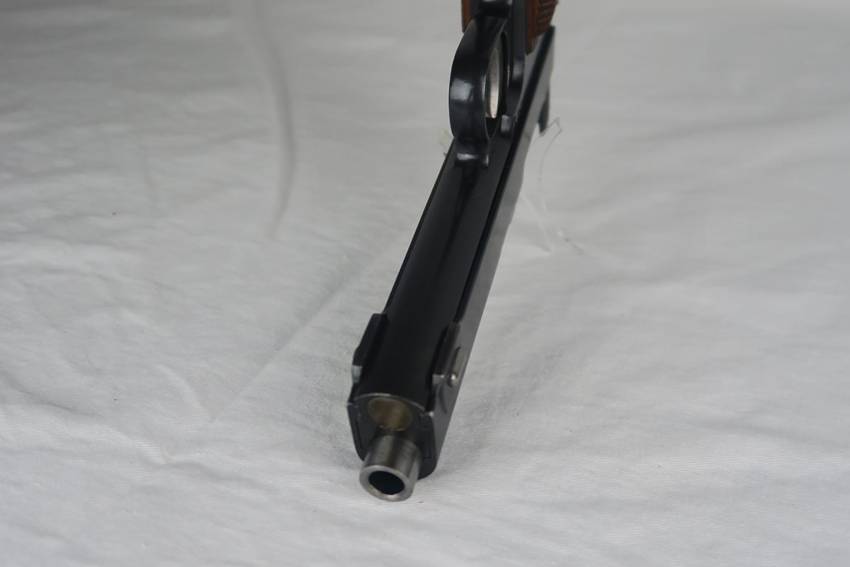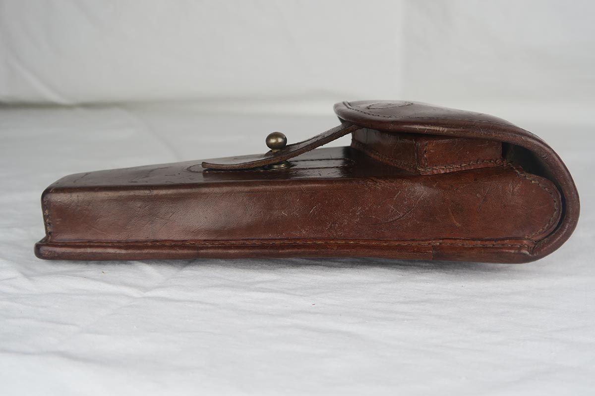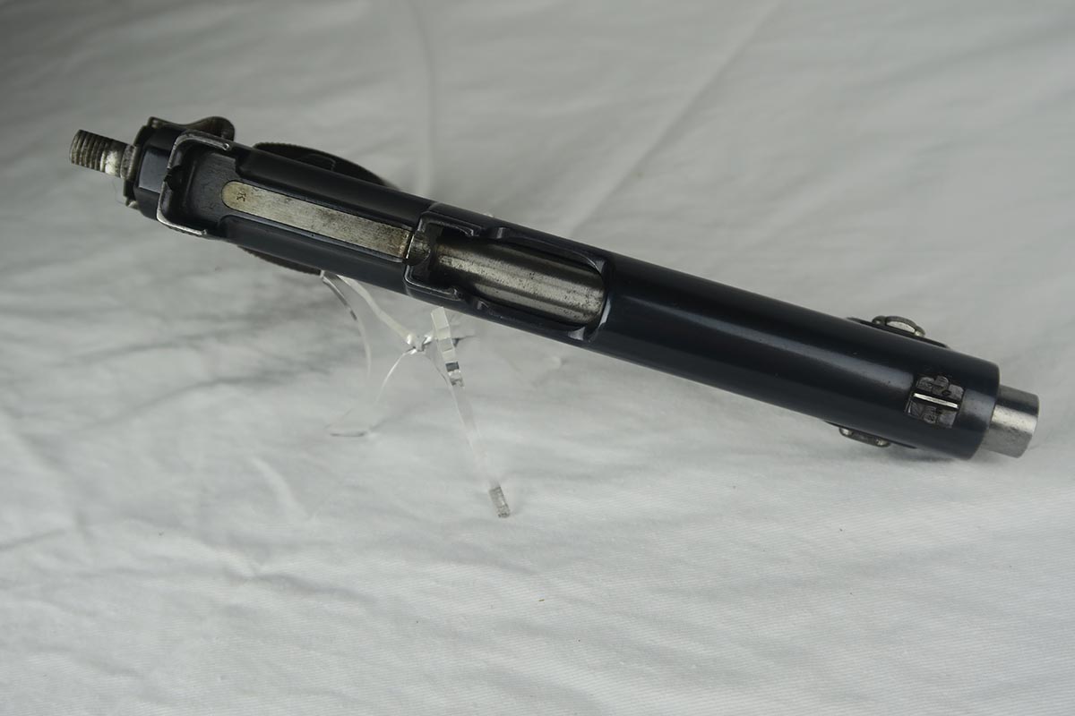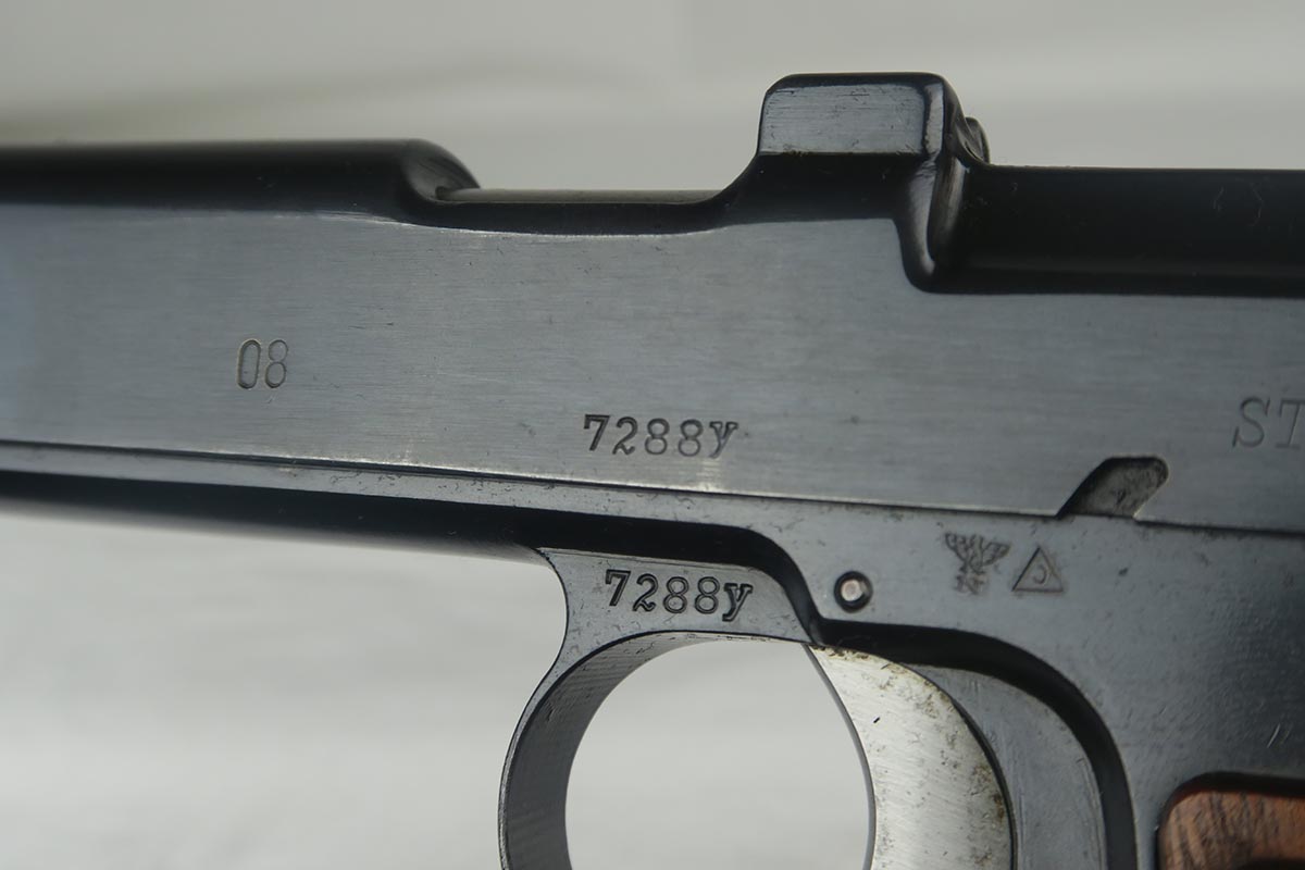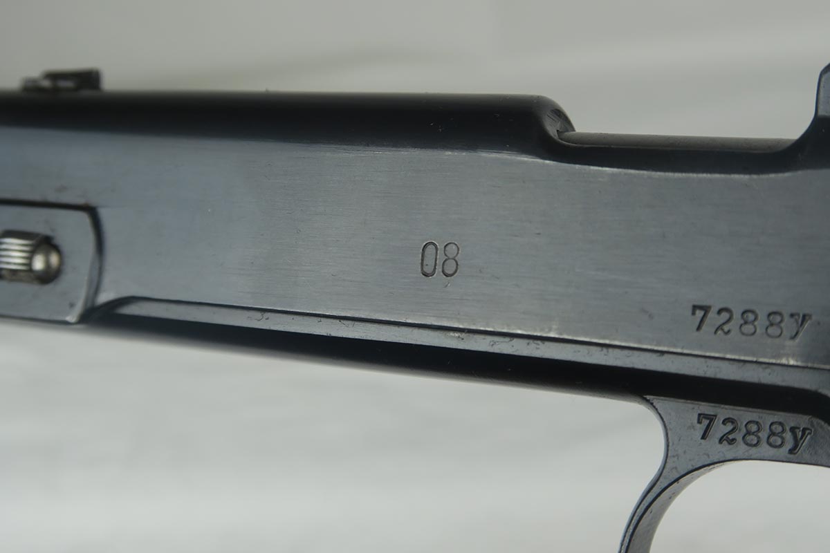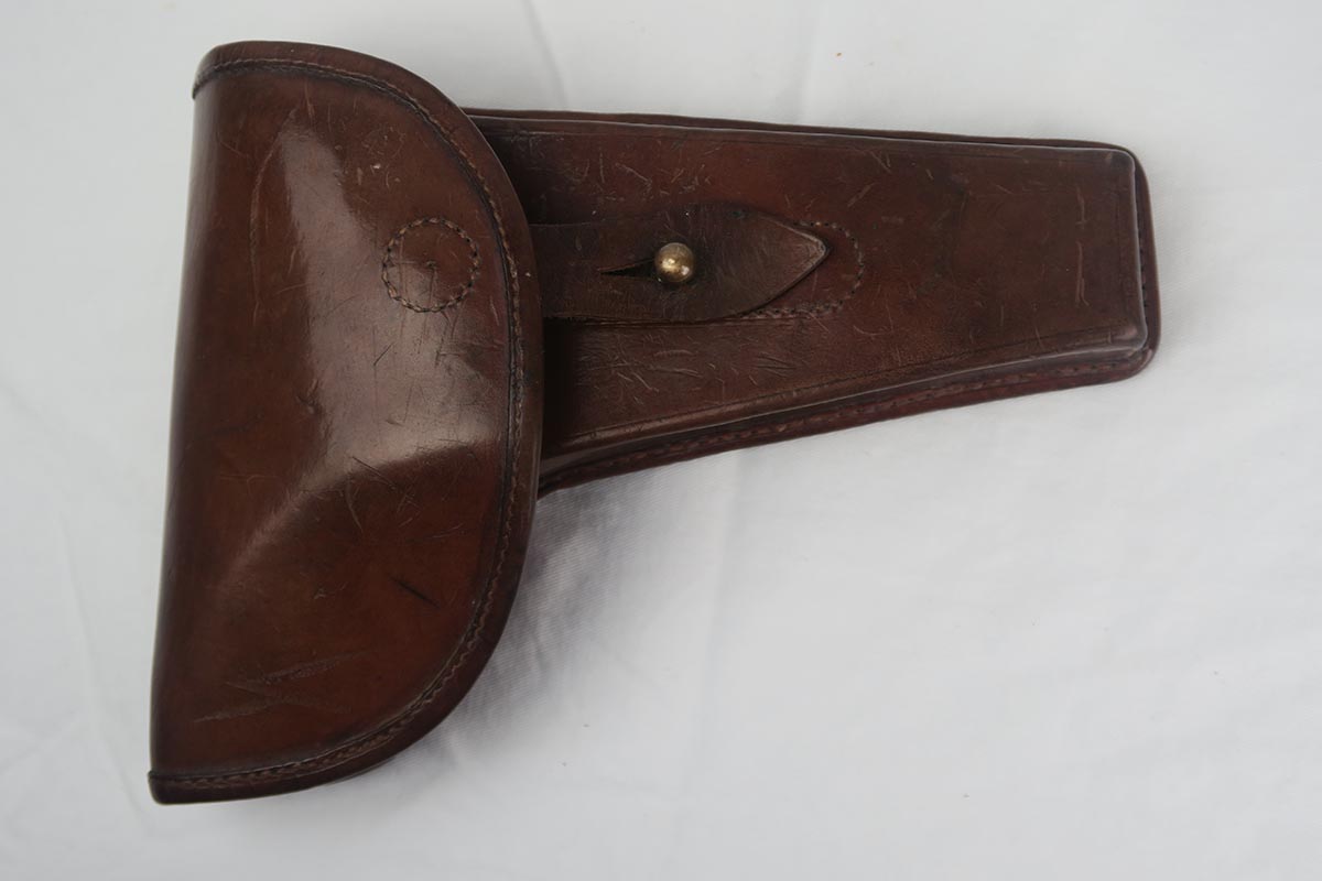 8/10/17 – This is an excellent Steyr Hahn 1912 that was reworked by Mauser for use by the German police during WW2.  The Steyr Hahn 1912 was manufactured in Imperial Austria, but after the 1938 German occupation of Austria some were converted to 9mm.  They were stamped ’08’ to indicate this conversion, E/N proofed, and accepted with the German Police Eagle/L.  This pistol is all original and correct with about 98% bluing remaining.  There is minor finish loss near the muzzle and on the front strap.  Mint bore.  Along with this pistol comes a super rare and correct holster for the Steyr 1912.  It is in similarly excellent condition to the pistol.