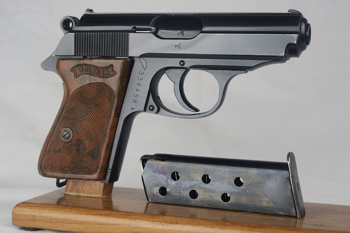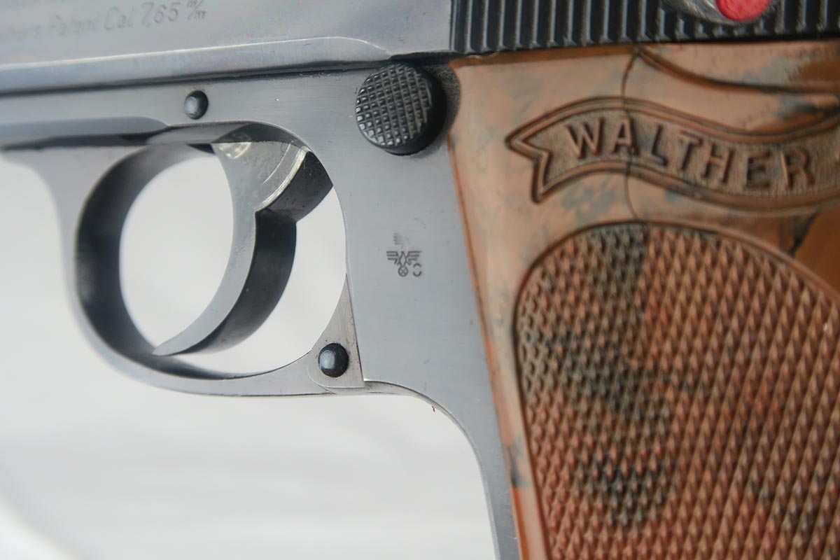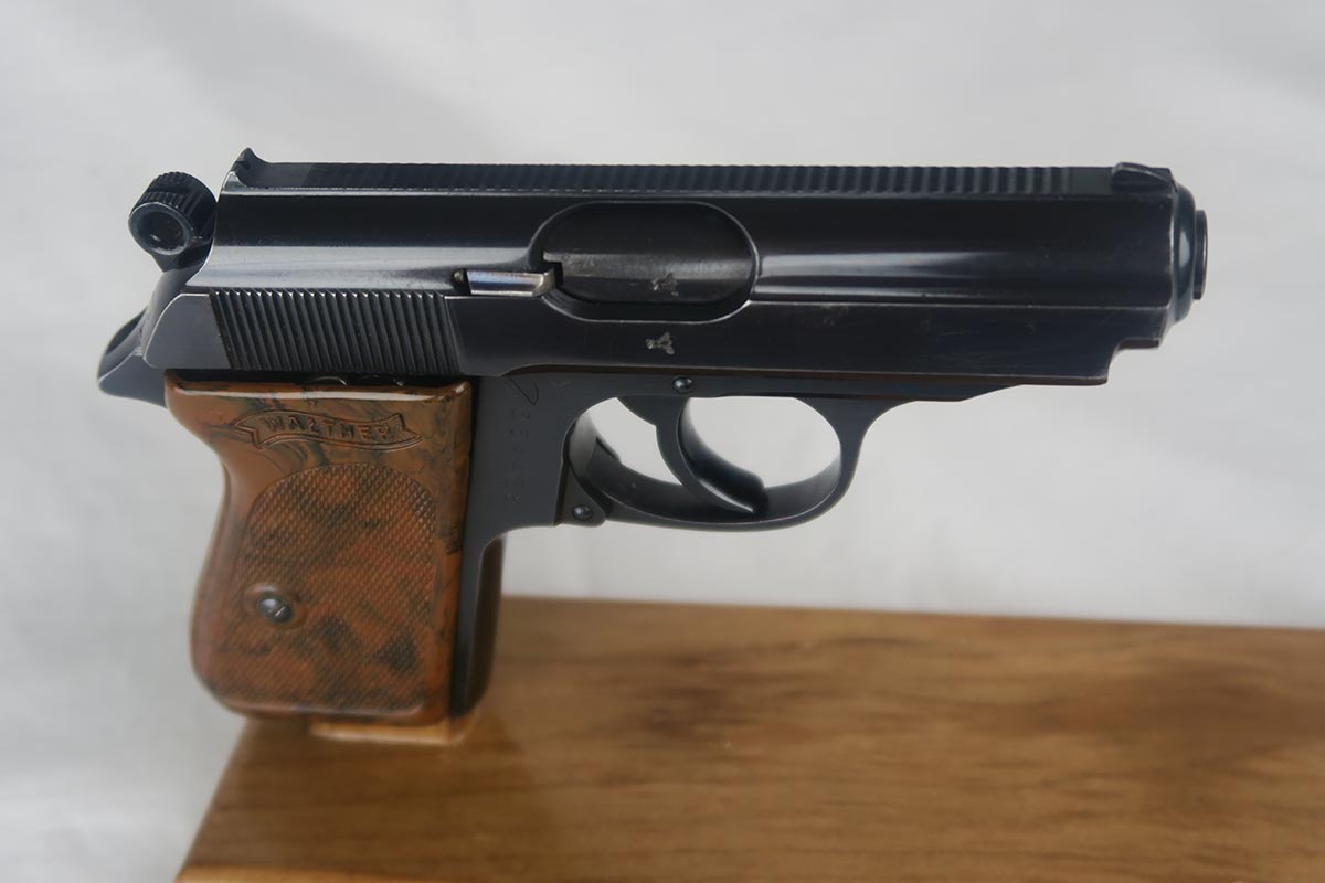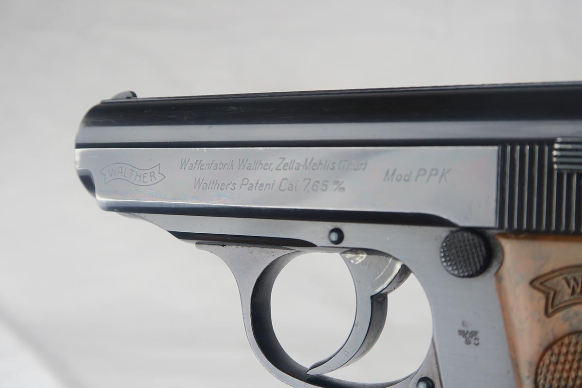 7/9/18  – This is an excellent and original Walther PPK that was issued to the German Police during the war.  The high-polish blue rates around 98% with nearly all finish loss found on either side of the muzzle.  Eagle/N proofs on slide and frame.  Flat-bottom Walther banner magazine.  The grip does have a small crack on the left side.  Minty bore.