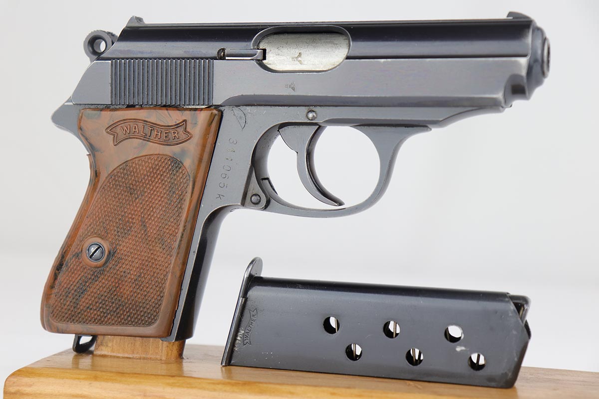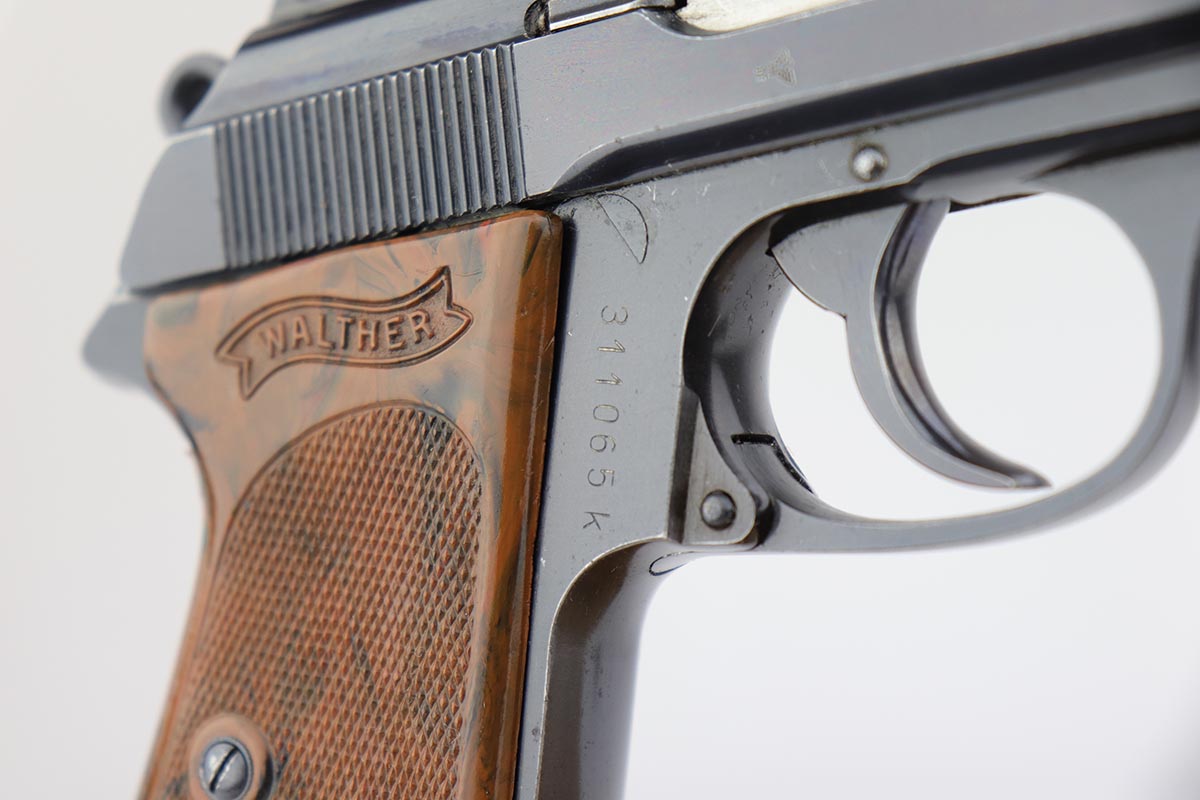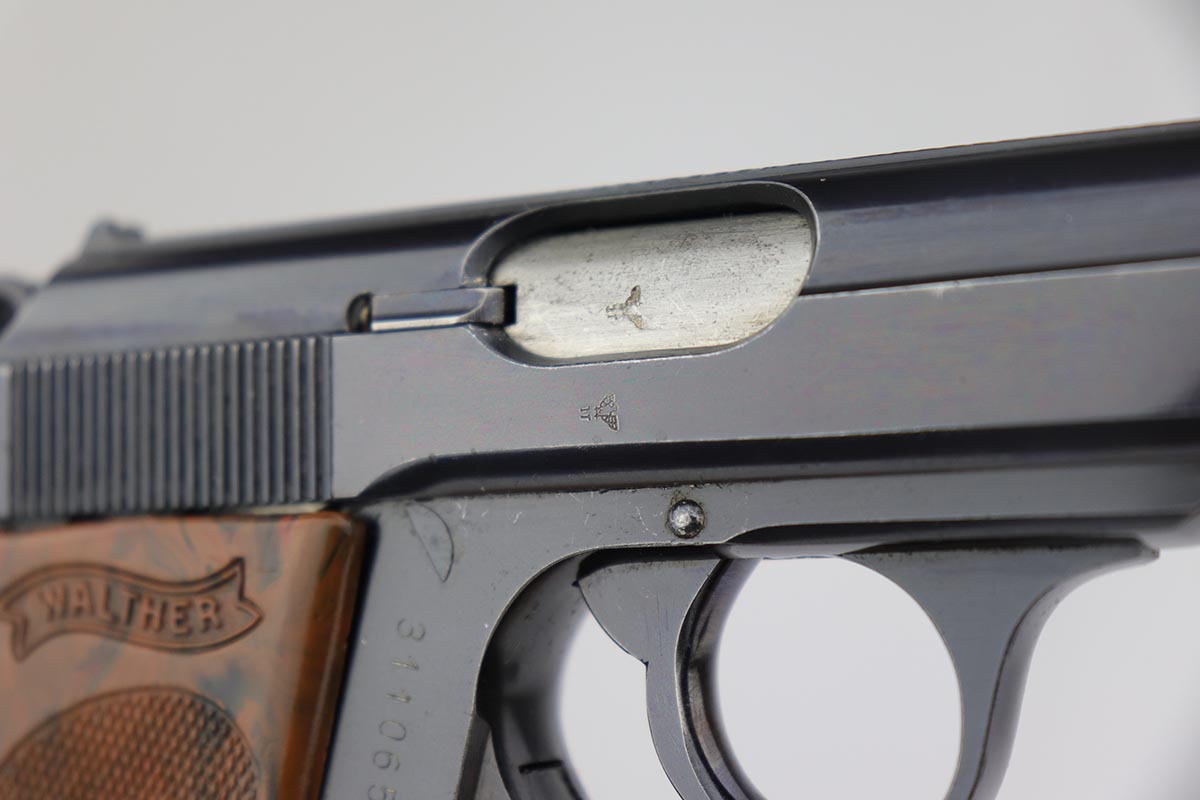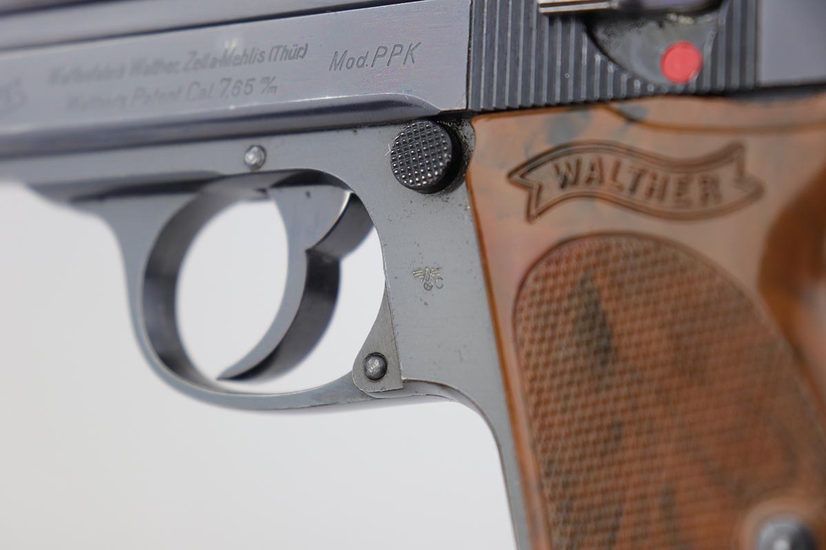 4/19/19 – This is an excellent example of a high-polish, Police marked Walther PPK. The original finish is about 98% with just a little muzzle wear. Also, this is one of the early Eagle/N proofed guns. Most likely made around 1940. The proper brown grip is also excellent, with no crack or chips and almost no warping. The gun is mechanically sound and the bore is mirror!