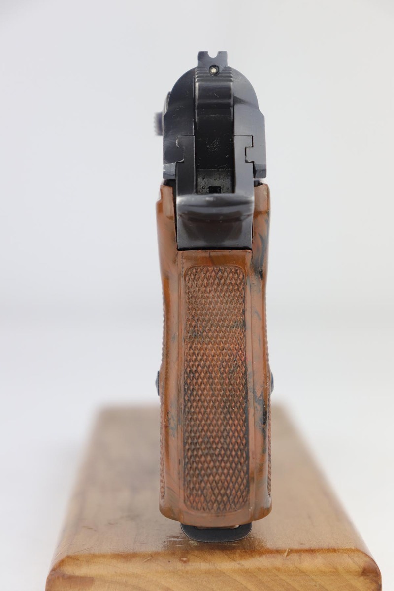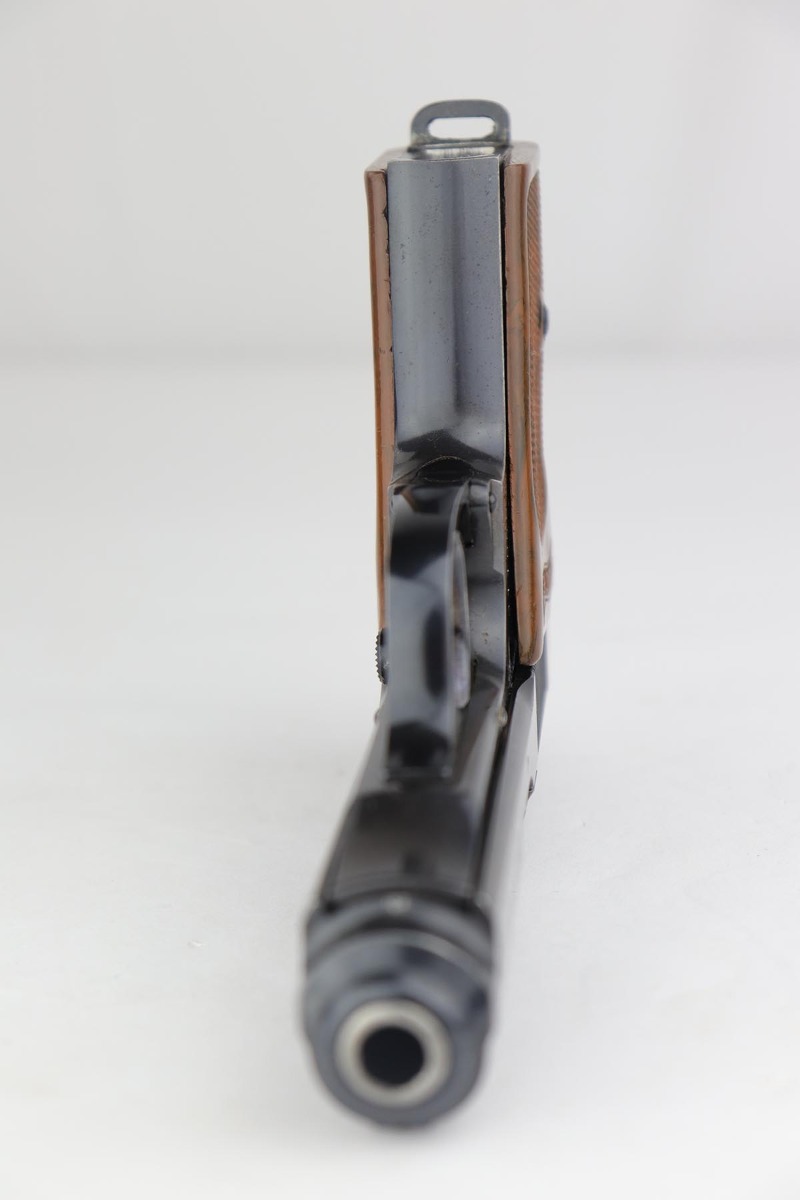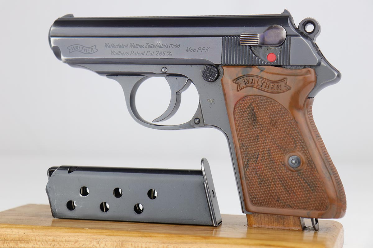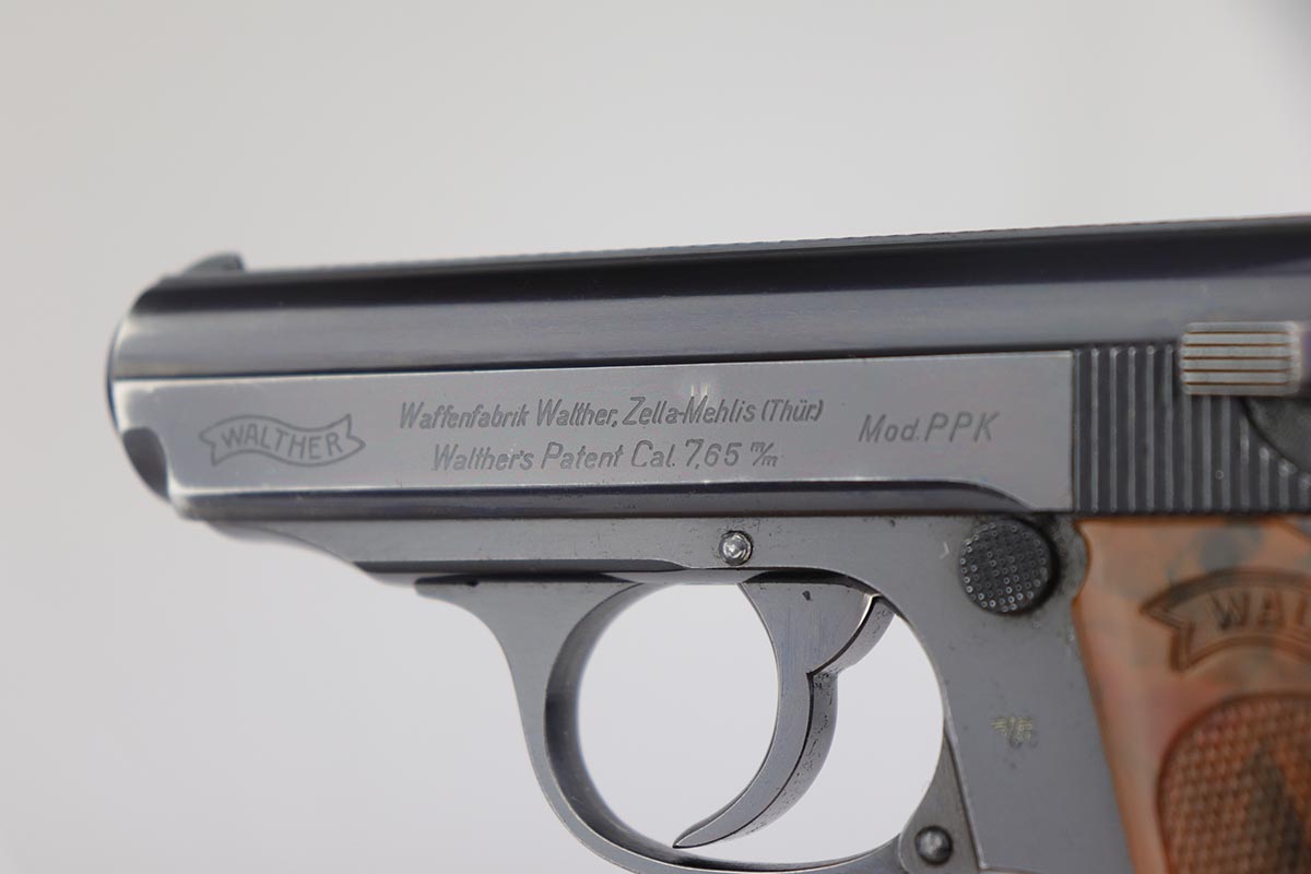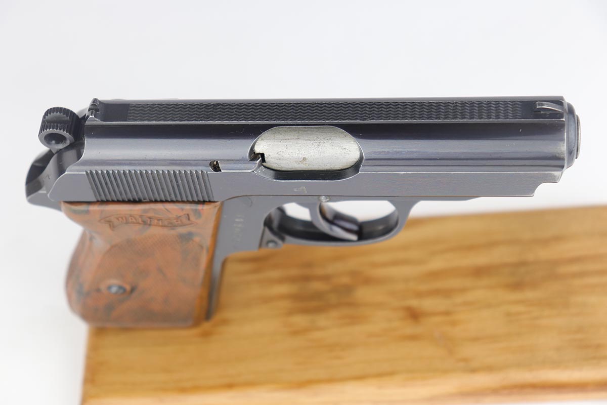 4/19/19 – This is an excellent example of a high-polish, Police marked Walther PPK. The original finish is about 98% with just a little muzzle wear. Also, this is one of the early Eagle/N proofed guns. Most likely made around 1940. The proper brown grip is also excellent, with no crack or chips and almost no warping. The gun is mechanically sound and the bore is mirror!