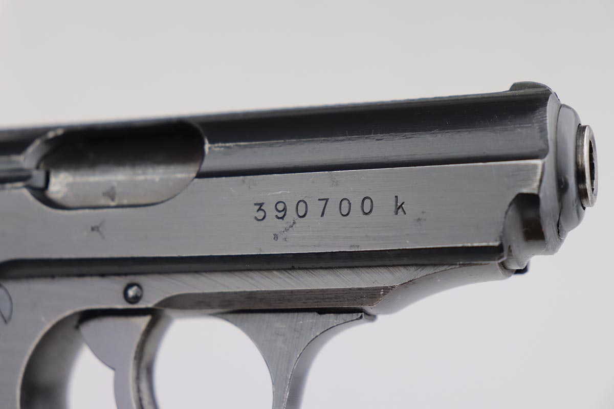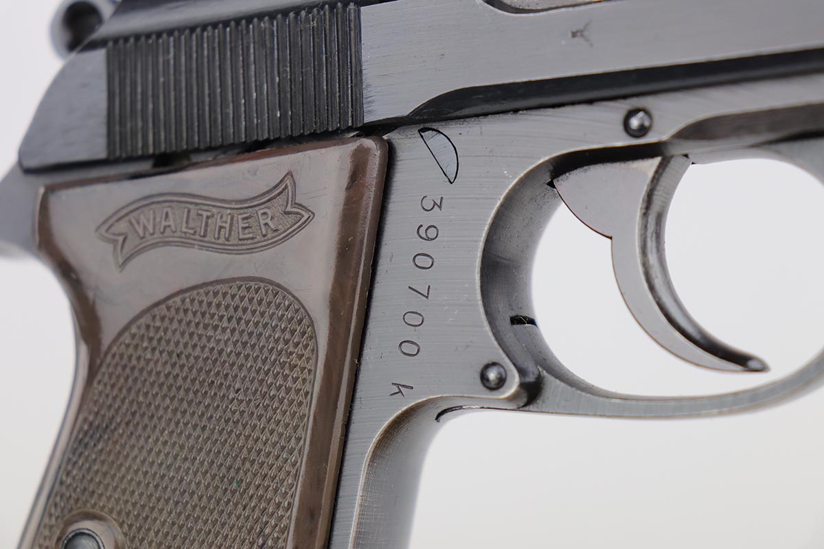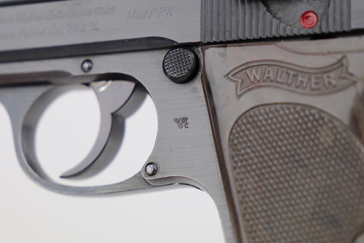 8/7/19 – This is an excellent Walther PPK that was made in late 1942 or early 1943, with Police issue marking. The military blue rates at 97-98% with minor hints of muzzle wear, and some thinning on the front strap. There are also a couple of minor, thin scratches on the left side of the frame. This pistol has the desirable gray grip, though there is a crack in the left side of the grip. Excellent bore. Wartime magazine.