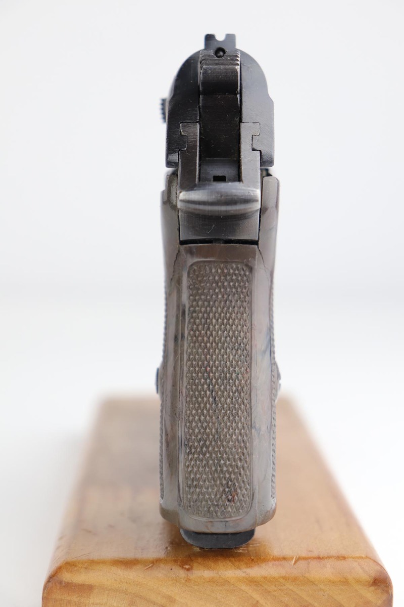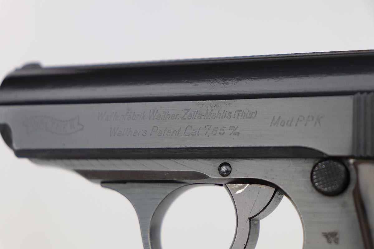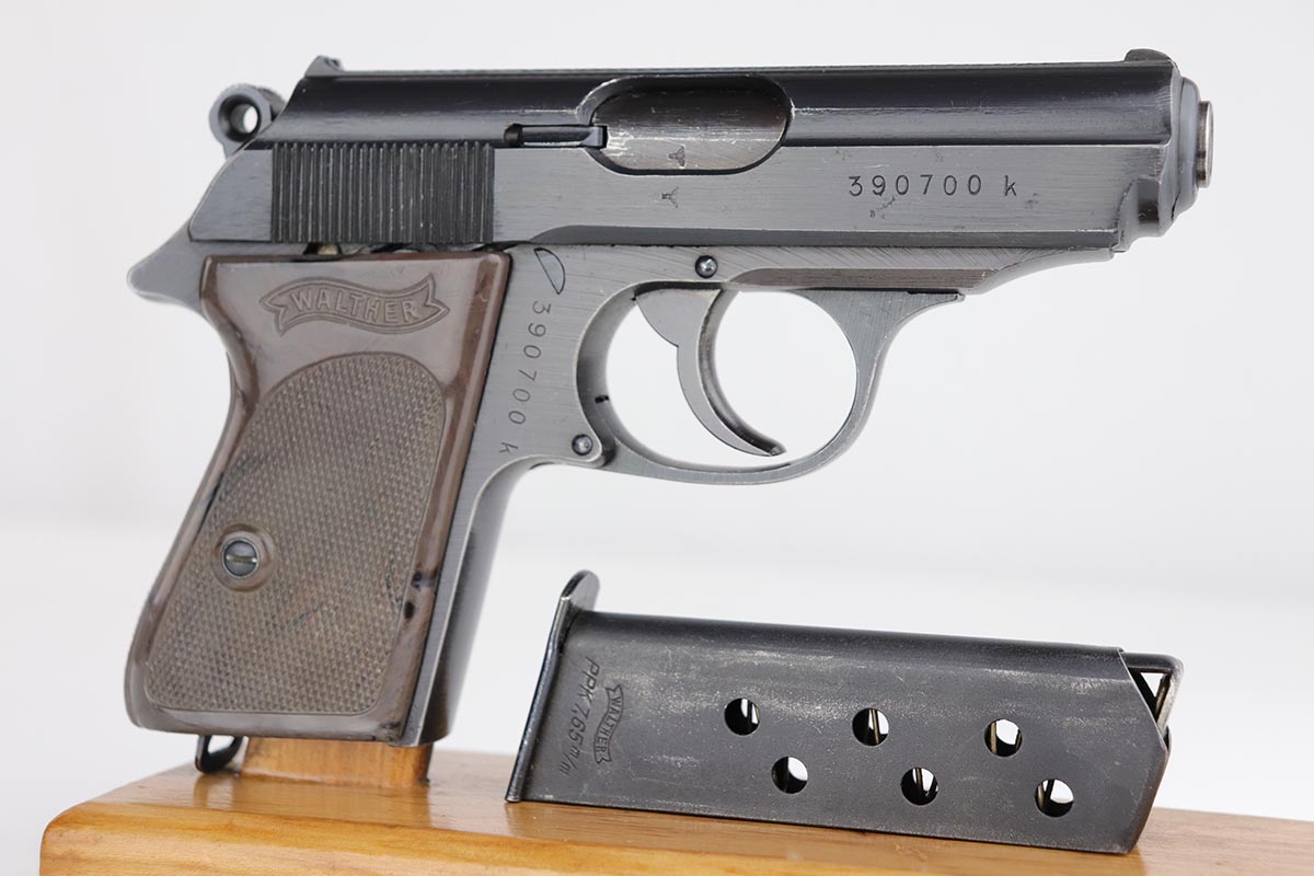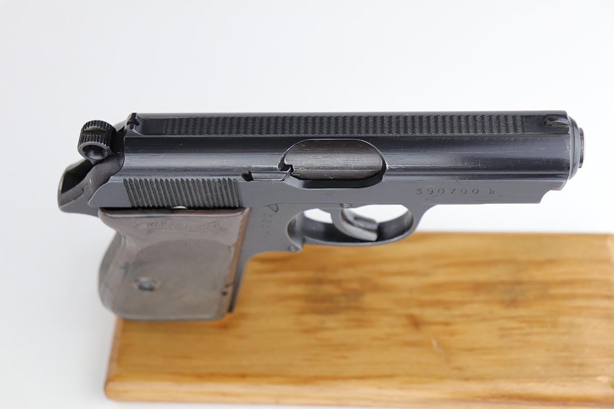 8/7/19 – This is an excellent Walther PPK that was made in late 1942 or early 1943, with Police issue marking. The military blue rates at 97-98% with minor hints of muzzle wear, and some thinning on the front strap. There are also a couple of minor, thin scratches on the left side of the frame. This pistol has the desirable gray grip, though there is a crack in the left side of the grip. Excellent bore. Wartime magazine.