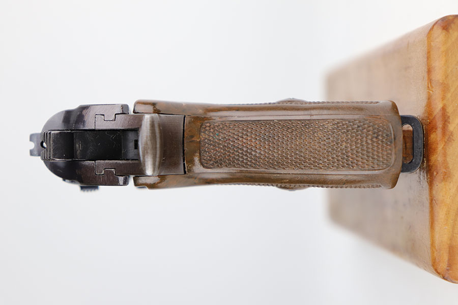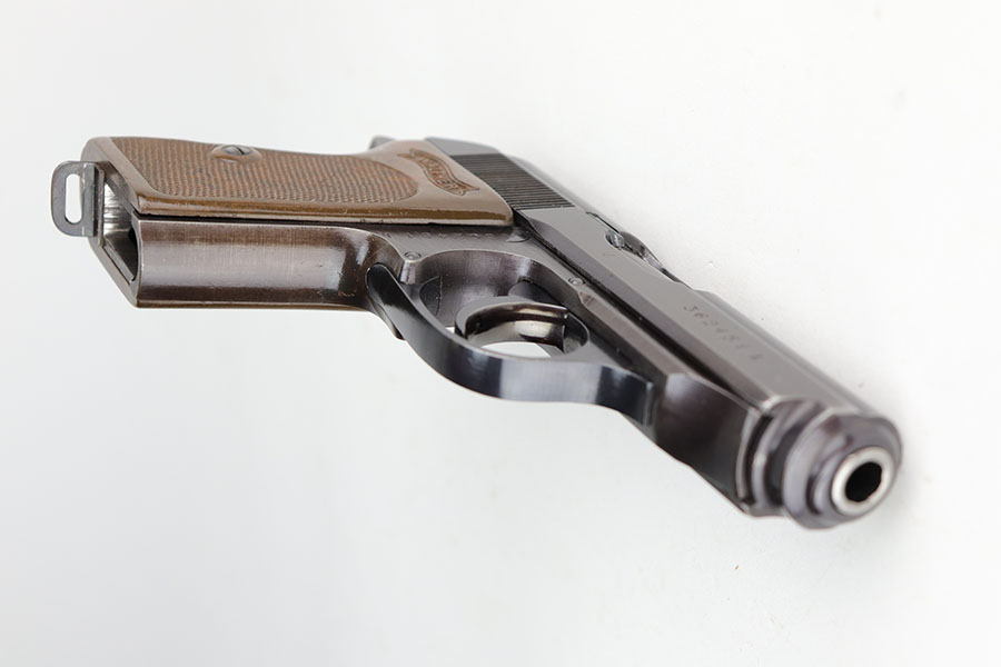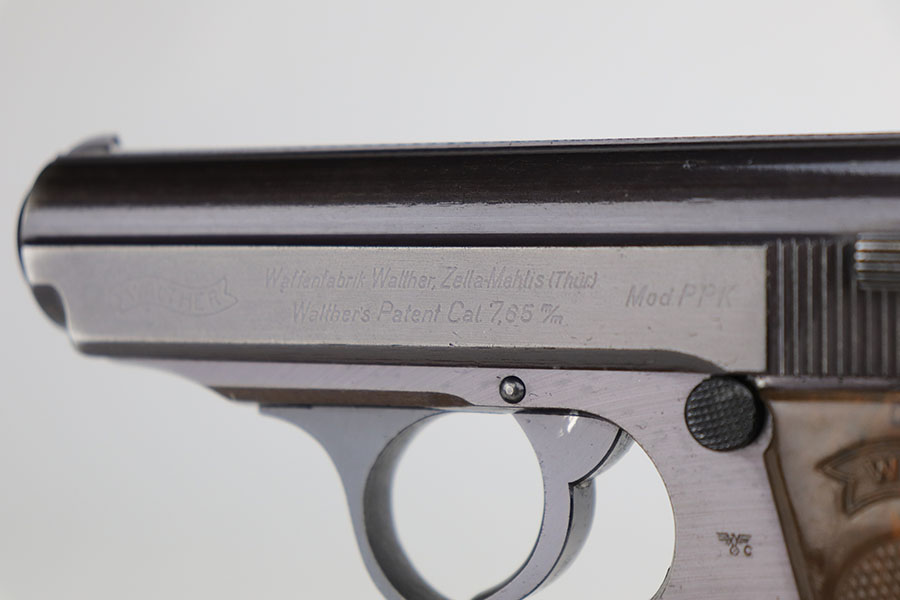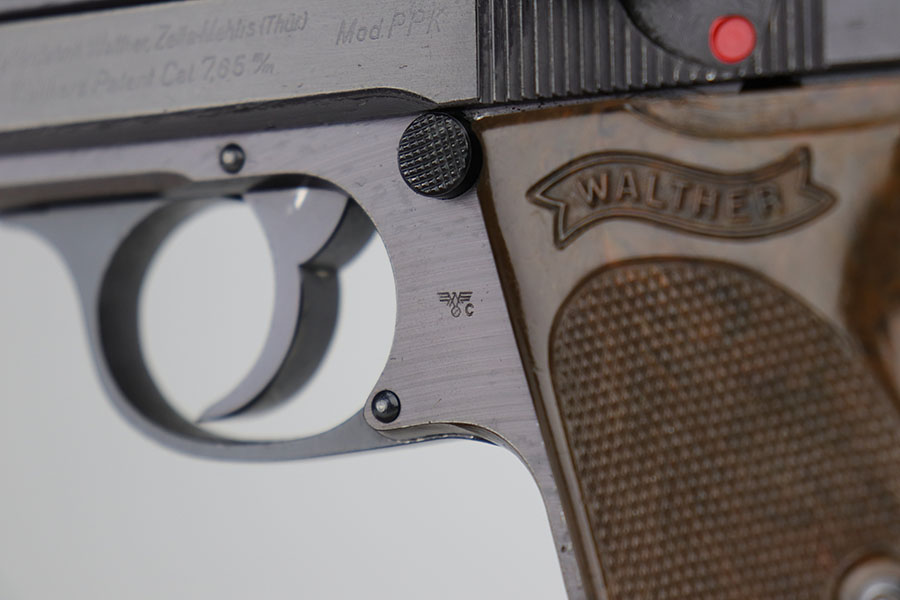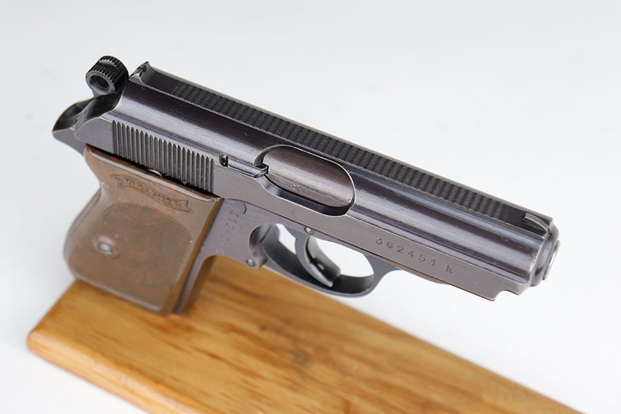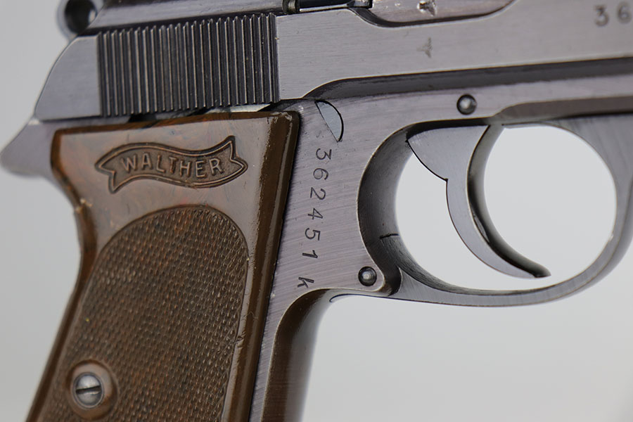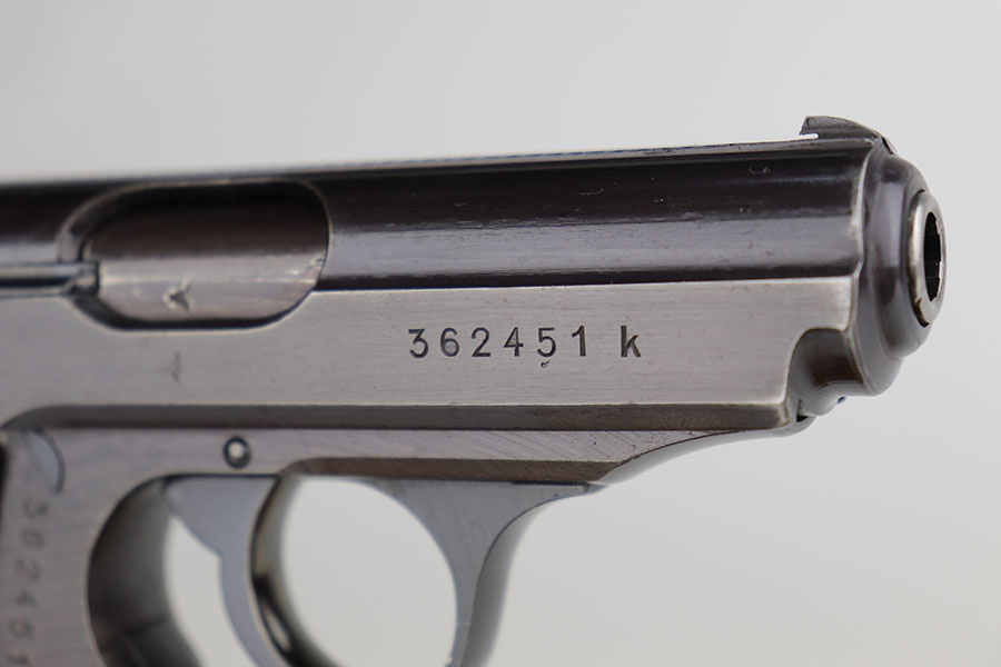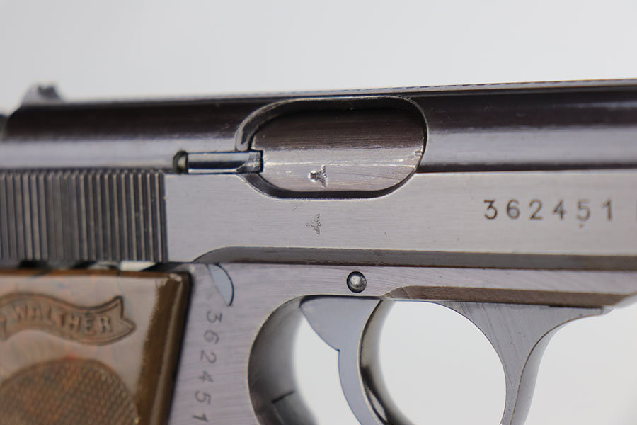 12/8/20 – This is an excellent and original Police Walther PPK from 1942. Matching numbers with about 97% of the original military blue remaining. Minor muzzle wear on either side of the slide, and just a bit of thinning on the front strap. A nice plum hue to the color of the finish, as well. Police Eagle/C proof on frame. Excellent chocolate brown grip with no cracks. Minty bore.