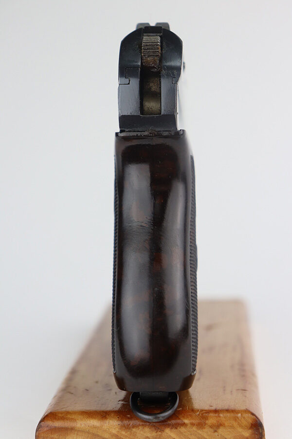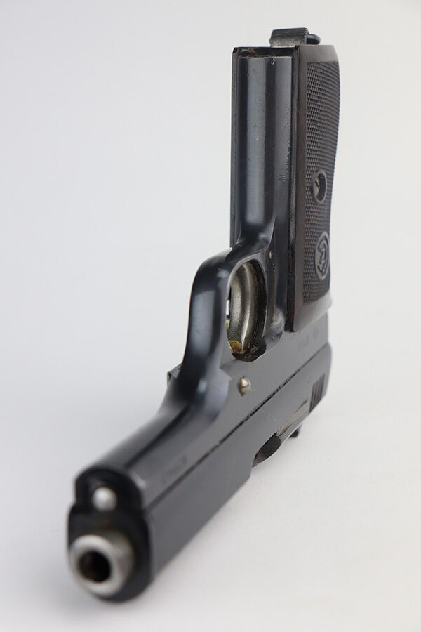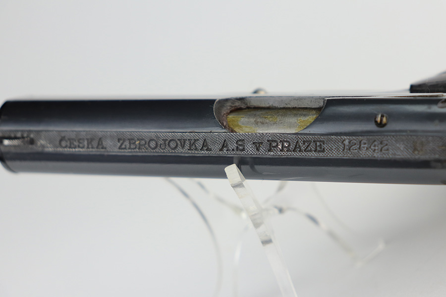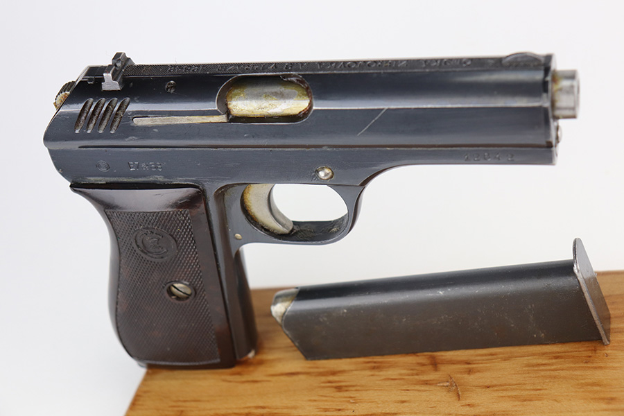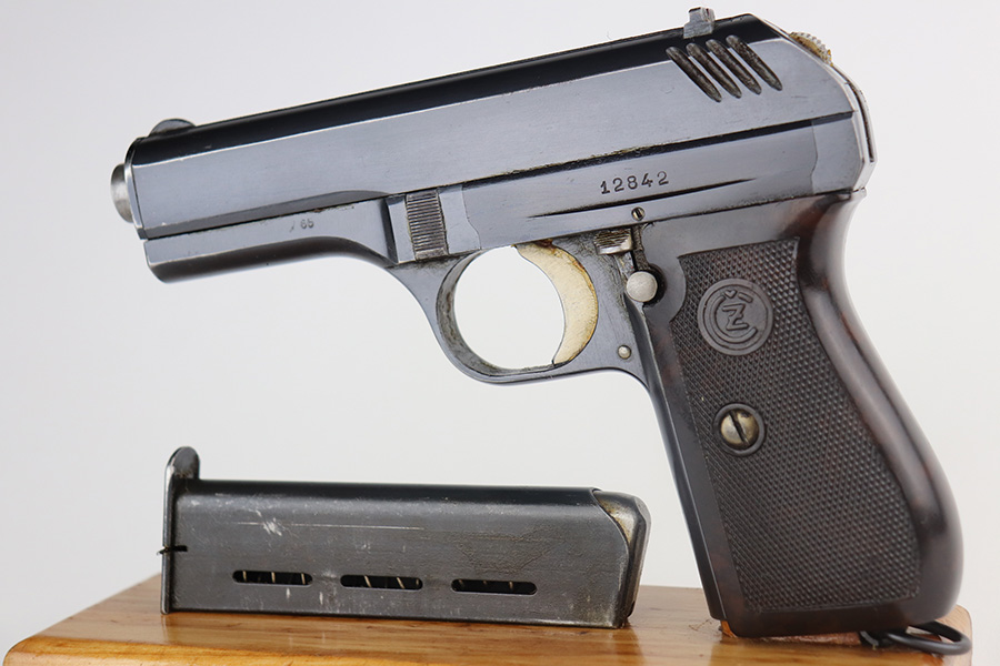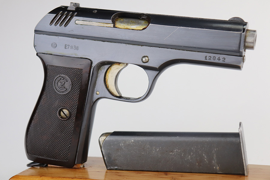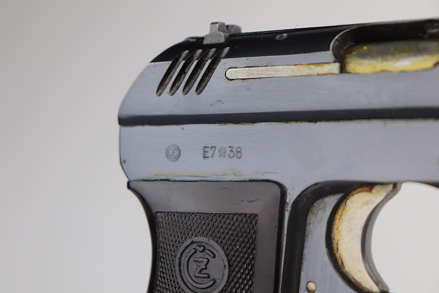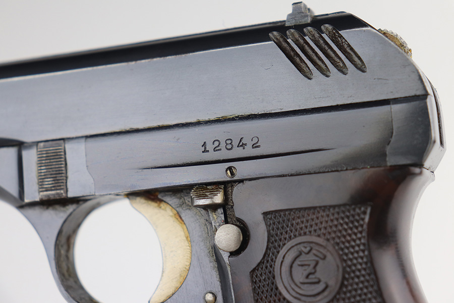 6/2/21 – This is an excellent example of a CZ 27 sold in the commercial market in 1938. It is matching and has the proper Czech proofs. It has retained about 97% of its original high polish finish. There is very minor wear on the high edges of slide and one light scratch on the right side of the slide. Excellent grip – no chips or cracks. Excellent period-correct magazine. Minty bore.