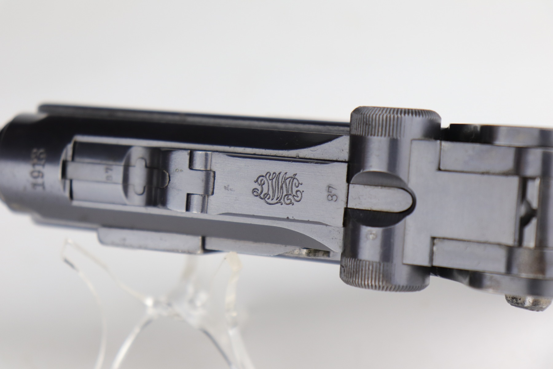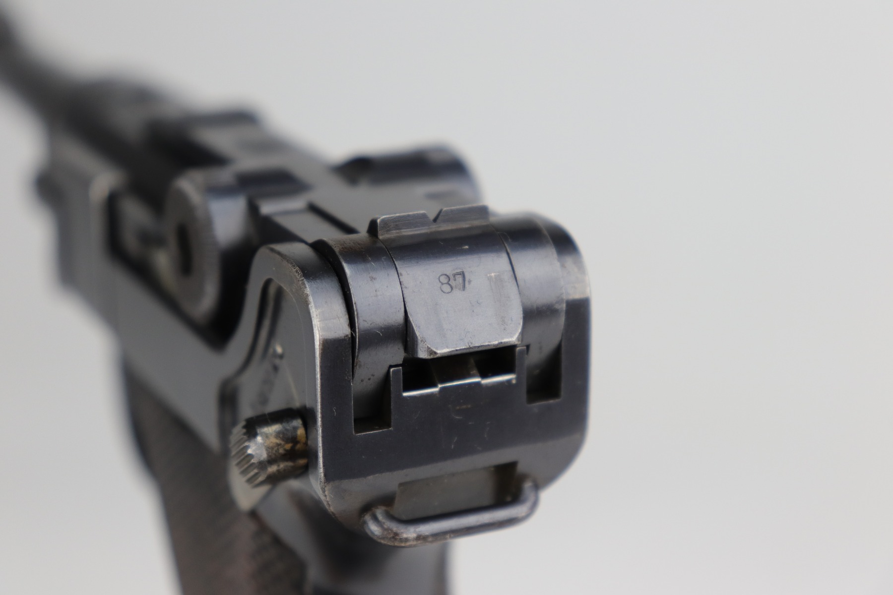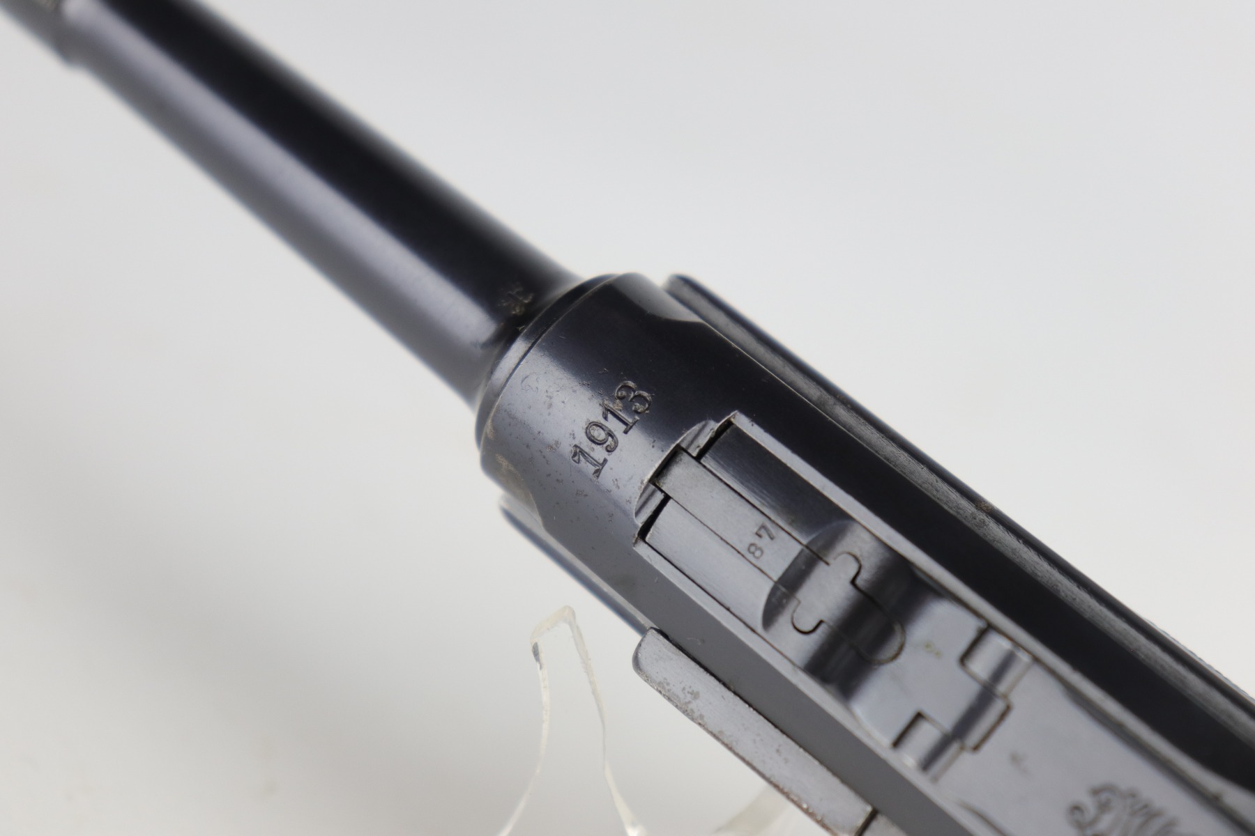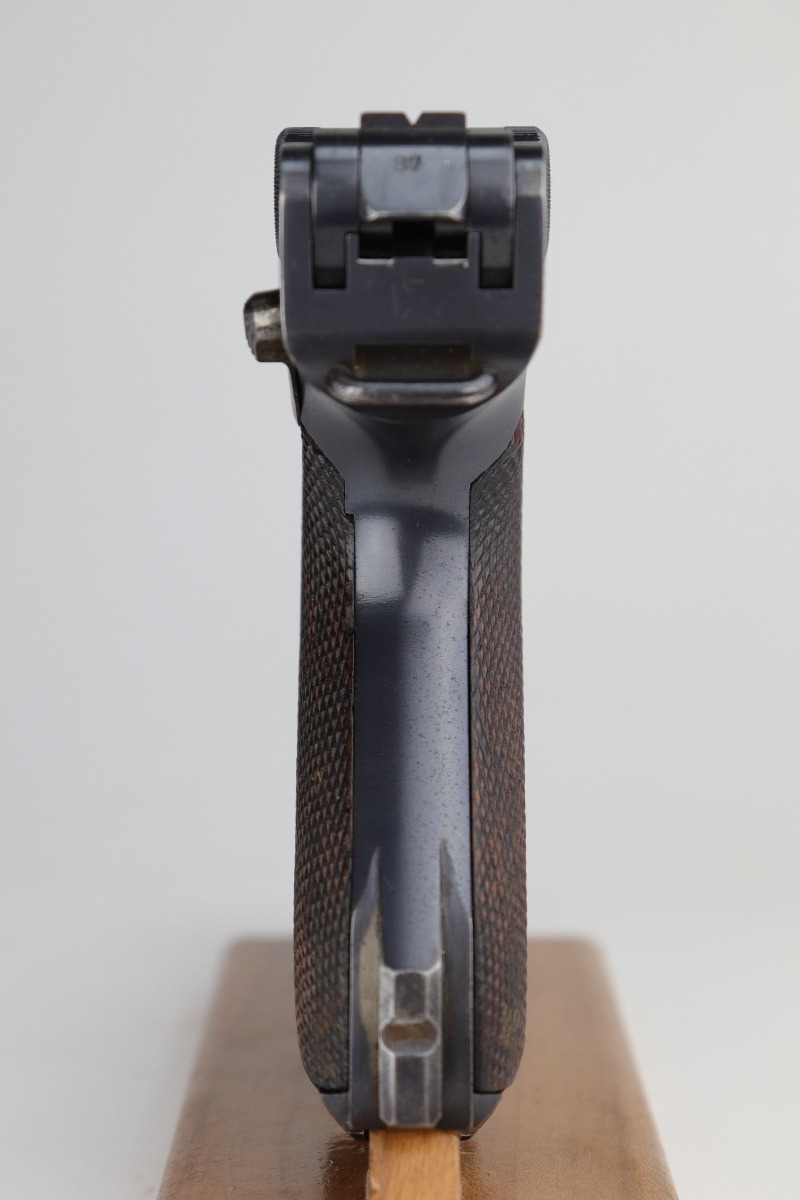 10/30/20 – This is an exceptional example of a WW1 DWM Luger with a rare and desirable 1913 chamber date. It is all matching and has the proper German Imperial military proofs. It has retained about 97% of its original bluing. There is very minor wear around the muzzle, on the side plate, and on the front edges of the frame. There are areas of pin-pricking throughout, most noticeable on the straps. It comes with excellent matching grips – just a chip at the top of the left panel. Also comes with a blank-bottom WW1-era magazine. The bore is excellent – shiny with strong rifling.